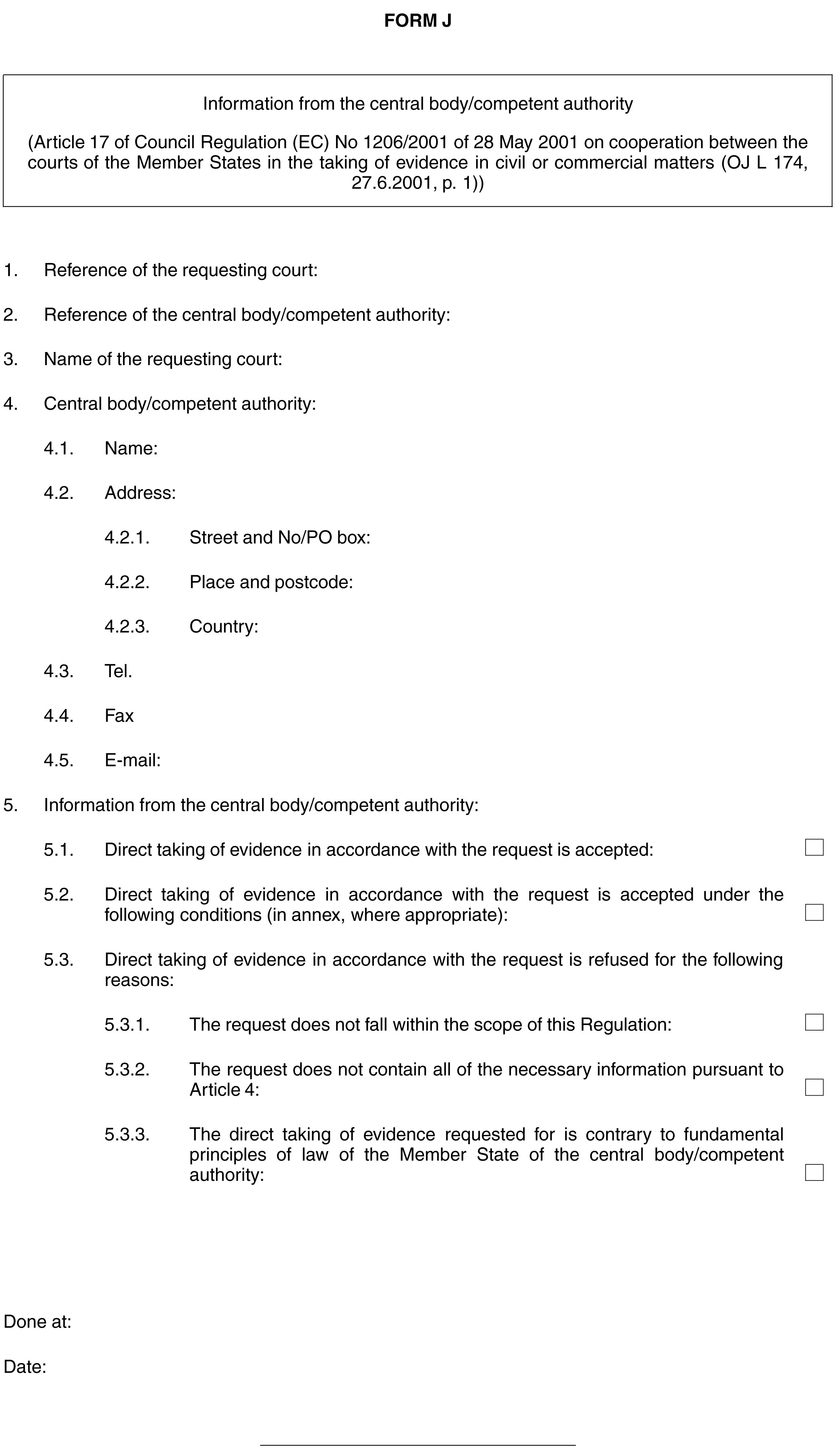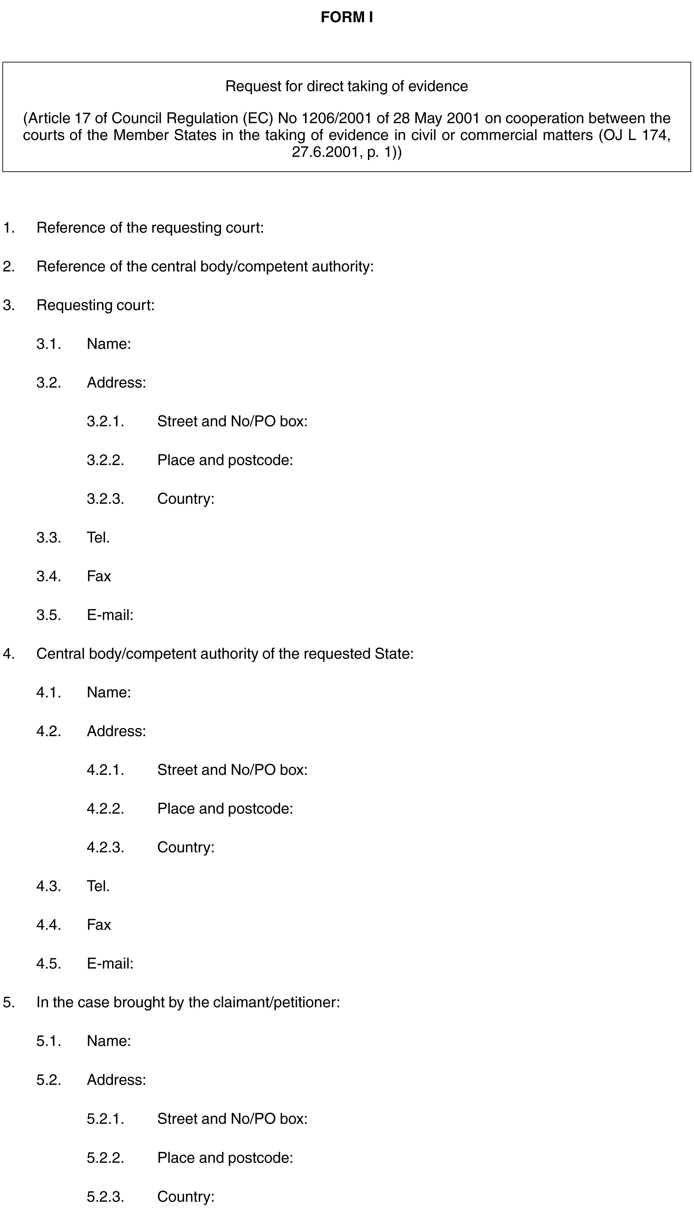 1. Where a court requests to take evidence directly in another Member State, it shall submit a request to the central body or the competent authority referred to in Article 3(3) in that State, using form I in the Annex.
