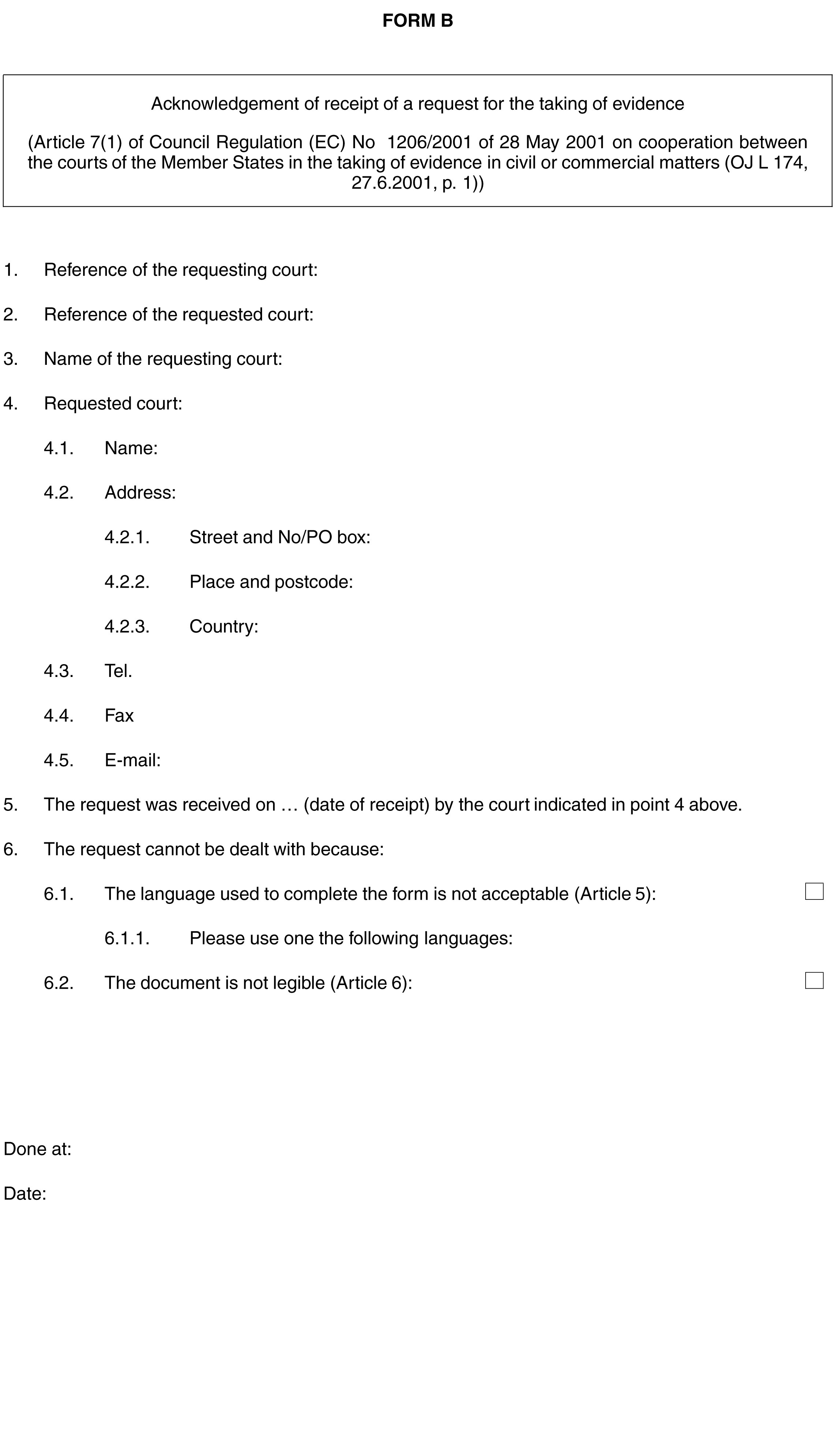 1. Within seven days of receipt of the request, the requested competent court shall send an acknowledgement of receipt to the requesting court using form B in the Annex. Where the request does not comply with the conditions laid down in Articles 5 and 6, the requested court shall enter a note to that effect in the acknowledgement of receipt.