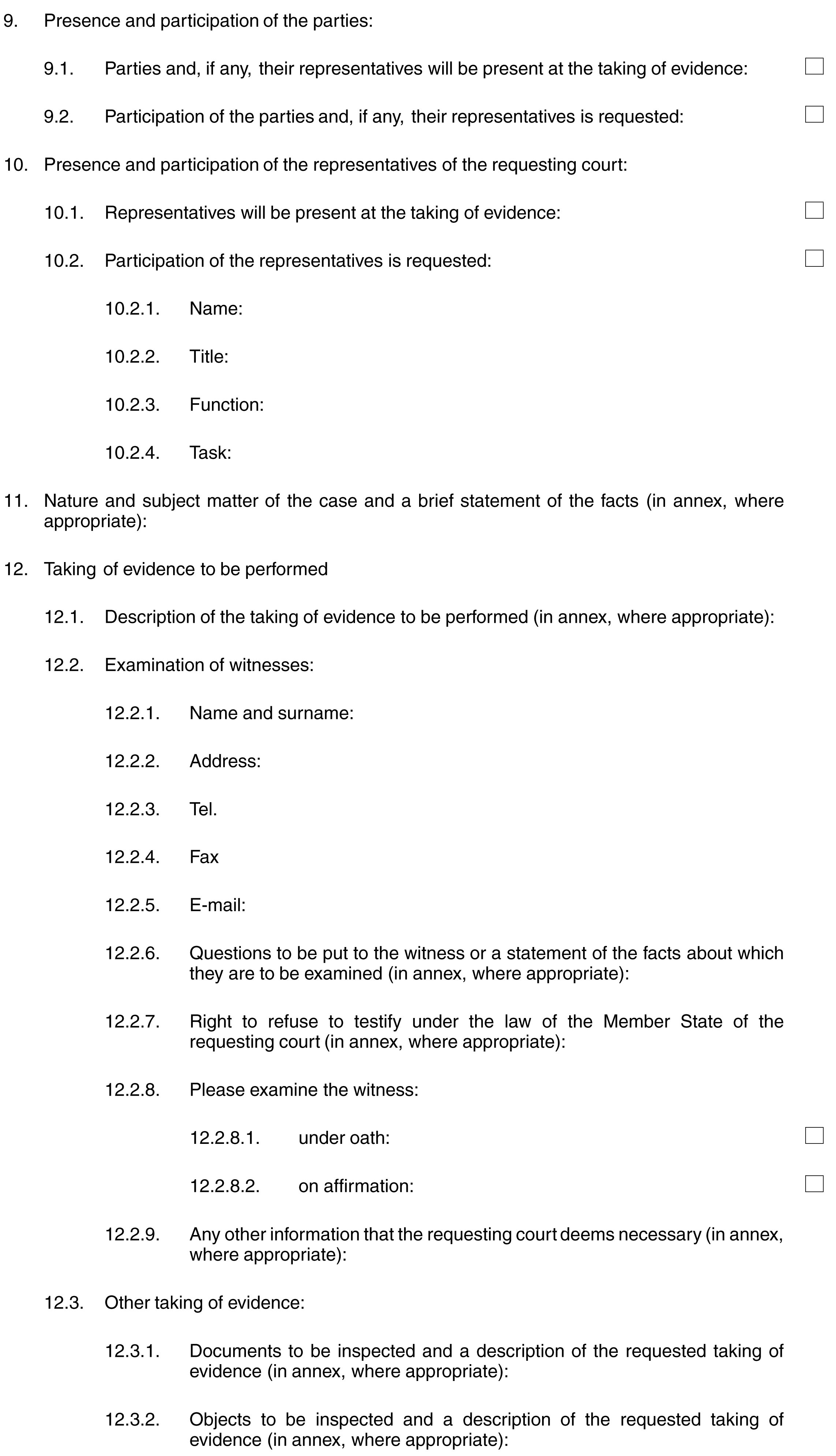 2. The requesting court shall, in its request, inform the requested court that the parties and, if any, their representatives, will be present and, where appropriate, that their participation is requested, using form A in the Annex. This information may also be given at any other appropriate time.
