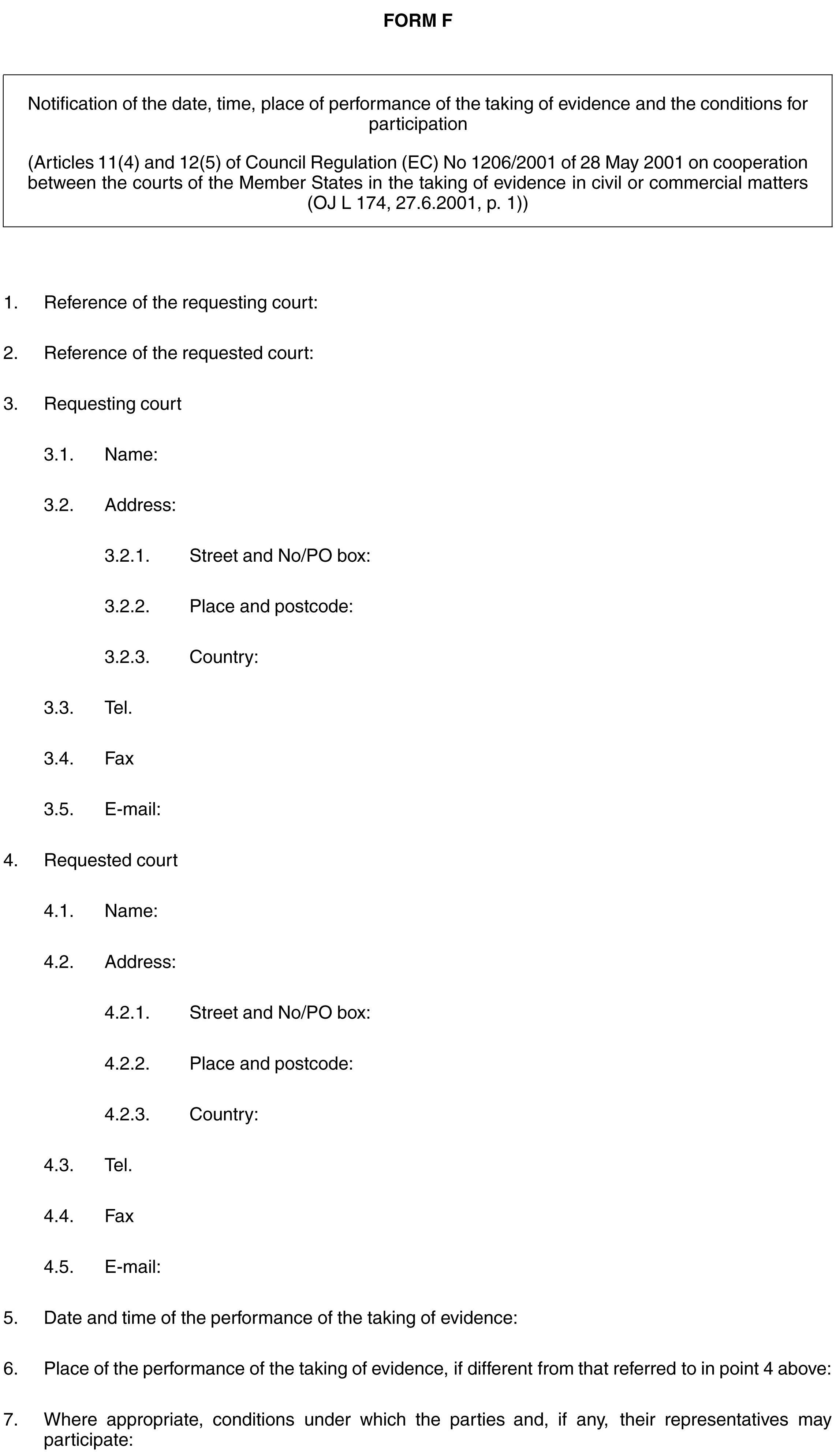 5. The requested court shall notify the requesting court, of the time when, and the place where, the proceedings will take place, and, where appropriate, the conditions under which the representatives may participate, using form F in the Annex.