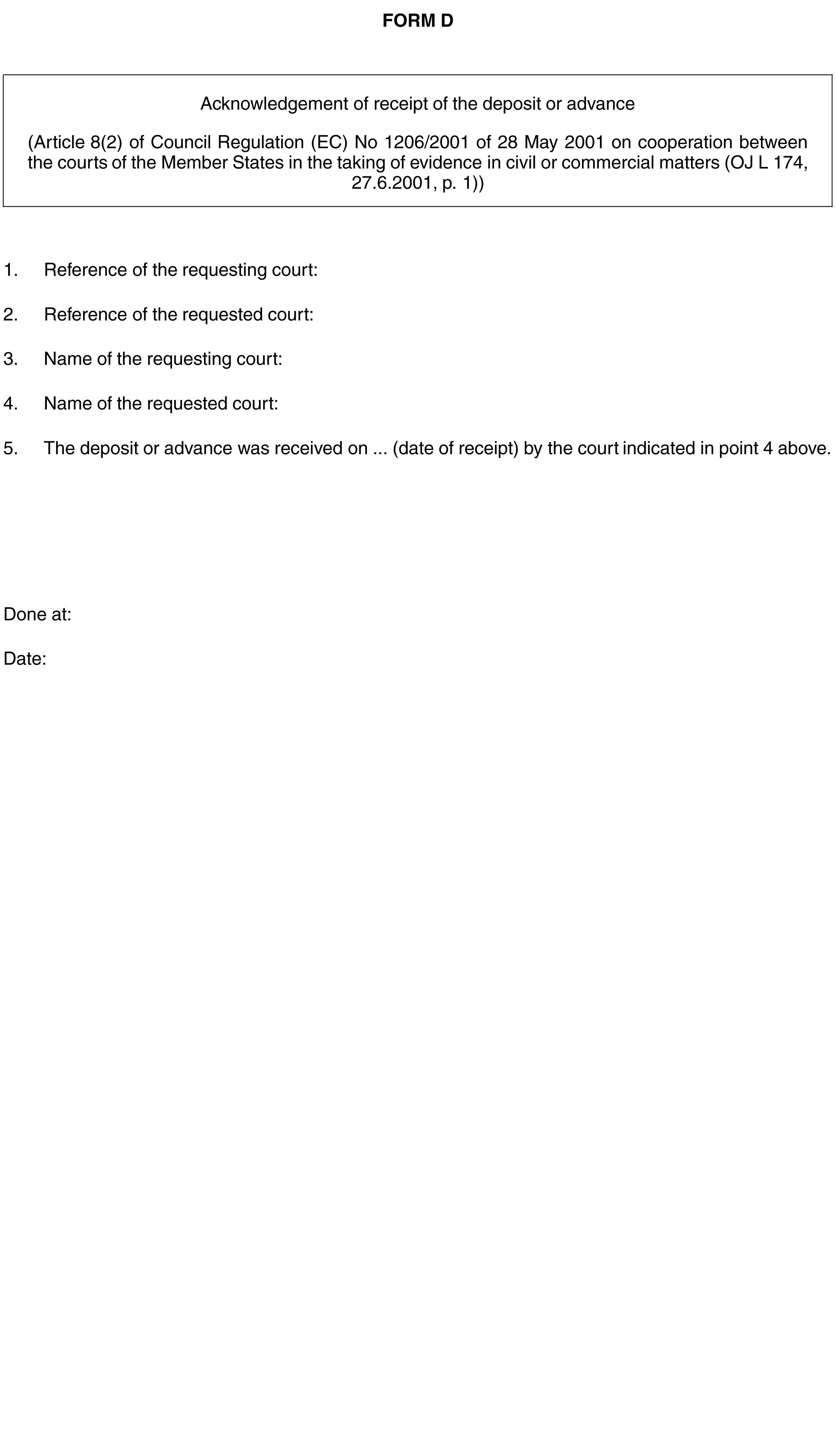 2. If a request cannot be executed because a deposit or advance is necessary in accordance with Article 18(3), the requested court shall inform the requesting court thereof without delay and, at the latest, within 30 days of receipt of the request using form C in the Annex and inform the requesting court how the deposit or advance should be made. The requested Court shall acknowledge receipt of the deposit or advance without delay, at the latest within 10 days of receipt of the deposit or the advance using form D.