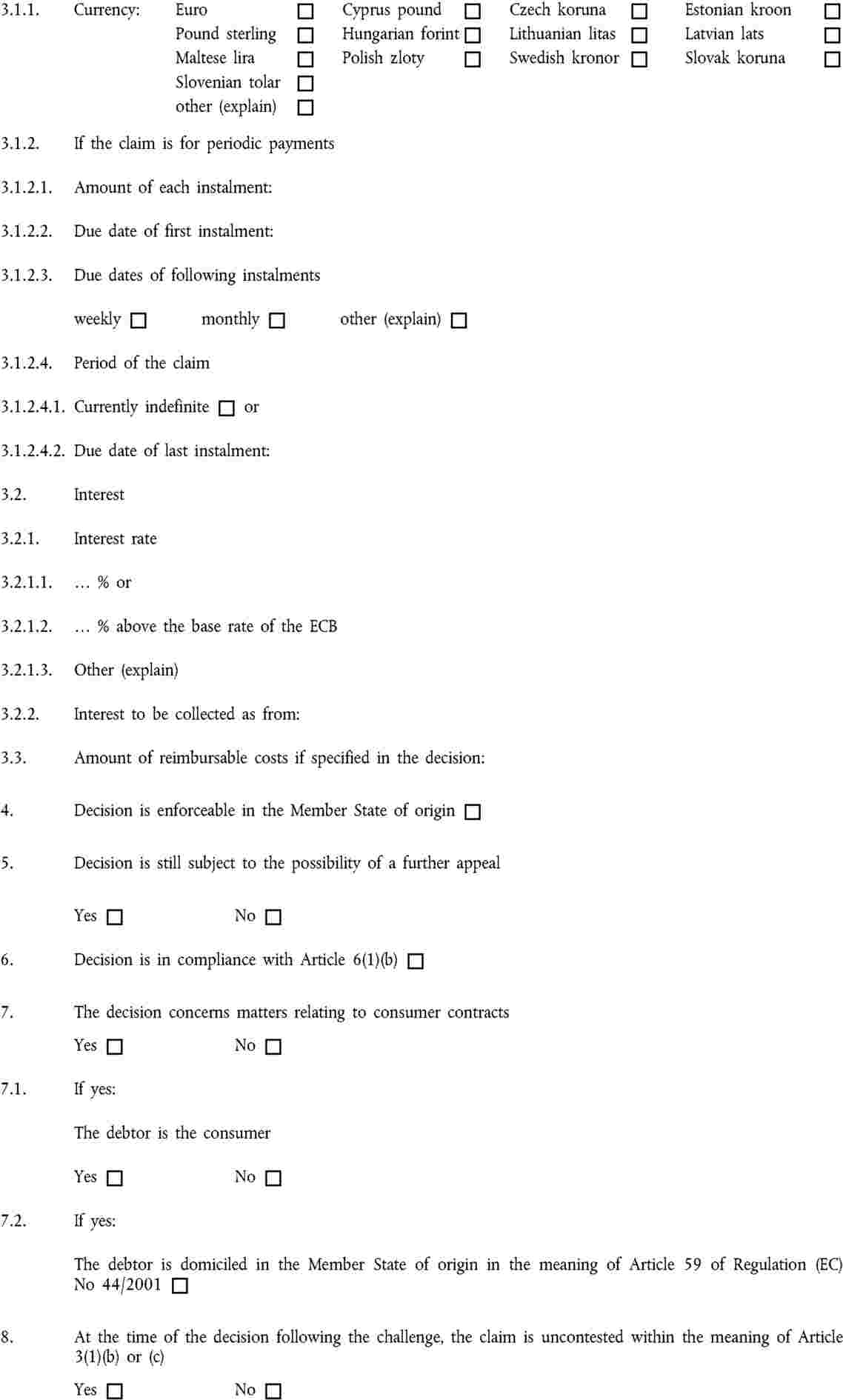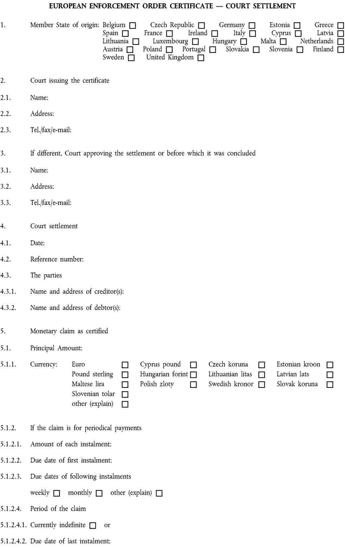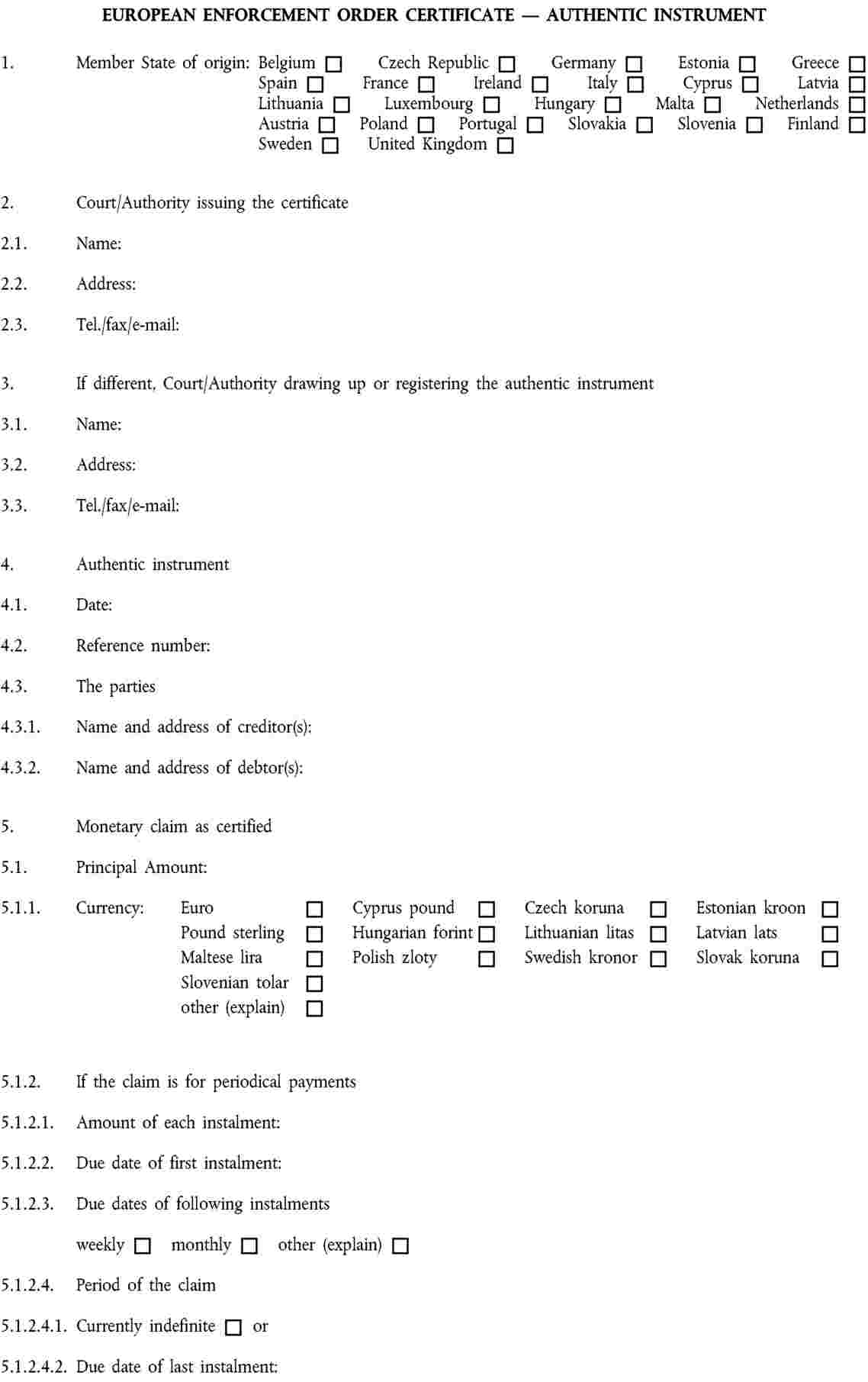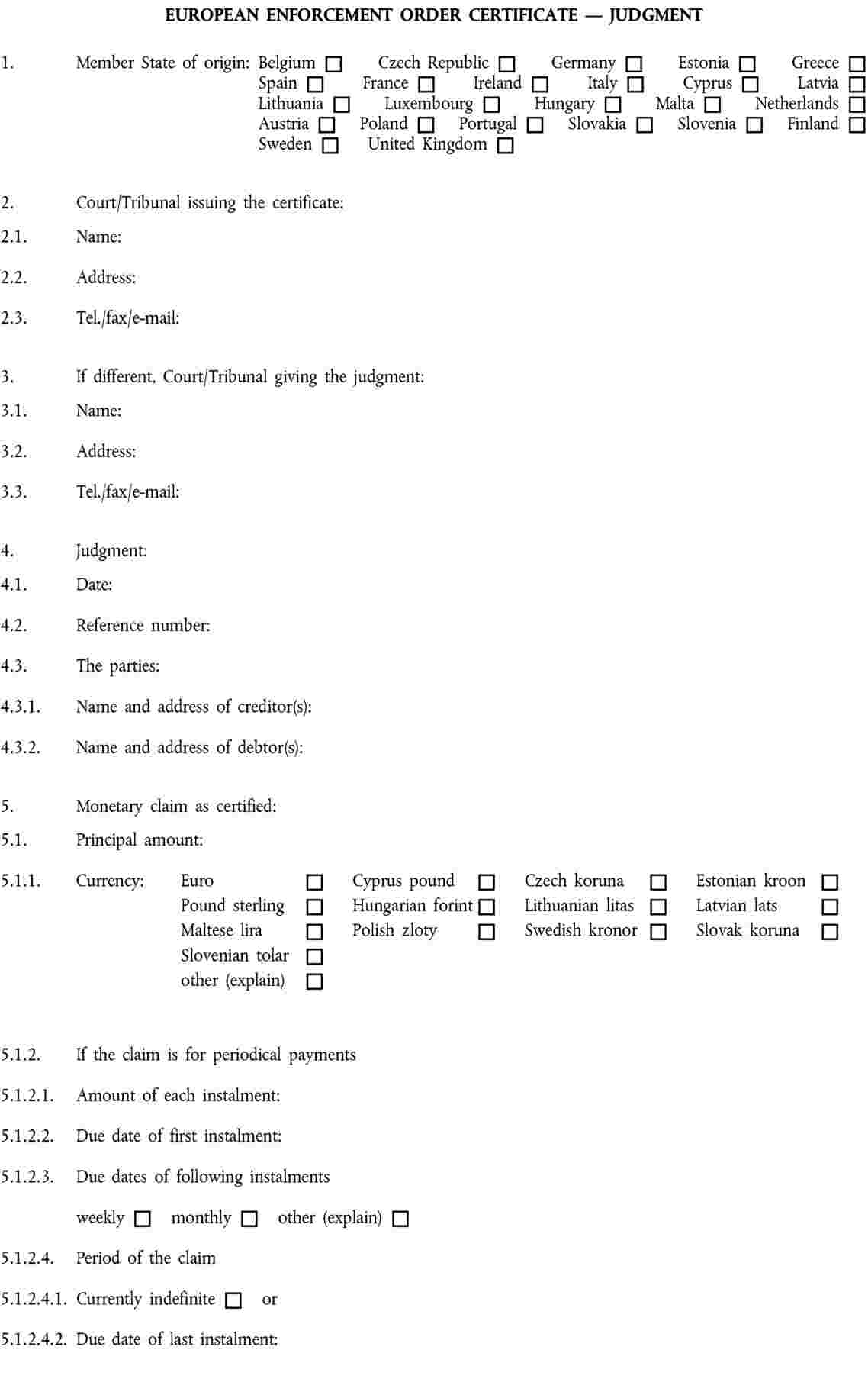 Annexes I to VI to Regulation (EC) No 805/2004 contain a series of standard forms to be used in the context of the European Enforcement Order procedure for uncontested claims. |