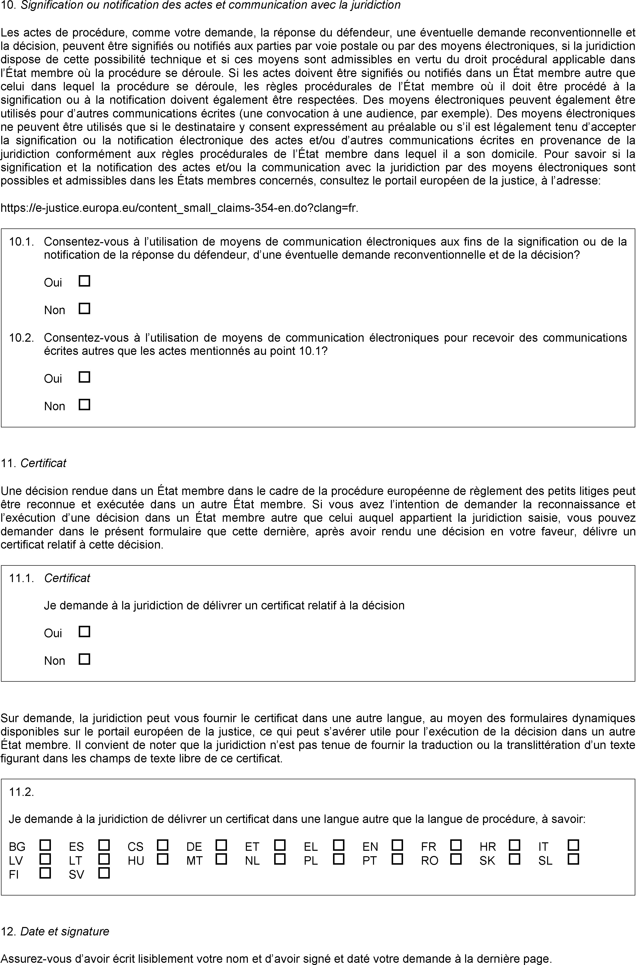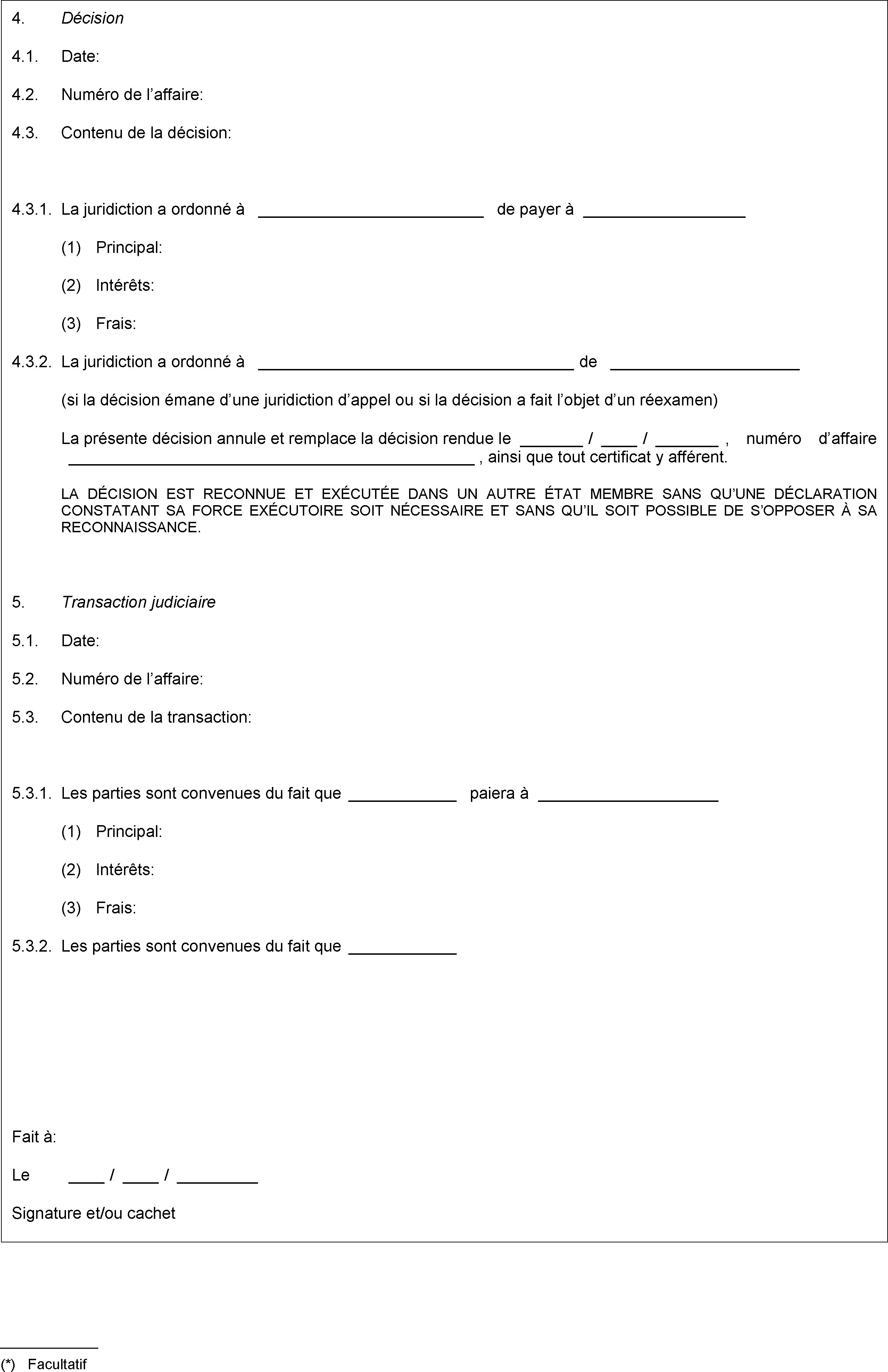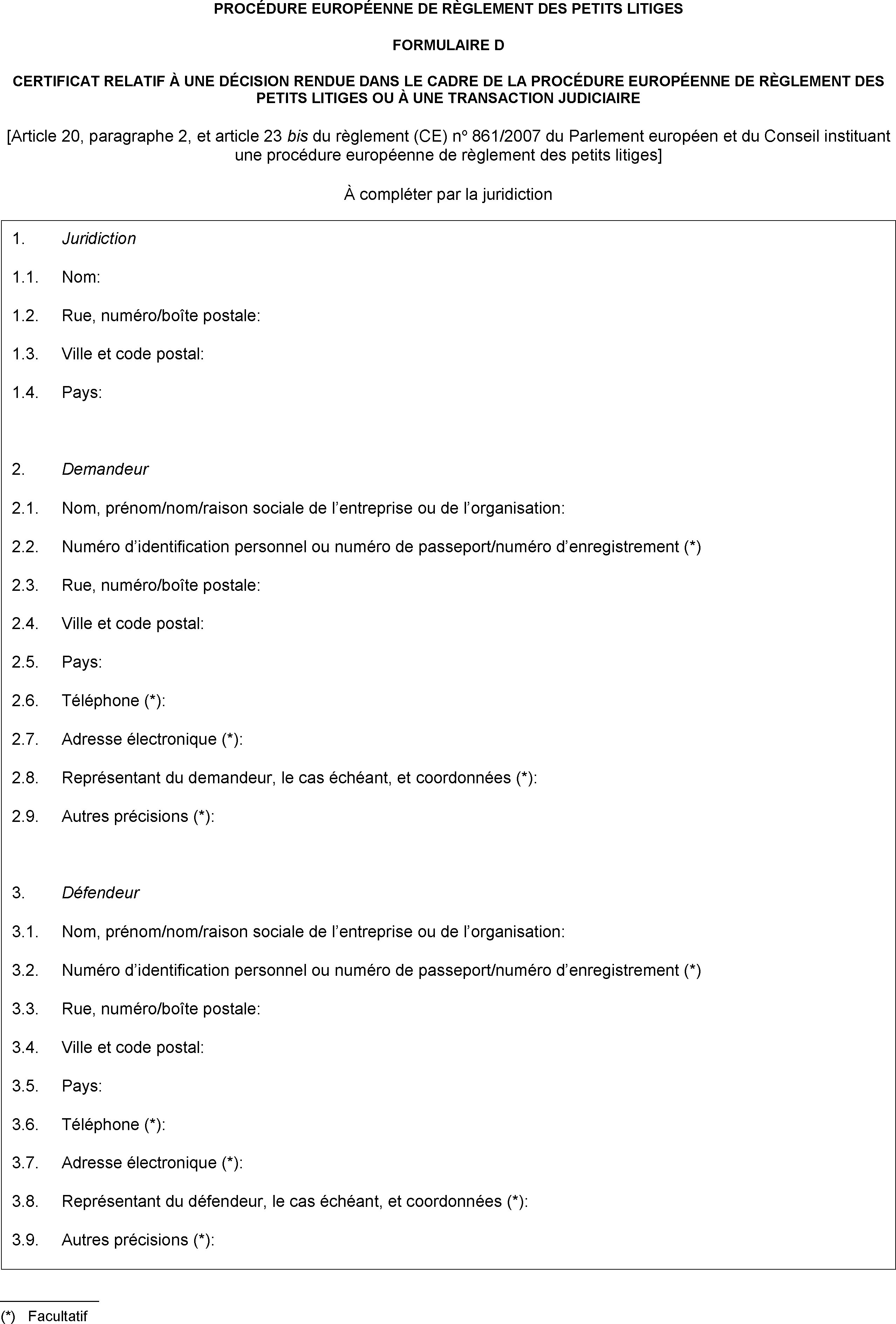 2. À la demande d'une des parties, la juridiction délivre, sans frais supplémentaires, le certificat relatif à une décision rendue dans le cadre de la procédure européenne de règlement des petits litiges, au moyen du formulaire type D figurant à l'annexe IV. Sur demande, la juridiction fournit à cette partie le certificat rédigé dans toute autre langue officielle des institutions de l'Union au moyen du formulaire type dynamique multilingue disponible sur le portail e-Justice européen. Aucune disposition du présent règlement n'impose à la juridiction de fournir une traduction et/ou une translittération du texte figurant dans les champs de texte libre de ce certificat.