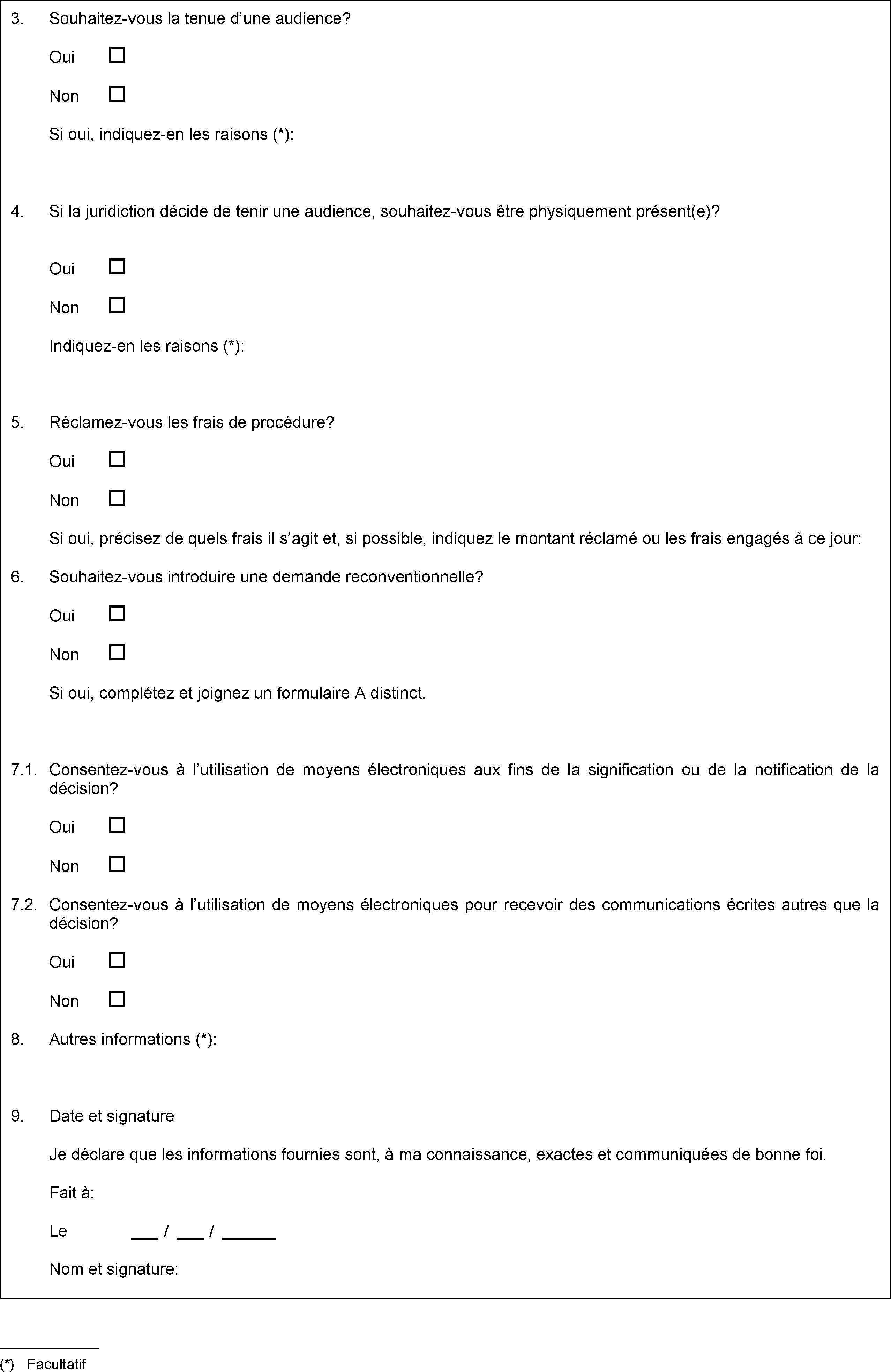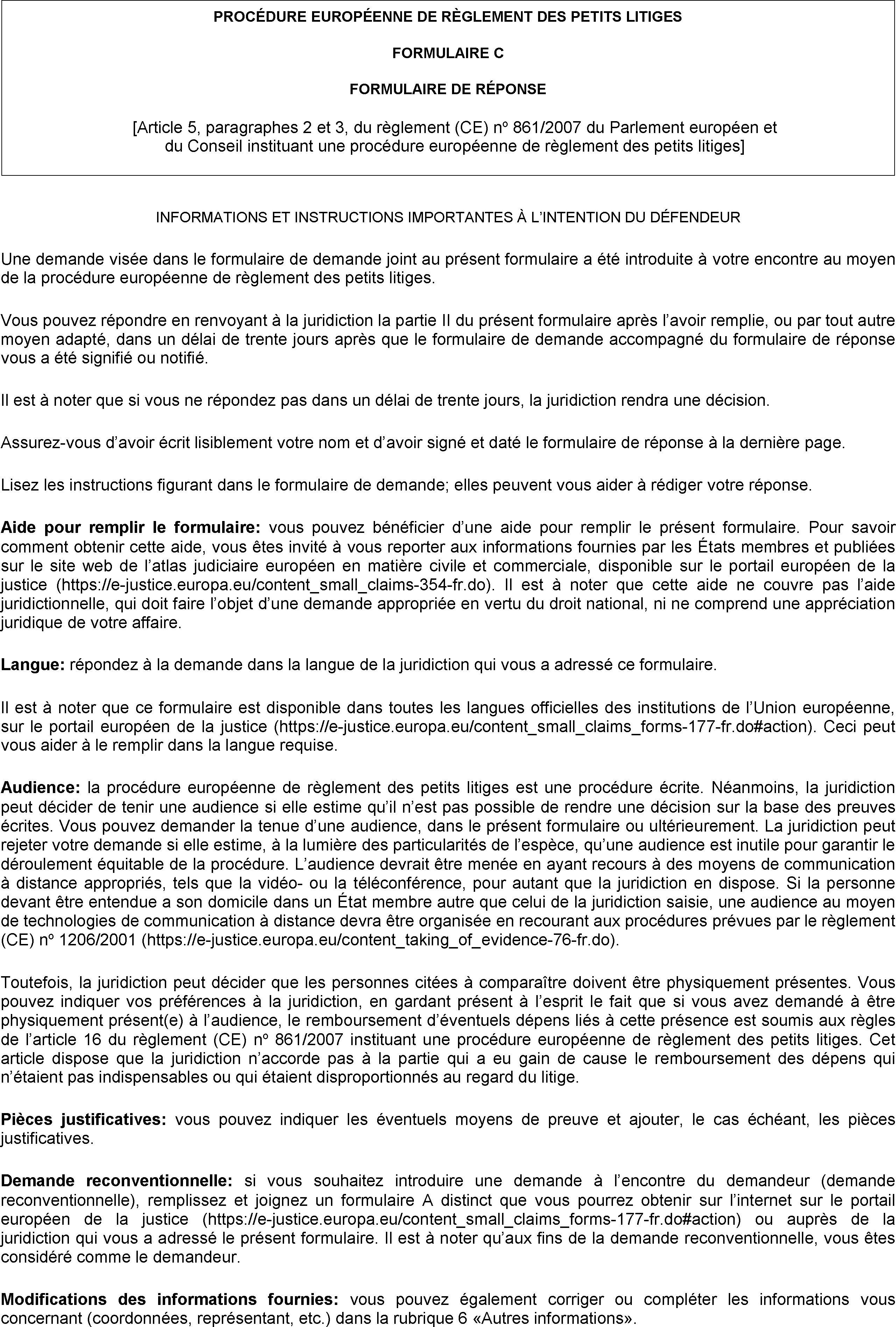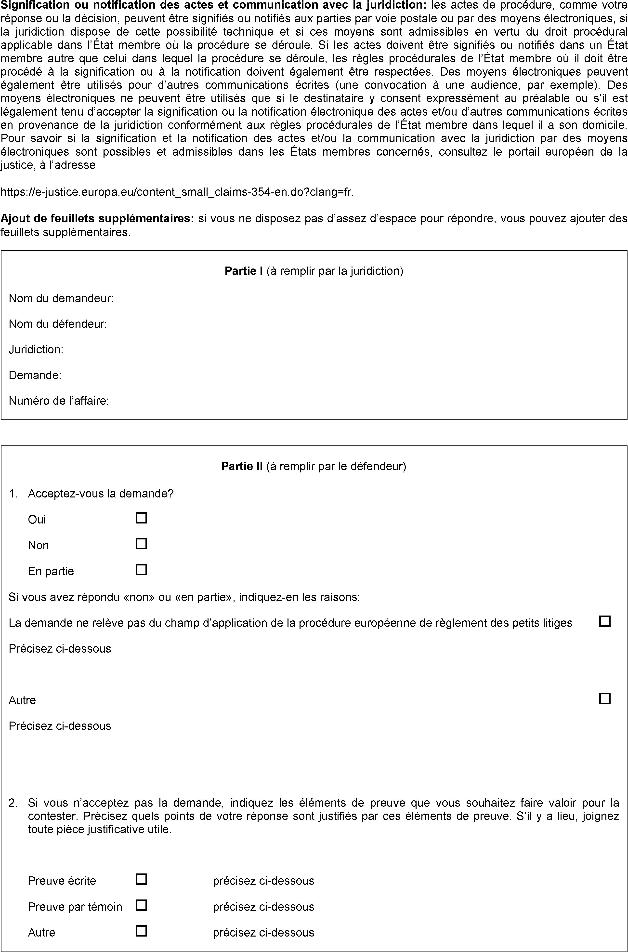 3. Le défendeur répond dans un délai de trente jours à compter de la date à laquelle les formulaires de demande et de réponse lui ont été signifiés ou notifiés en remplissant la partie II du formulaire type de réponse C, accompagné, le cas échéant, de toutes pièces justificatives utiles, et en le renvoyant à la juridiction, ou par tout autre moyen adapté n’impliquant pas l’utilisation du formulaire de réponse.