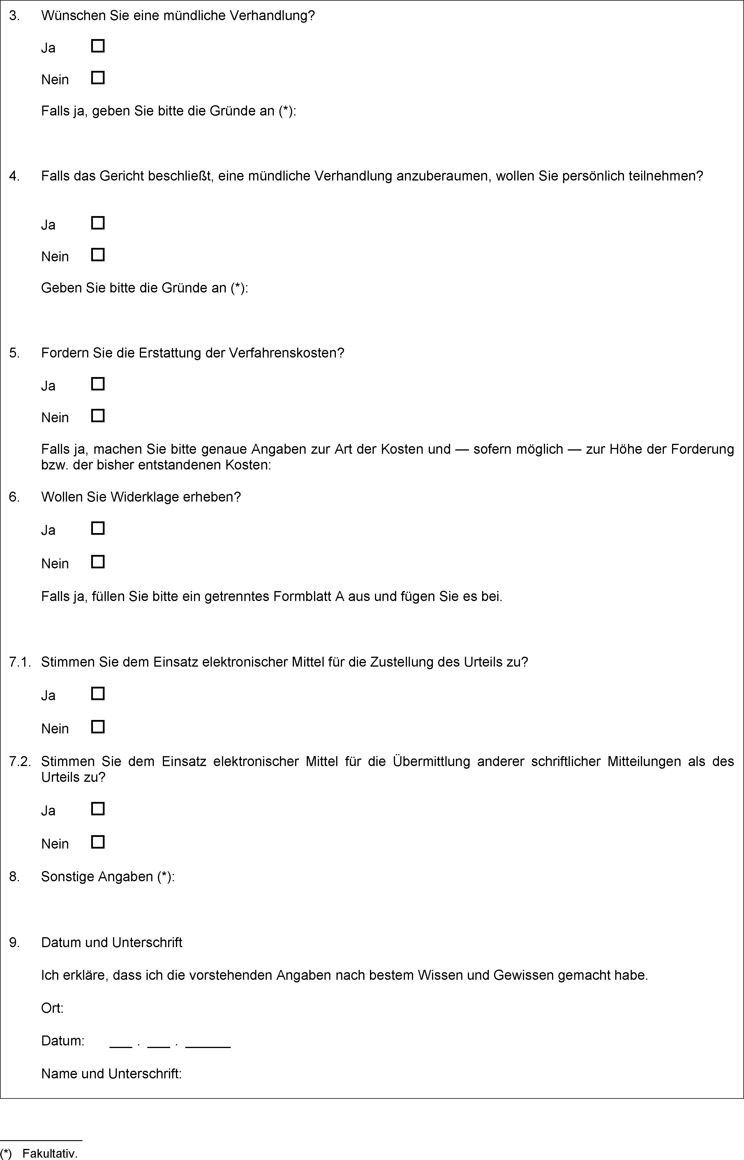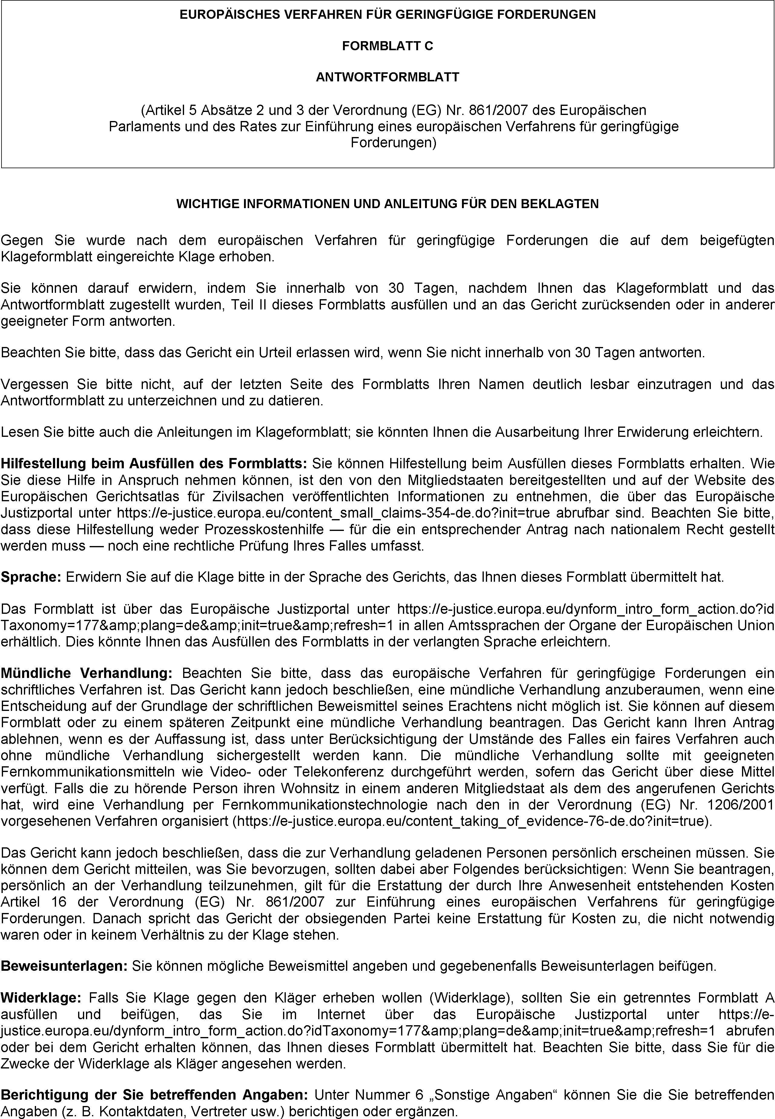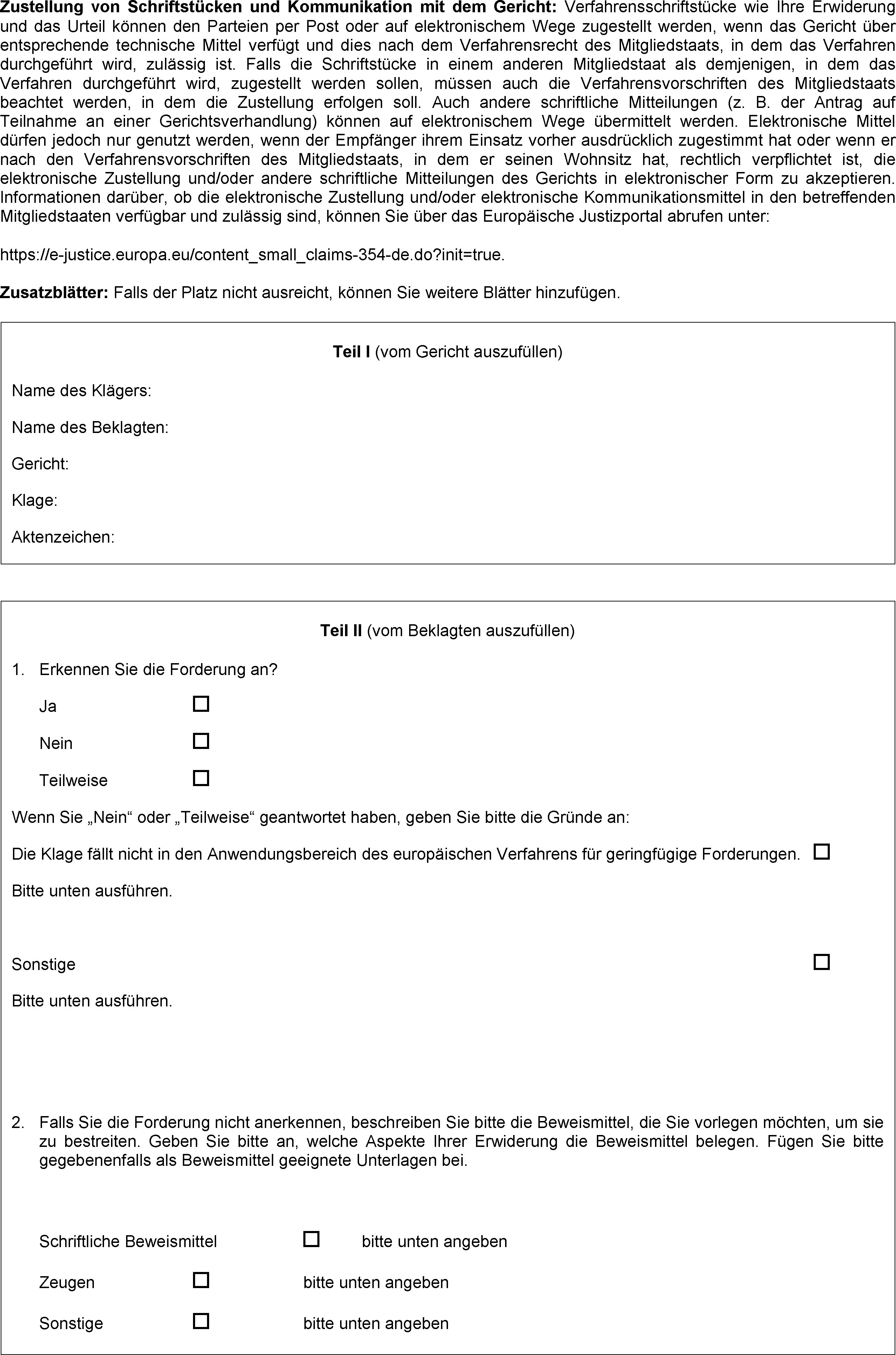 (3) Der Beklagte hat innerhalb von 30 Tagen nach Zustellung des Klageformblattsund des Antwortformblatts zu antworten, indem er Teil II des Formblatts C ausfüllt und es gegebenenfalls mit als Beweismittel geeigneten Unterlagen an das Gericht zurücksendet oder indem er auf andere geeignete Weise ohne Verwendung des Antwortformblatts antwortet.