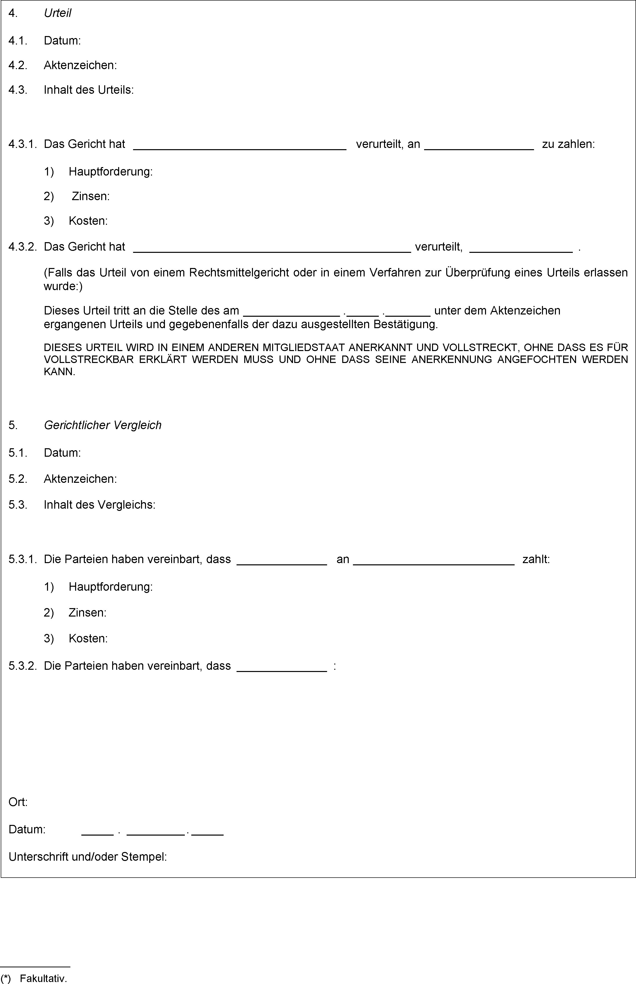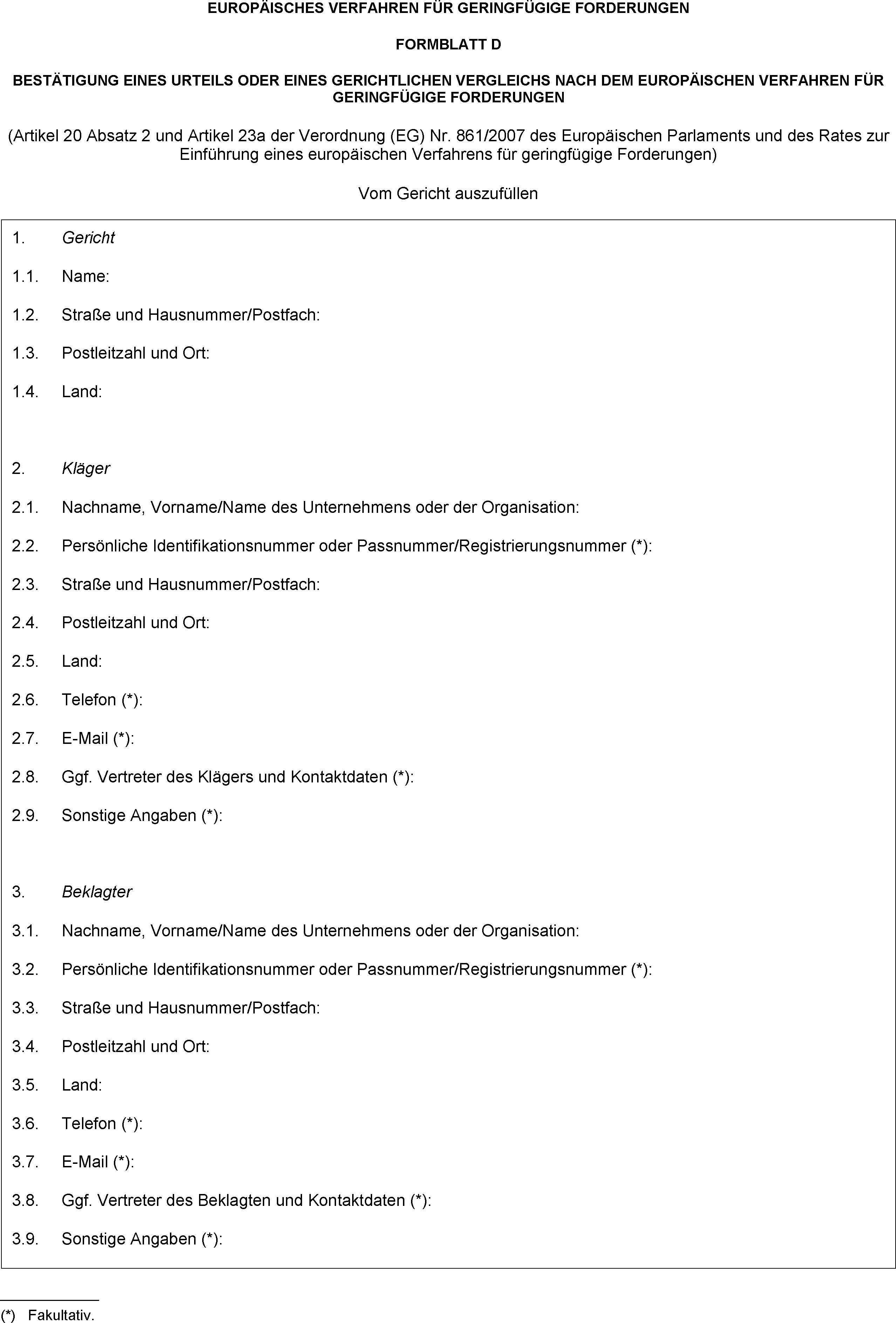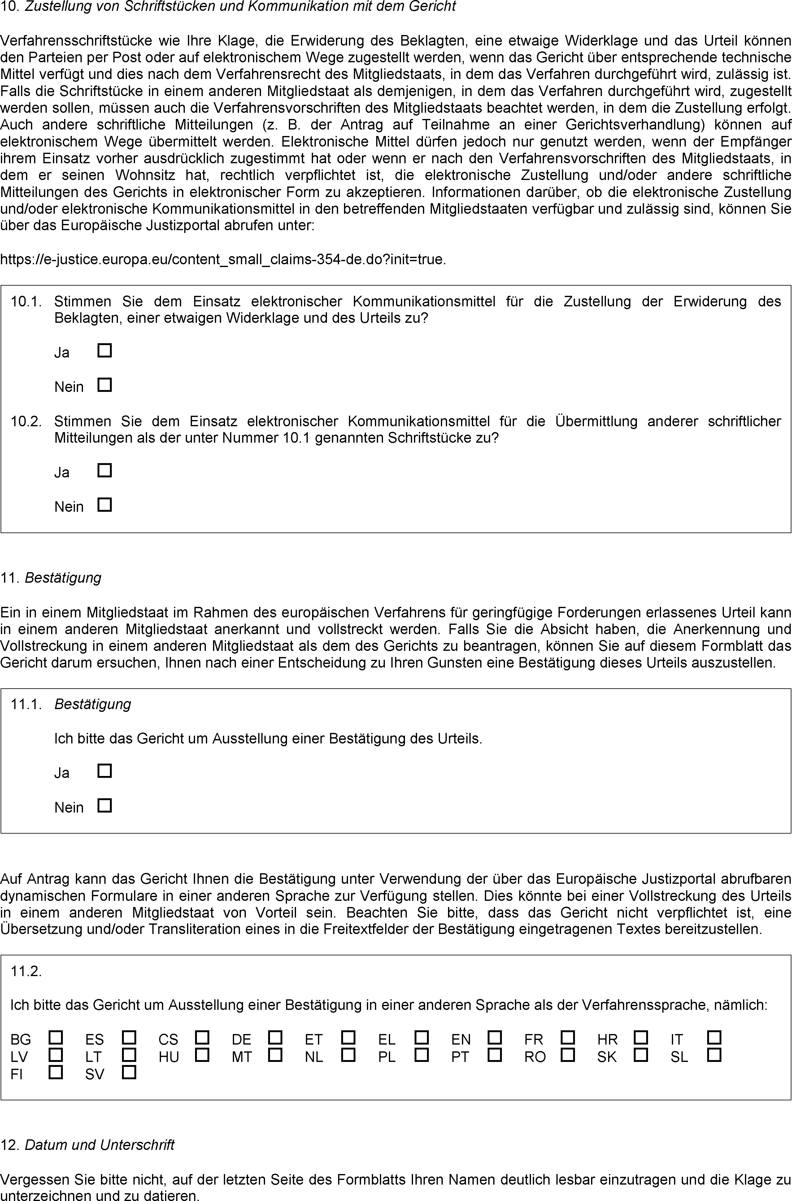 (2) Auf Antrag einer Partei fertigt das Gericht ohne zusätzliche Kosten unter Verwendung des in Anhang IV vorgegebenen Formblatts D eine Bestätigung zu einem im europäischen Verfahren für geringfügige Forderungen ergangenen Urteil aus. Auf Antrag stellt das Gericht dieser Partei die Bestätigung in jeder anderen Amtssprache der Organe der Union zur Verfügung, unter Verwendung des über das Europäische Justizportal in allen Amtssprachen der Organe der Union zur Verfügung stehenden dynamischen Standardformblatts. Diese Verordnung verpflichtet das Gericht nicht dazu, eine Übersetzung und/oder Transliteration des in die Freitextfelder der Bestätigung eingetragenen Texts zur Verfügung zu stellen.