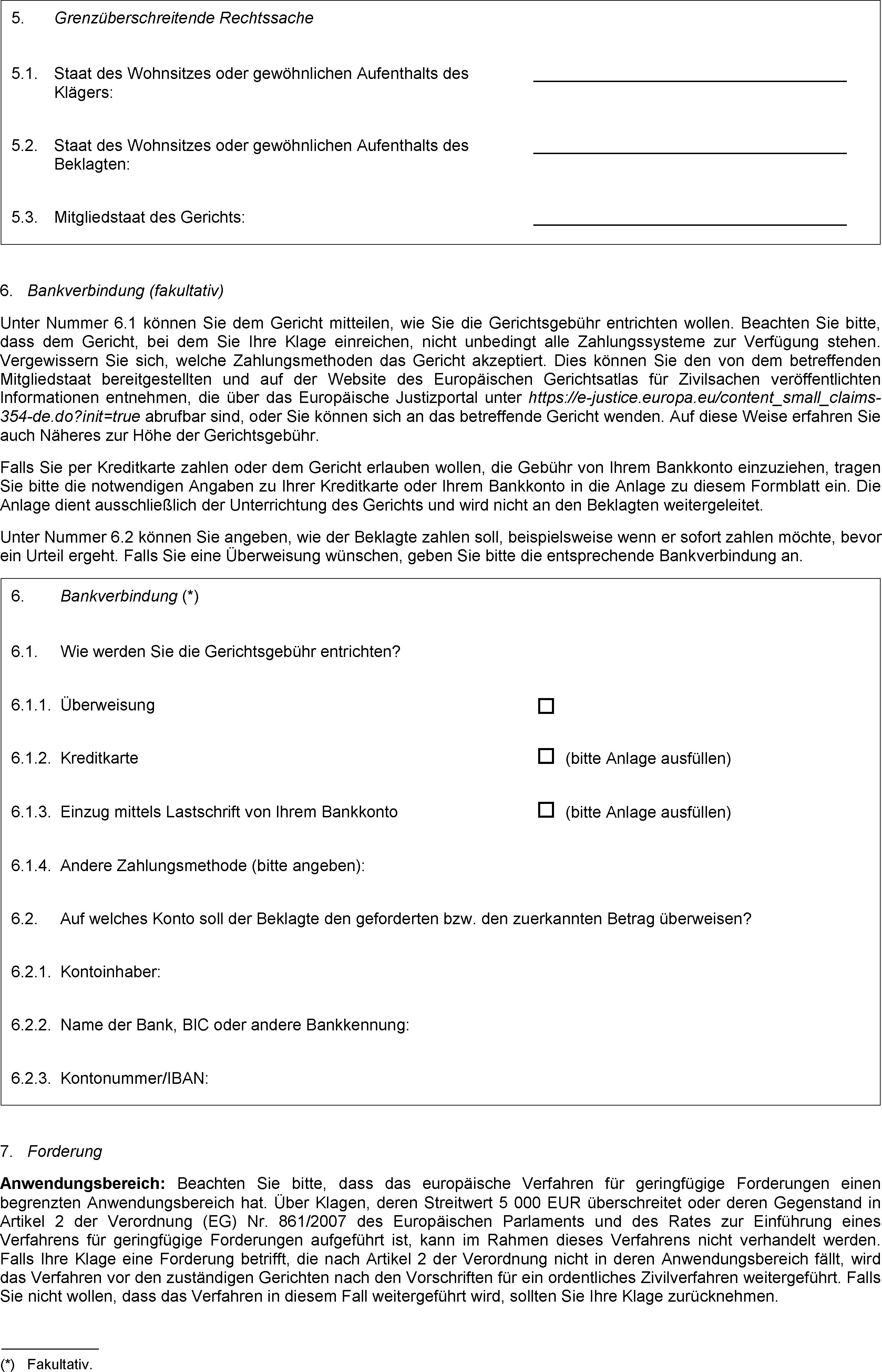 f)die Gerichtsgebühren, die für das europäische Verfahren für geringfügige Forderungen erhoben werden oder wie sie berechnet werden und welche Zahlungsweise gemäß Artikel 15a anerkannt wird;