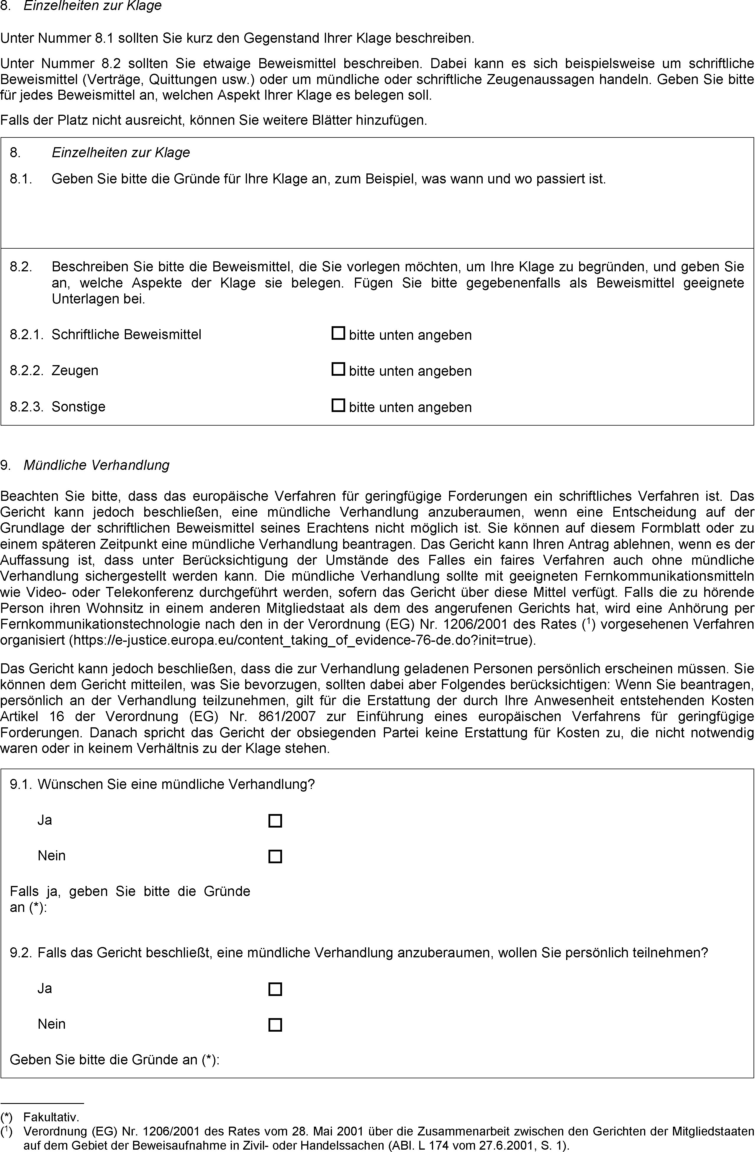(3) Eine Partei, die geladen wurde, unter Verwendung eines Mittels der Fernkommunikationstechnologie an einer mündlichen Verhandlung teilzunehmen, kann ihre persönliche Anwesenheit bei der Verhandlung beantragen. Mit Klageformblatt A und Antwortformblatt C, die nach dem Verfahren gemäß Artikel 27 Absatz 2 erstellt werden, werden die Parteien darüber unterrichtet, dass die Rückerstattung der Kosten, die einer Partei aufgrund der von ihr selbst beantragten persönlichen Anwesenheit bei der mündlichen Verhandlung entstehen, den Bedingungen des Artikels 16 unterliegt.