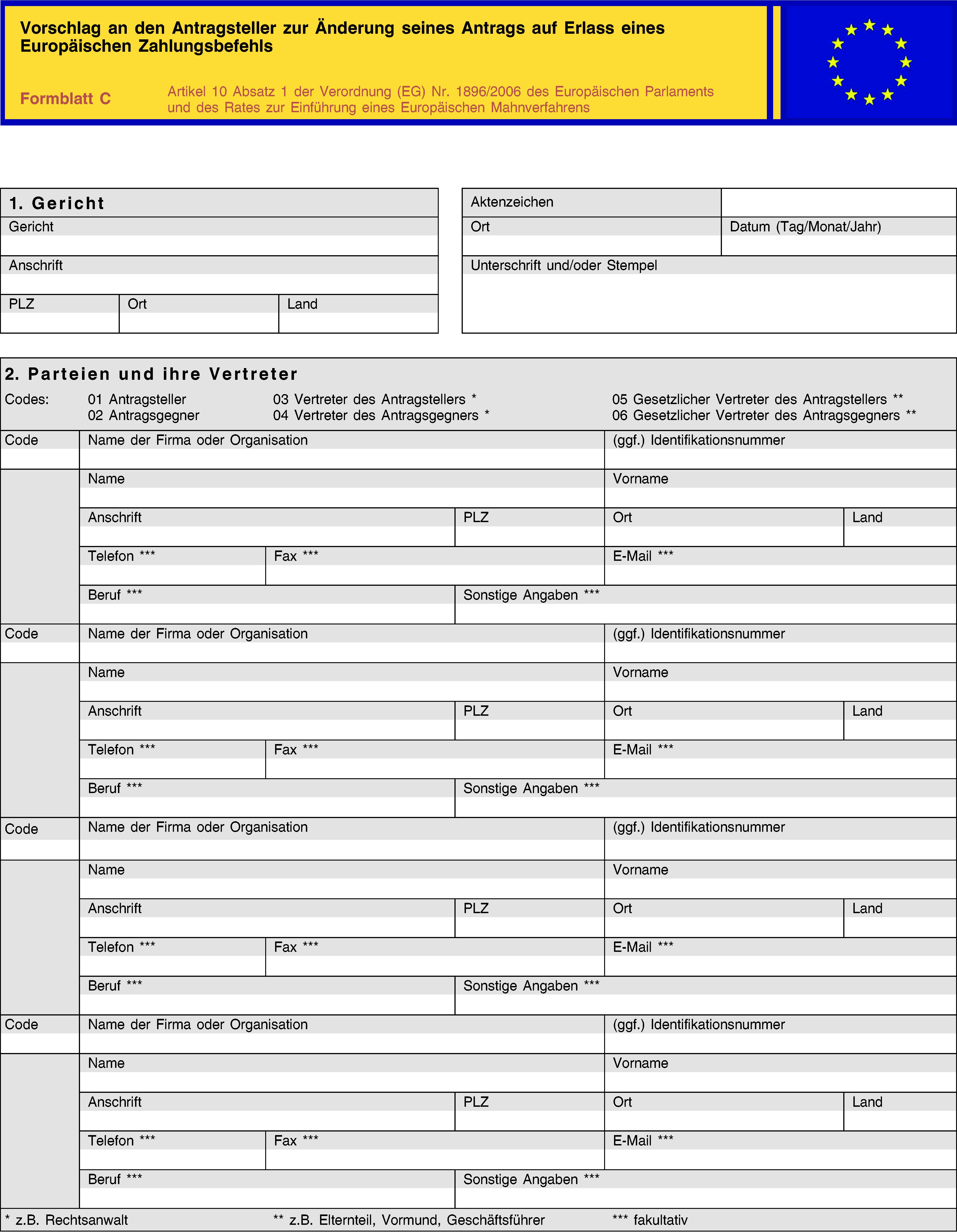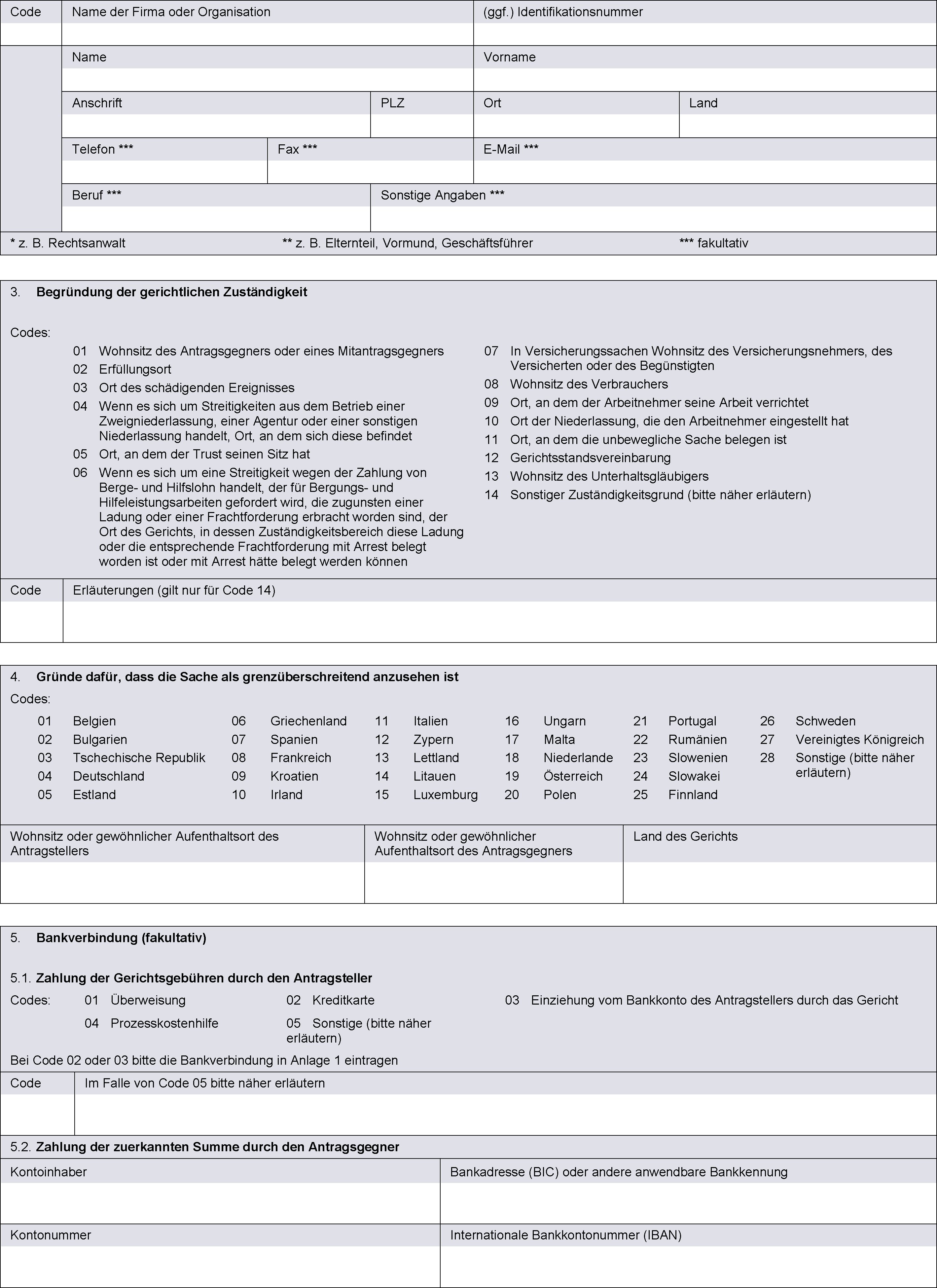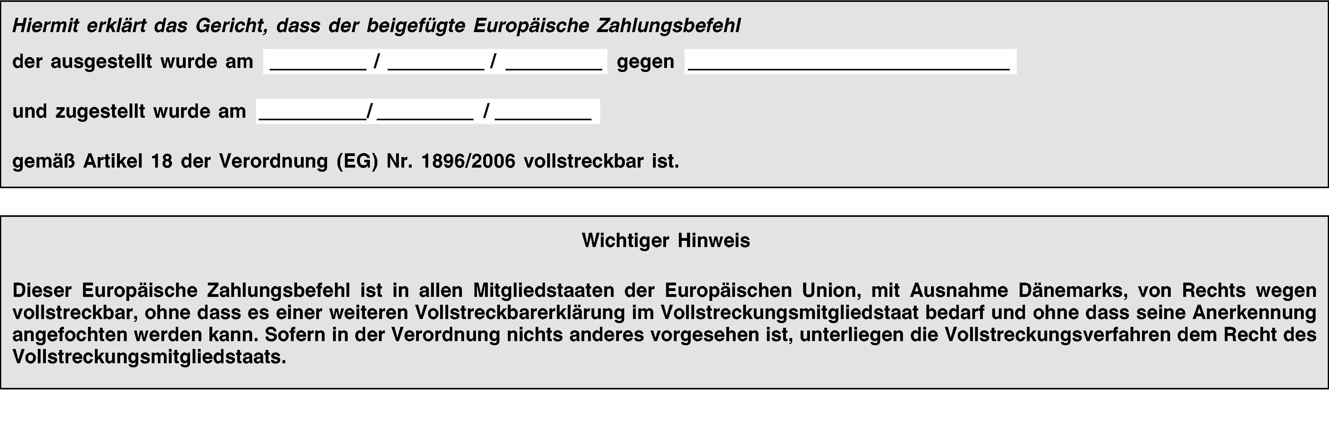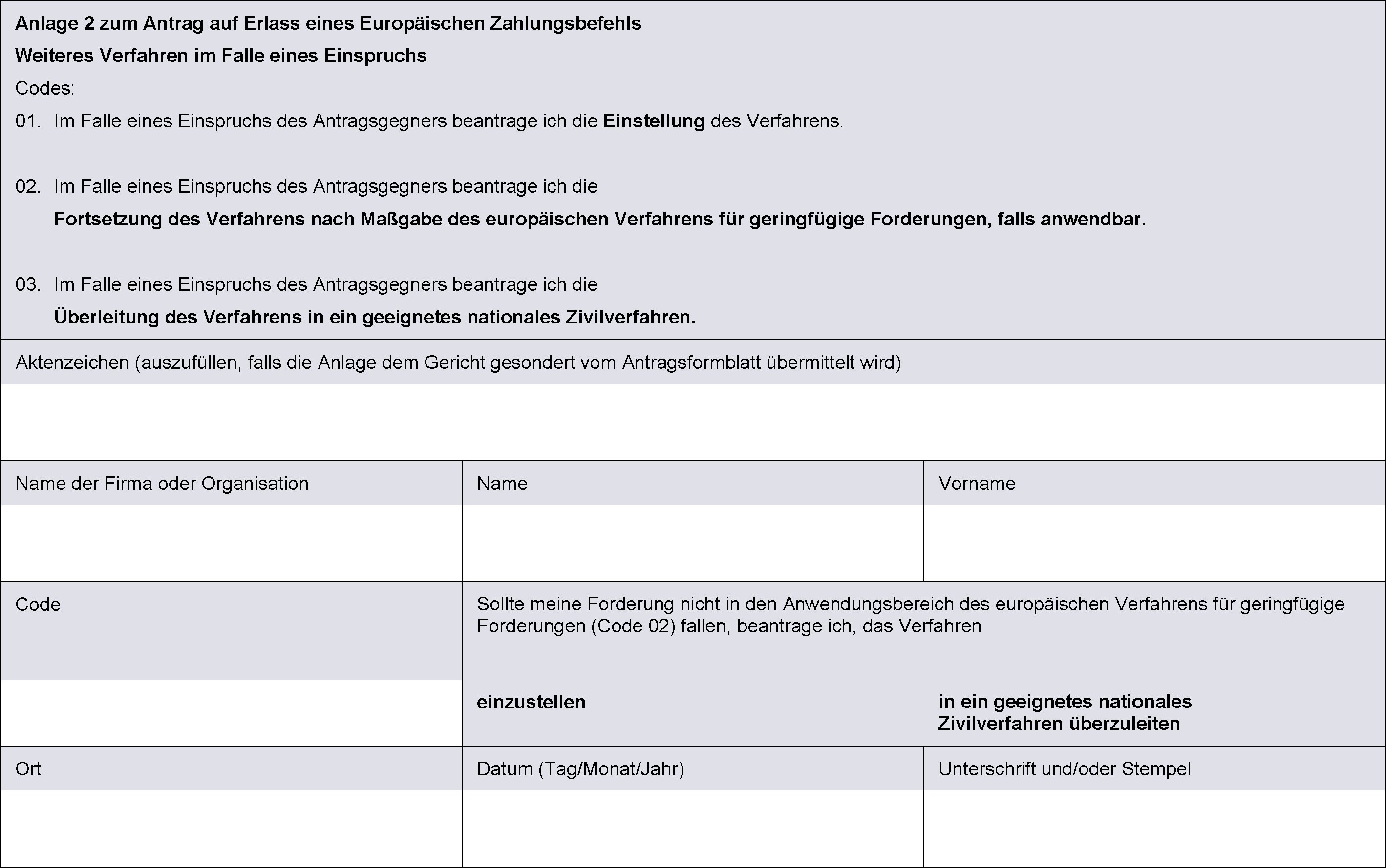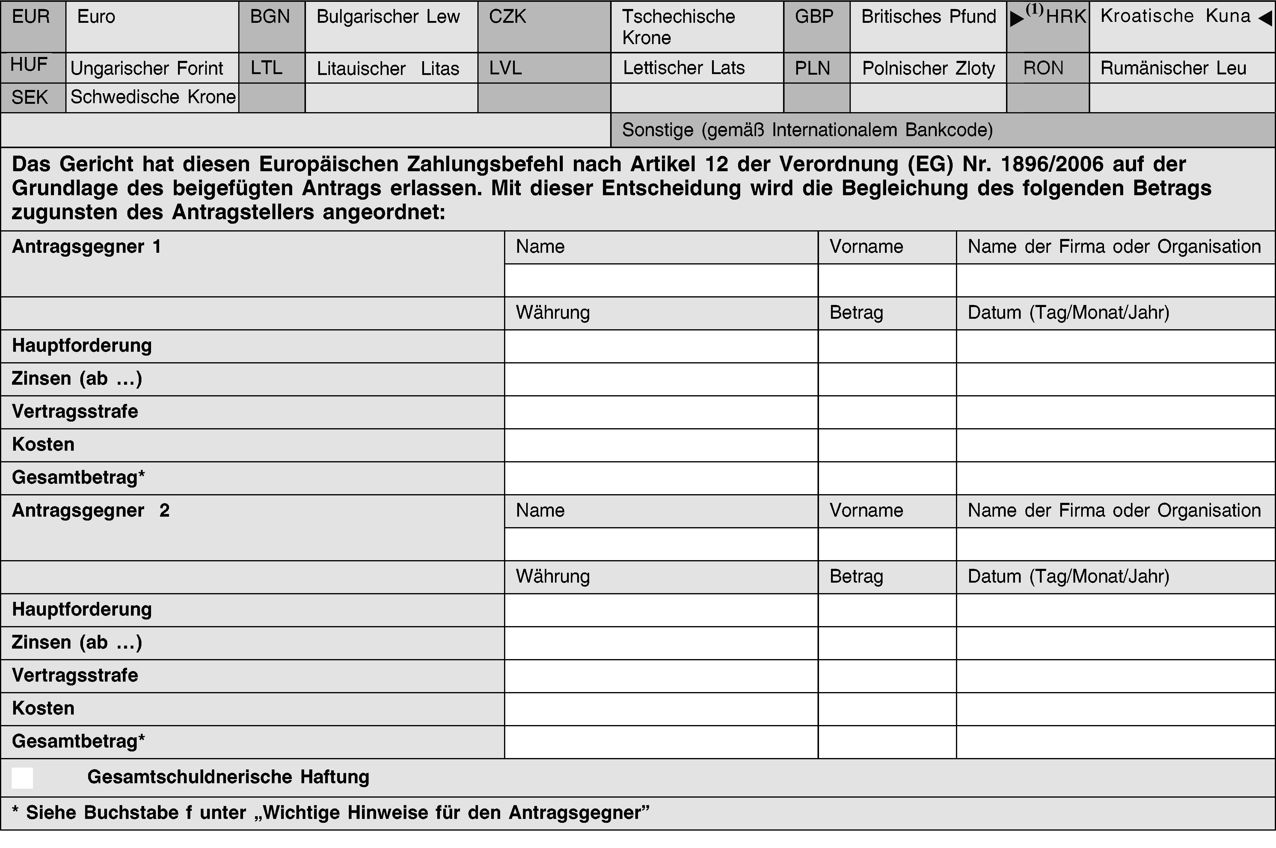 (2) Der Europäische Zahlungsbefehl wird zusammen mit einer Abschrift des Antragsformulars ausgestellt. Er enthält nicht die vom Antragsteller in den Anlagen 1 und 2 des Formblatts A gemachten Angaben.