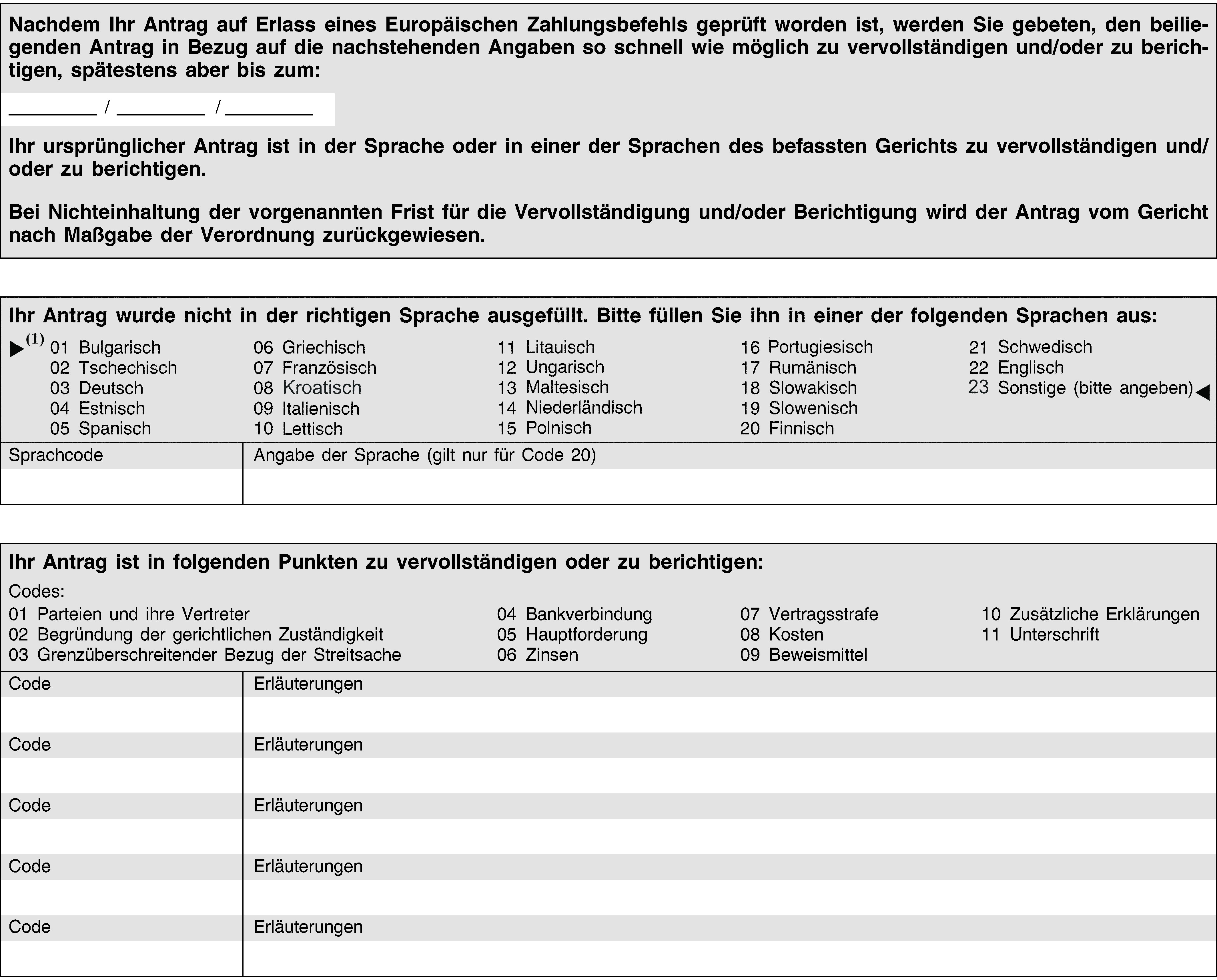 (1) Das Gericht räumt dem Antragsteller die Möglichkeit ein, den Antrag zu vervollständigen oder zu berichtigen, wenn die in Artikel 7 genannten Voraussetzungen nicht erfüllt sind und die Forderung nicht offensichtlich unbegründet oder der Antrag unzulässig ist. Das Gericht verwendet dazu das Formblatt B gemäß Anhang II.