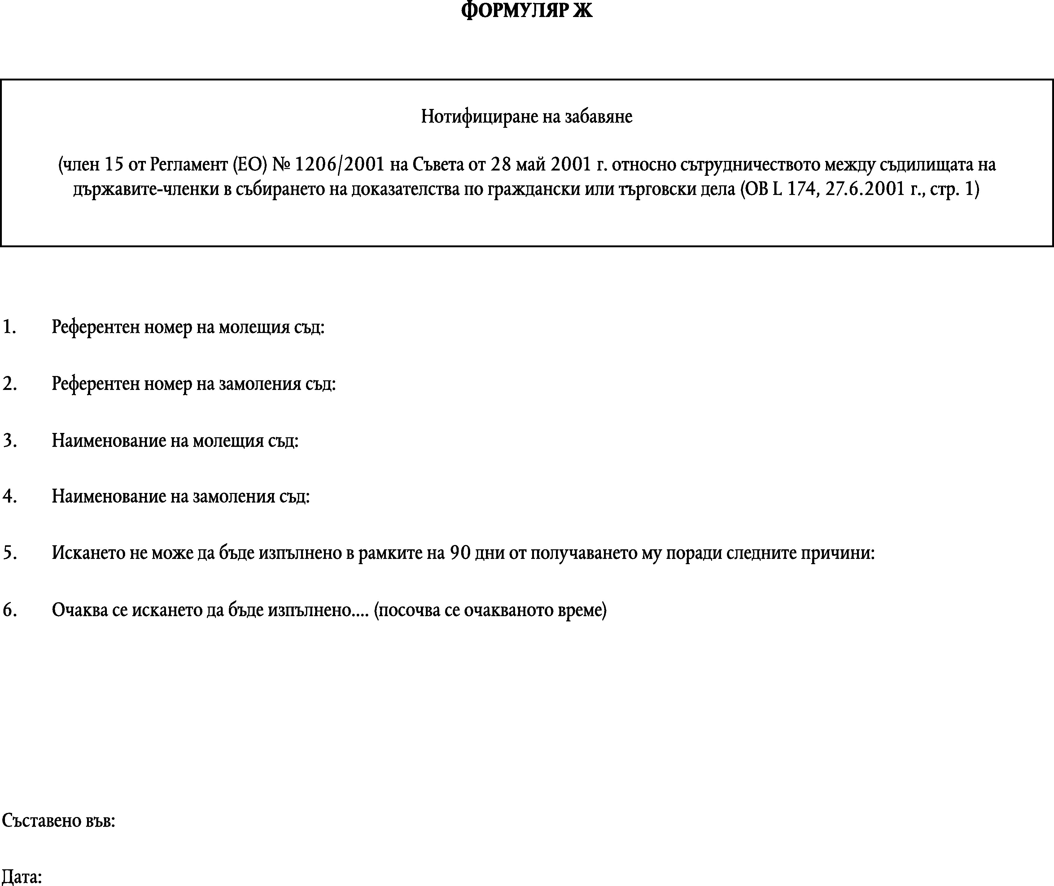 Ако замоленият съд не е в състояние да изпълни искането в рамките на 90 дни от получаването му, той нотифицира за това молещия съд чрез използване на формуляр Ж от приложението. Когато го прави, причините за забавянето трябва да бъдат представени заедно с предвижданото време, което замоленият съд очаква да му е необходимо за изпълнение на искането.