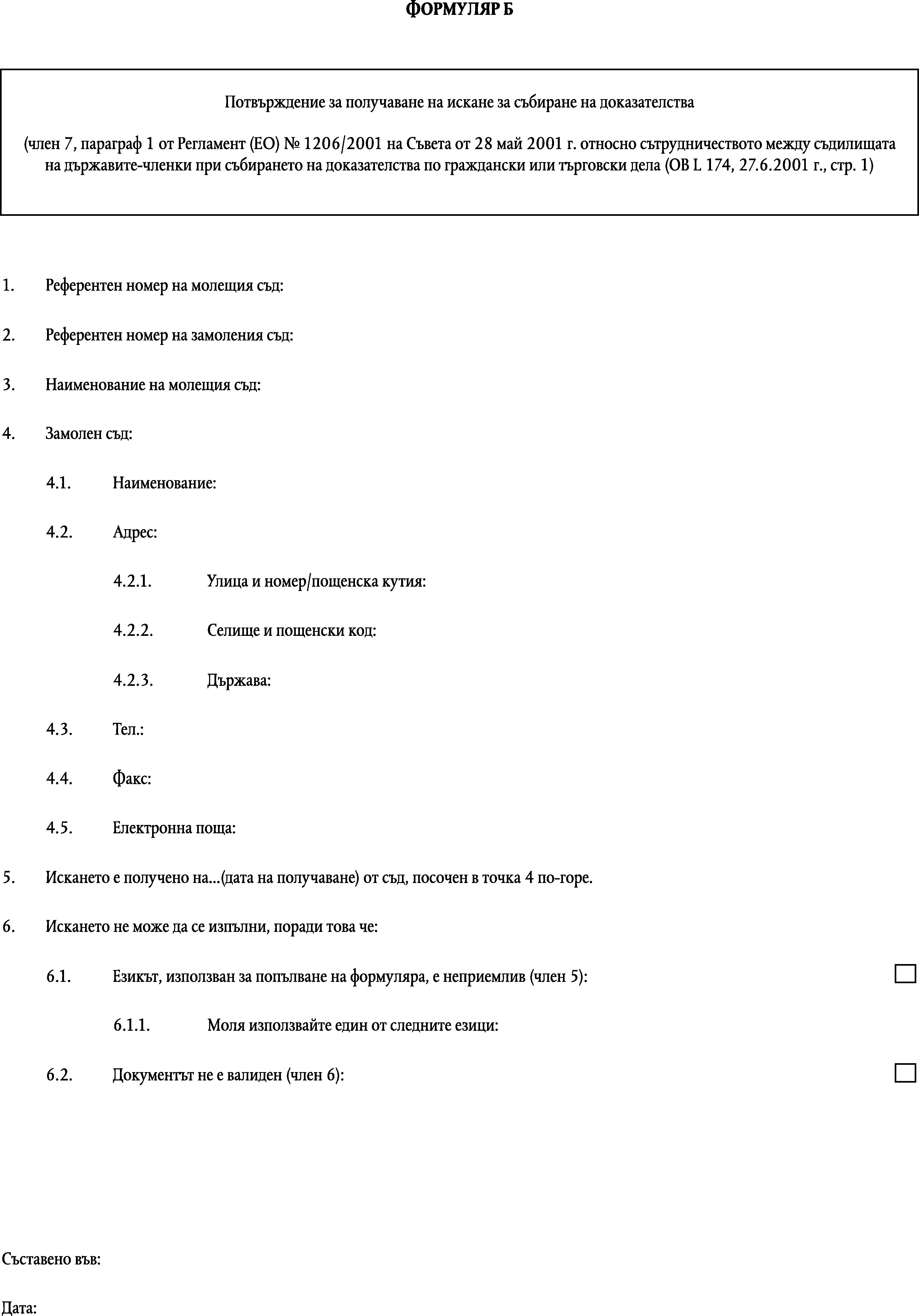 1. В рамките на седем дни от получаването на искането замоленият компетентен съд изпраща потвърждение на получаването до молещия съд, като използва формуляр Б от приложението. Когато искането не отговаря на изискванията, установени в членове 5 и 6, замоленият съд прилага уведомление за това към потвърждението на получаването.