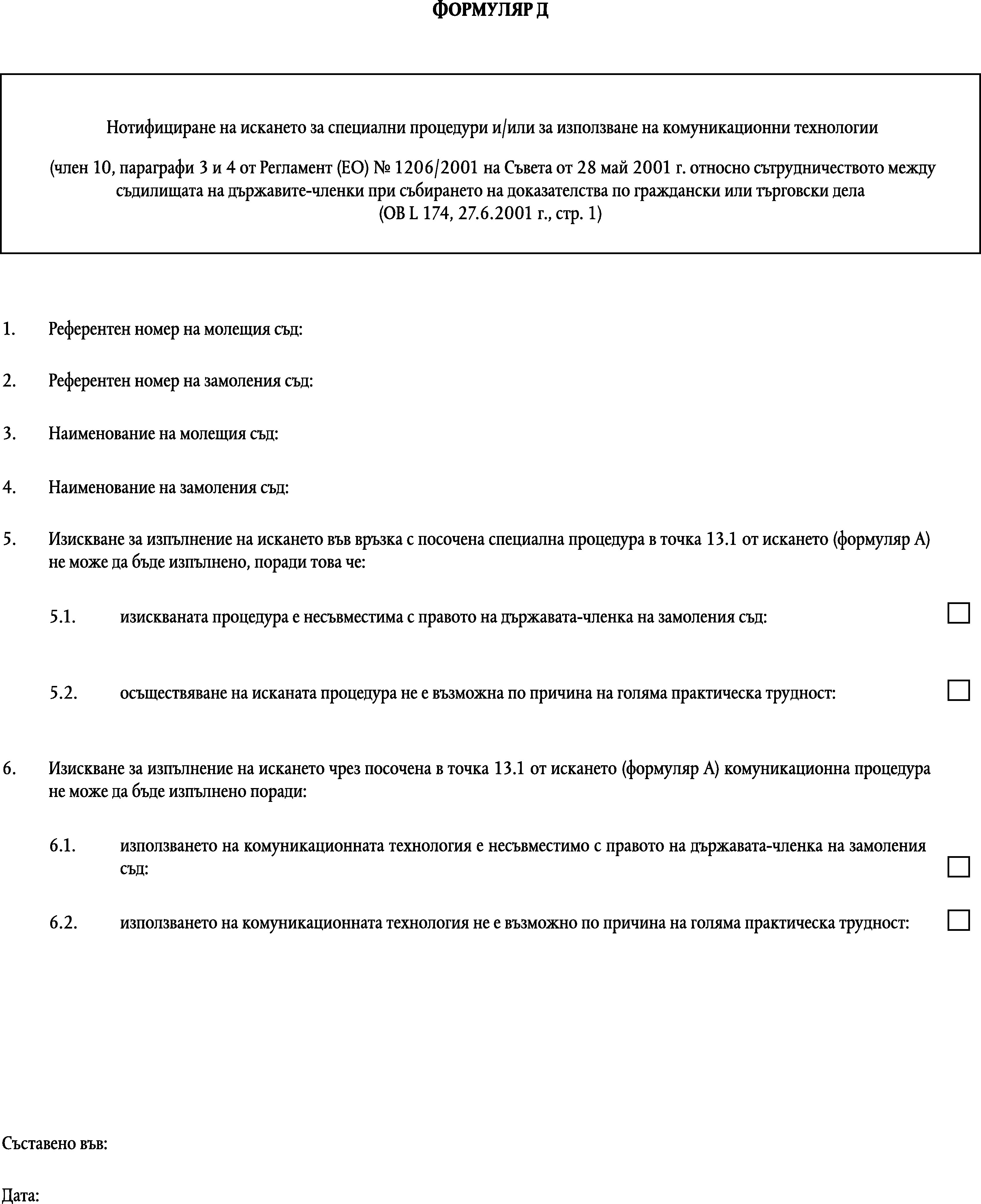 Ако замоленият съд не изпълни искането поради една от тези причини, той уведомява молещия съд чрез формуляр Д от приложението.