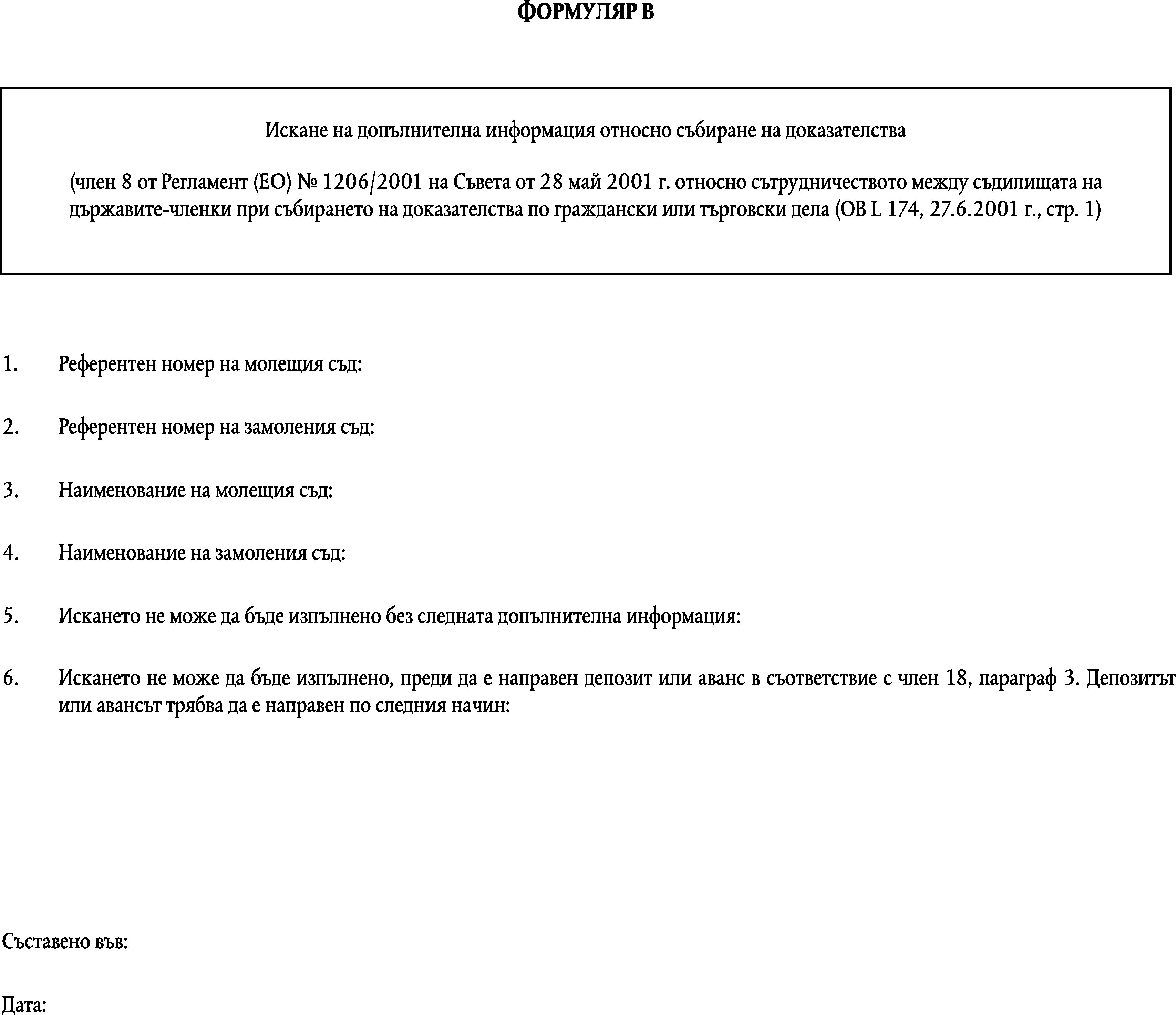 1. Ако искането не може да бъде изпълнено поради това, че то не съдържа цялата необходима информация съгласно член 4, замоленият съд незабавно информира молещия съд и най-късно в рамките на 30 дни от приемането на искането с използване на формуляр В от приложението, като иска от него да изпрати липсващата информация, която трябва да е посочена колкото е възможно по-точно.
