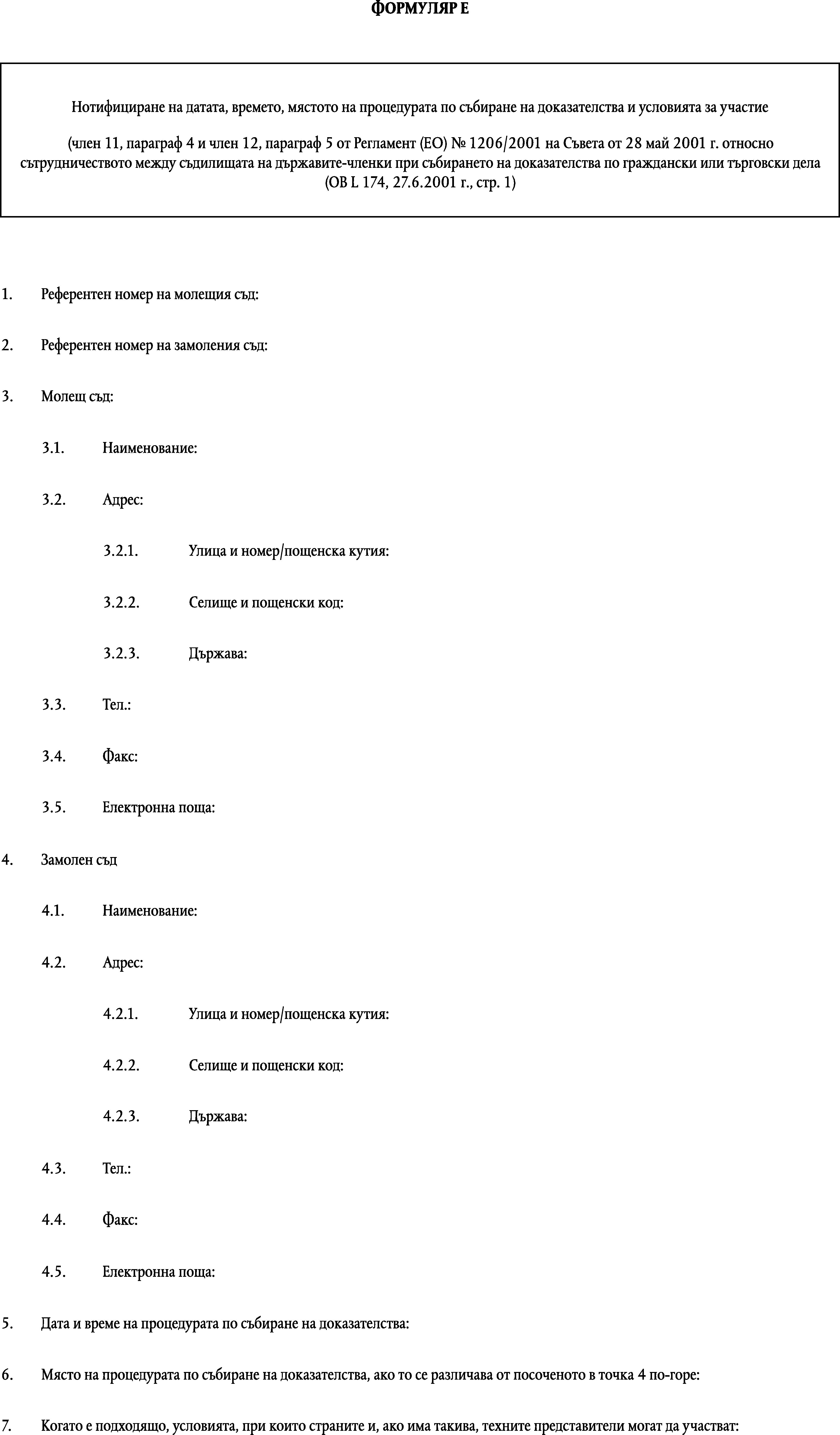 5. Замоленият съд съобщава на молещия съд времето, мястото и процедурата, която ще се използва, и когато е подходящо, за условията, при които представителите могат да участват, чрез използване на формуляр Е от приложението.