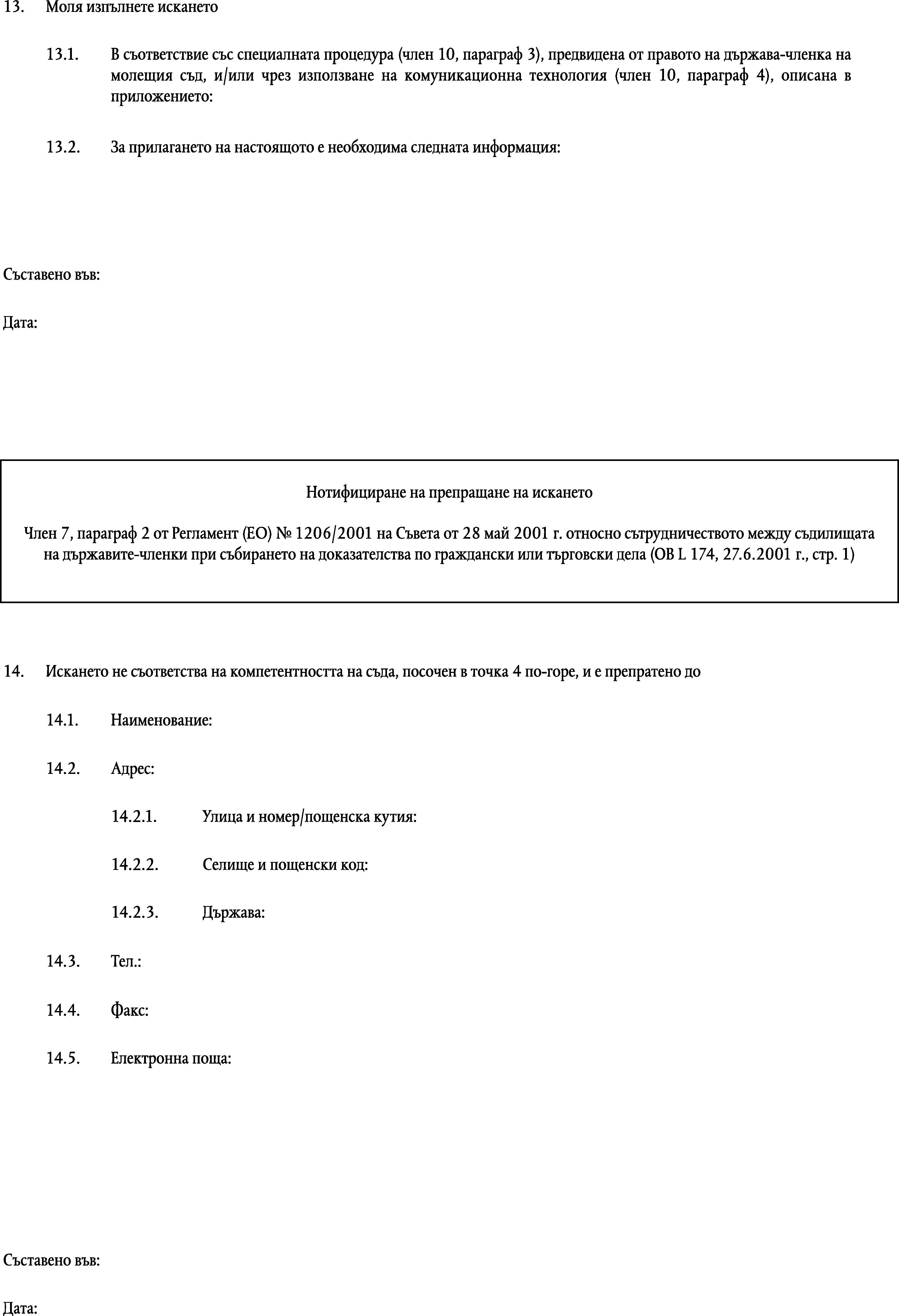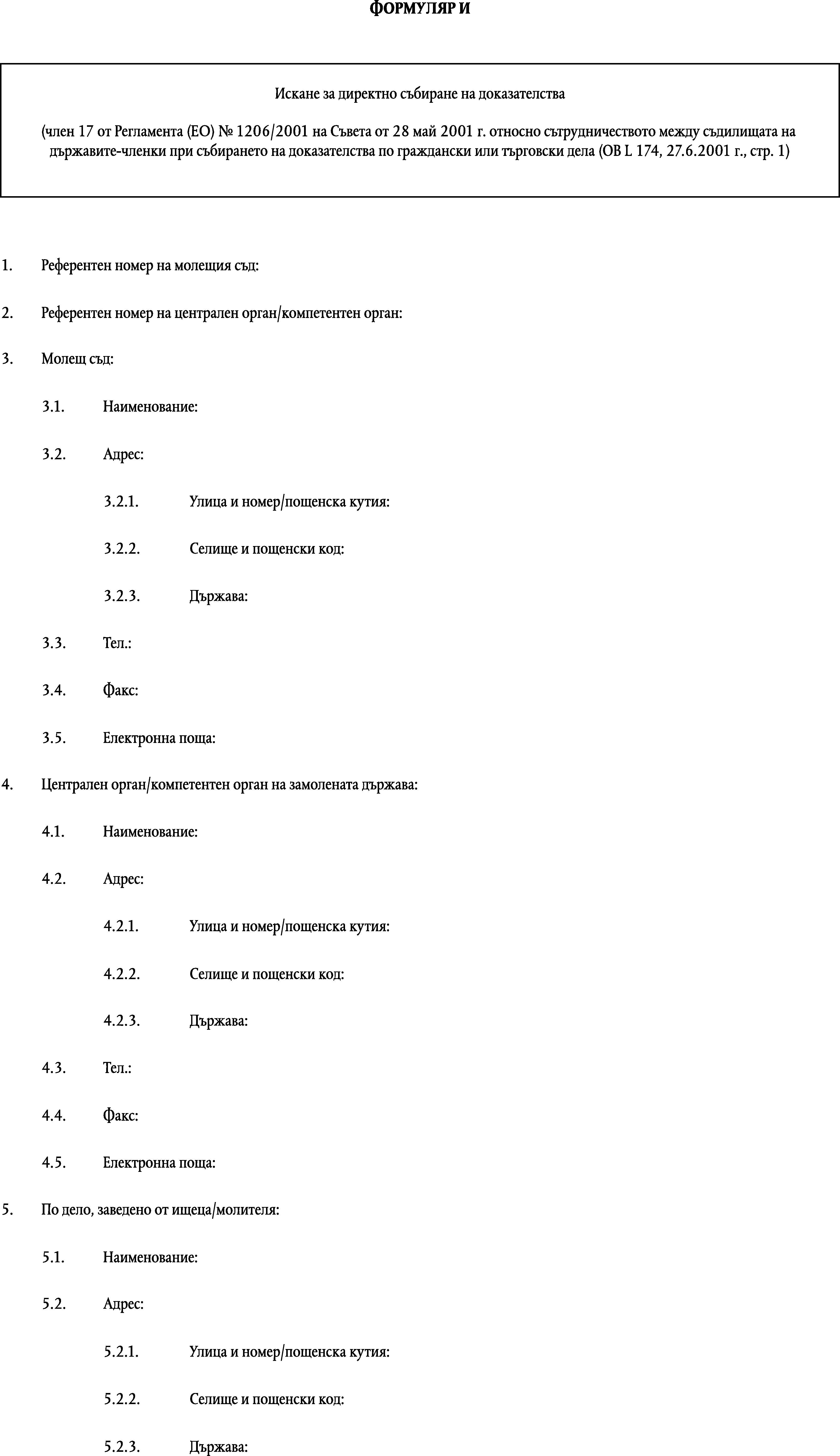 1. Когато съда иска директно да се съберат доказателства в друга държава-членка, той представя искане до централния орган или друг компетентен орган на тази държава, който е определен съгласно член 3, параграф 3, като за целта се използва формуляр И от приложението.