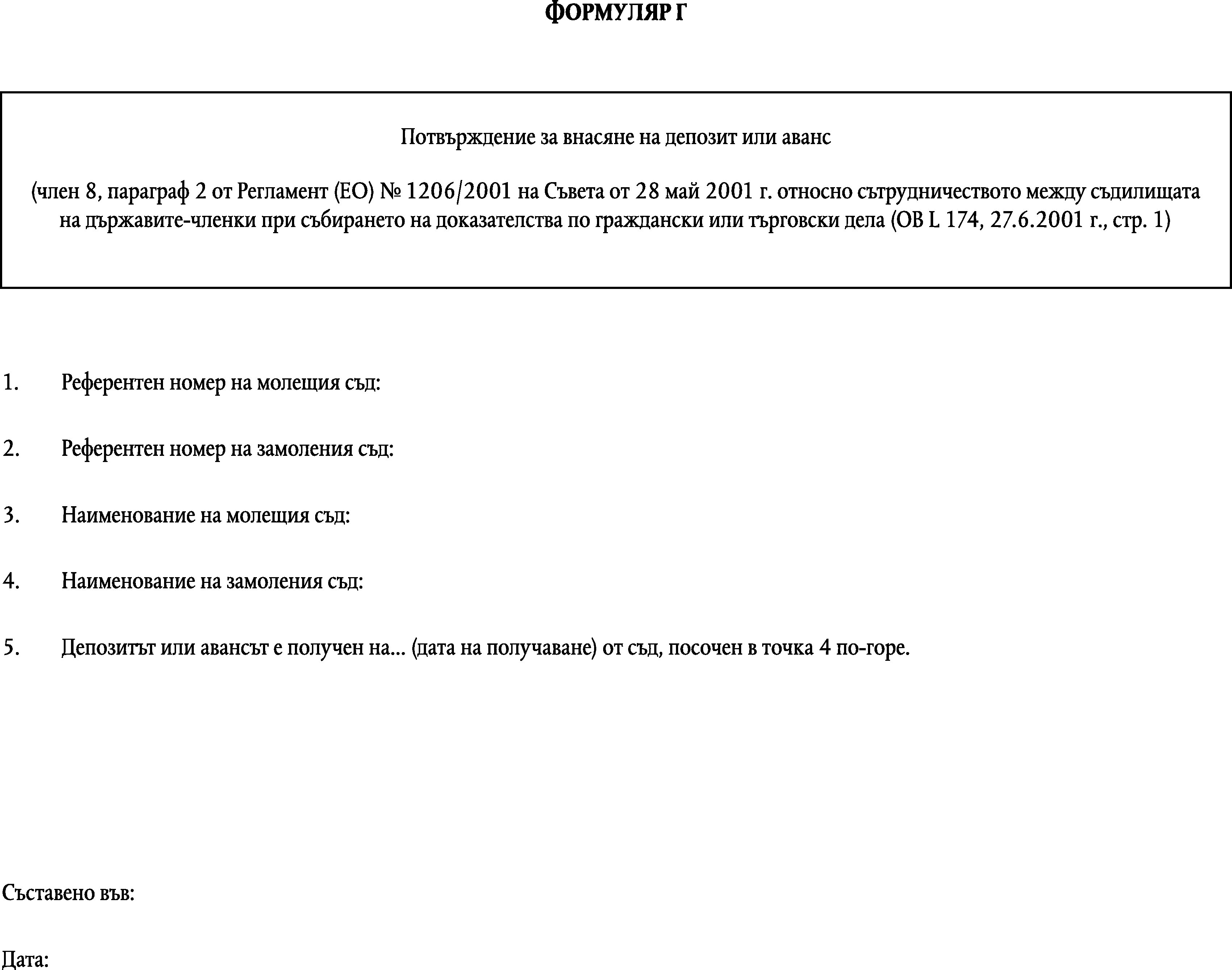 2. Ако искането не може да бъде изпълнено поради депозита или аванса, необходим в съответствие с член 18, параграф 3, замоленият съд незабавно информира за това молещия съд най-късно 30 дни от получаването на искането чрез използване на формуляр В от приложението и информира молещия съд как трябва да се направи депозитът или авансът. Замоленият съд незабавно потвърждава получаването на депозита или аванса най-късно 10 дни от получаването на депозита или аванса чрез използване на формуляр Г.