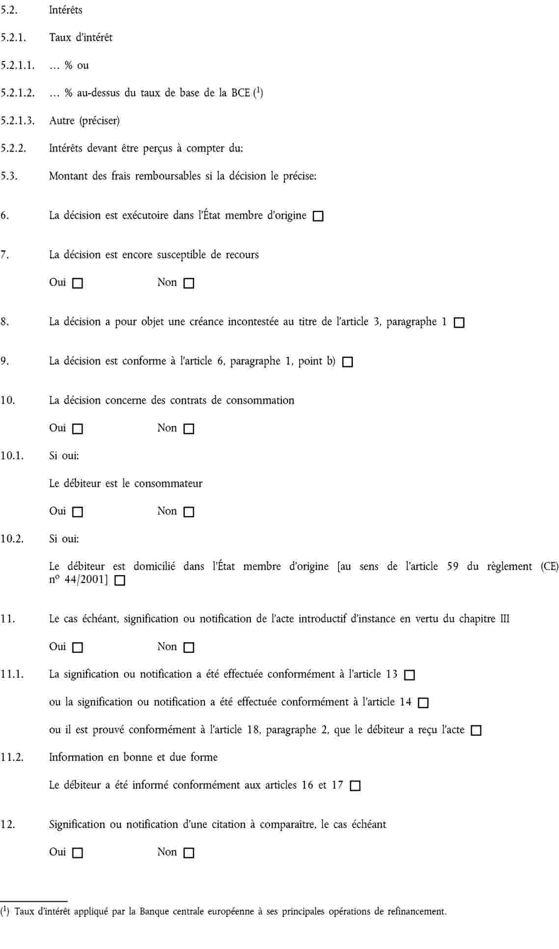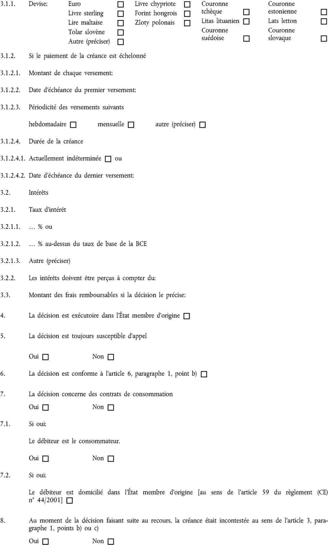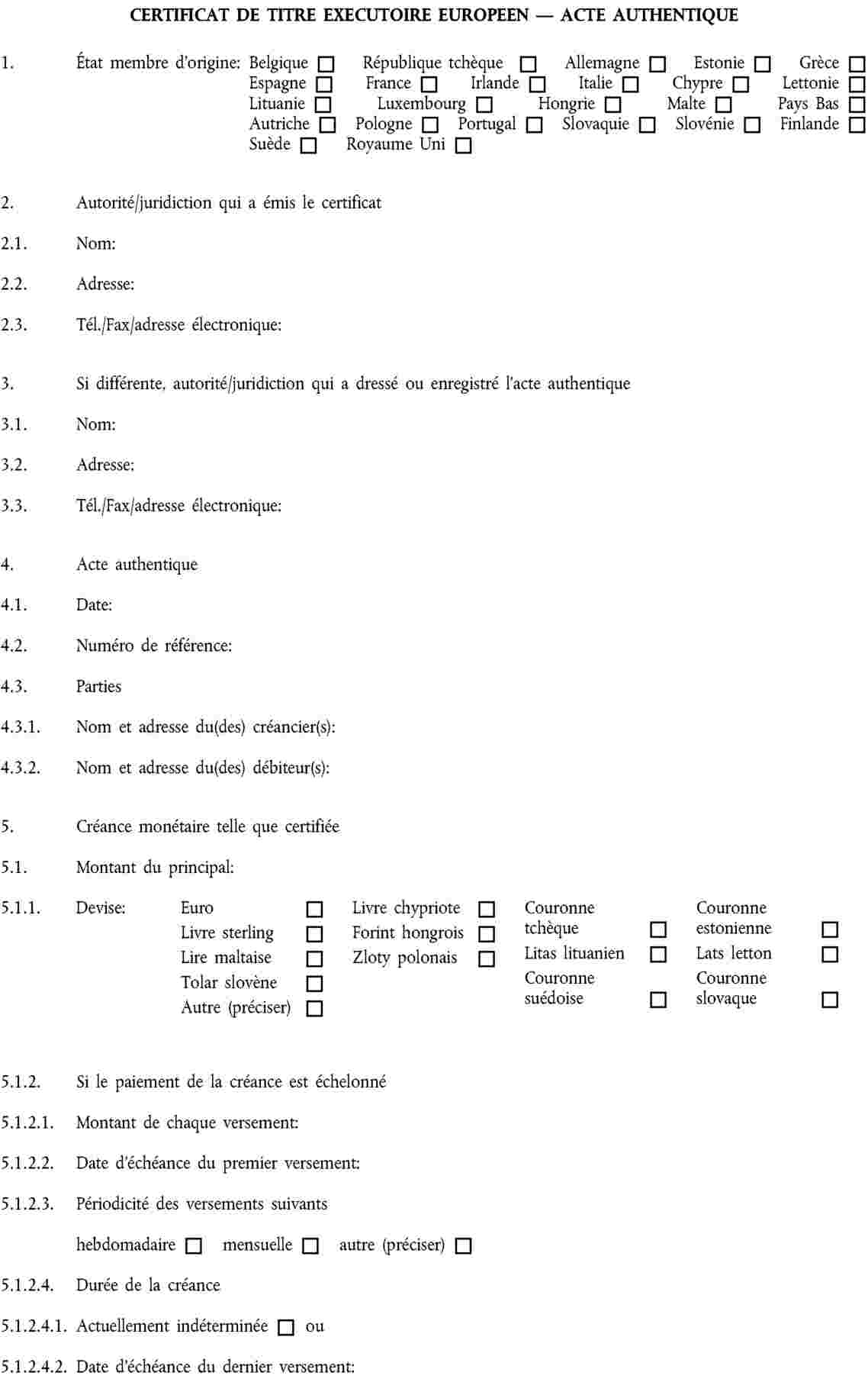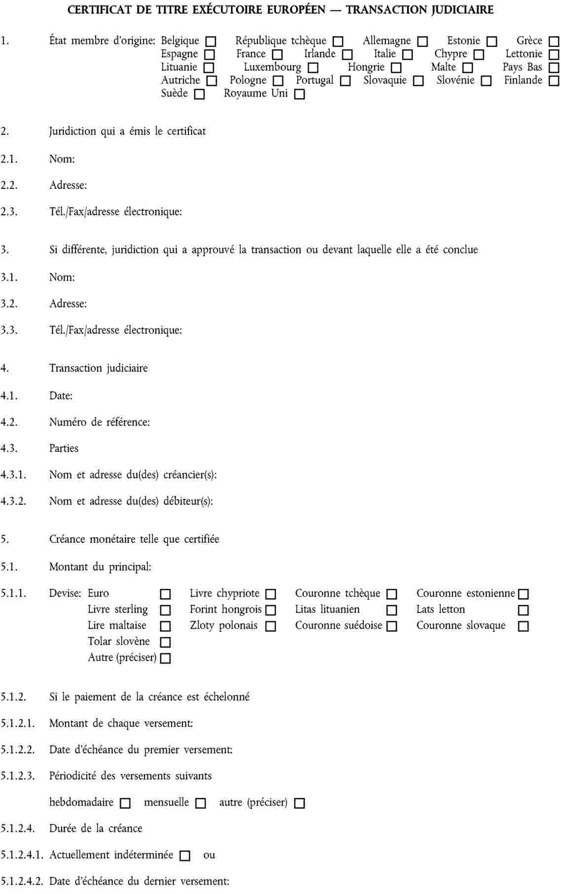 Les annexes I à VI du règlement (CE) n o 805/2004 contiennent plusieurs formulaires types à utiliser dans le cadre de la procédure de titre exécutoire européen pour les créances incontestées. |