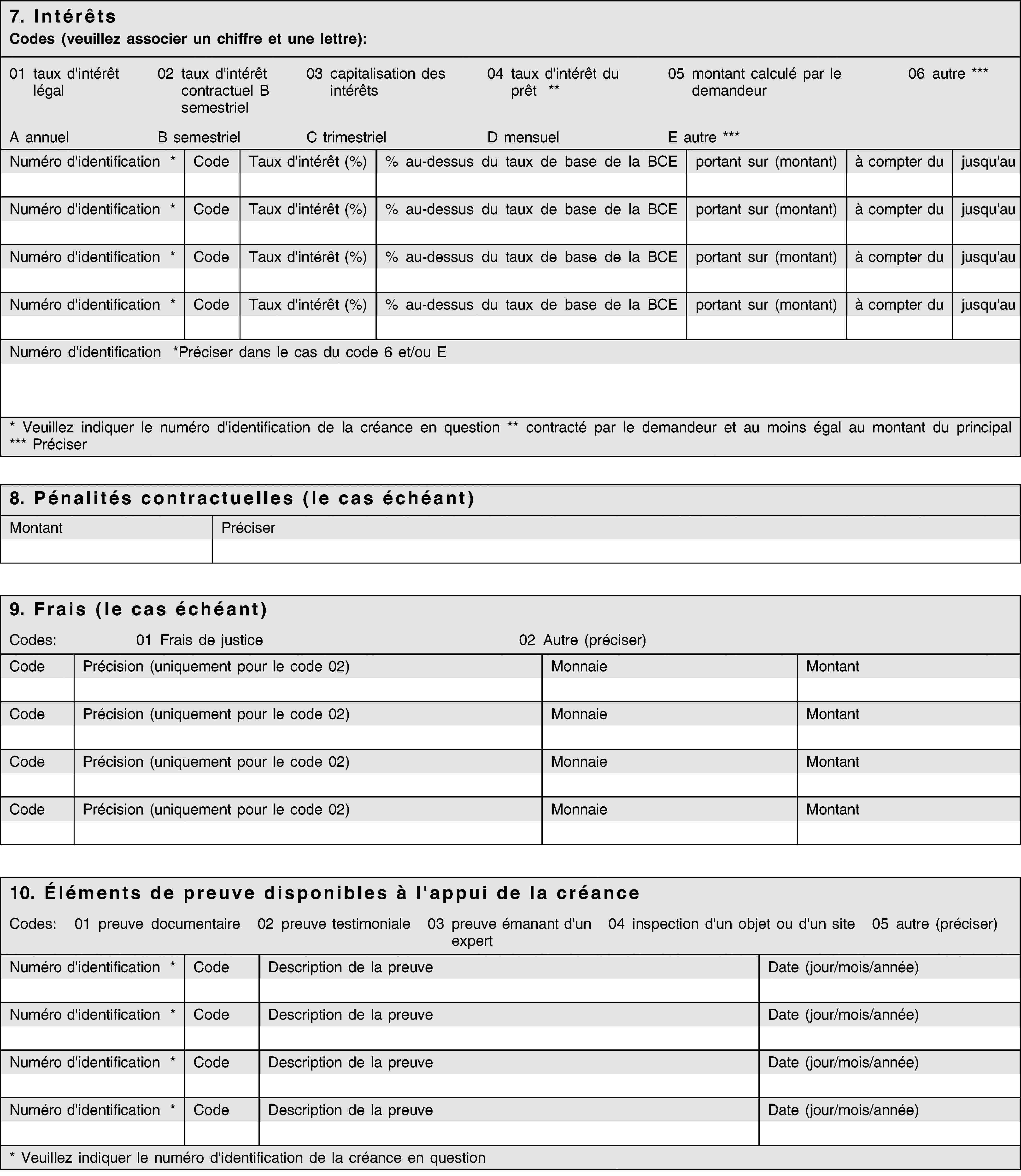 Dans ce cadre, le demandeur devrait être tenu de fournir une description des éléments de preuve à l'appui de la créance. À cet effet, le formulaire de demande devrait comporter une liste aussi exhaustive que possible des éléments de preuve habituellement produits à l'appui de créances pécuniaires. |