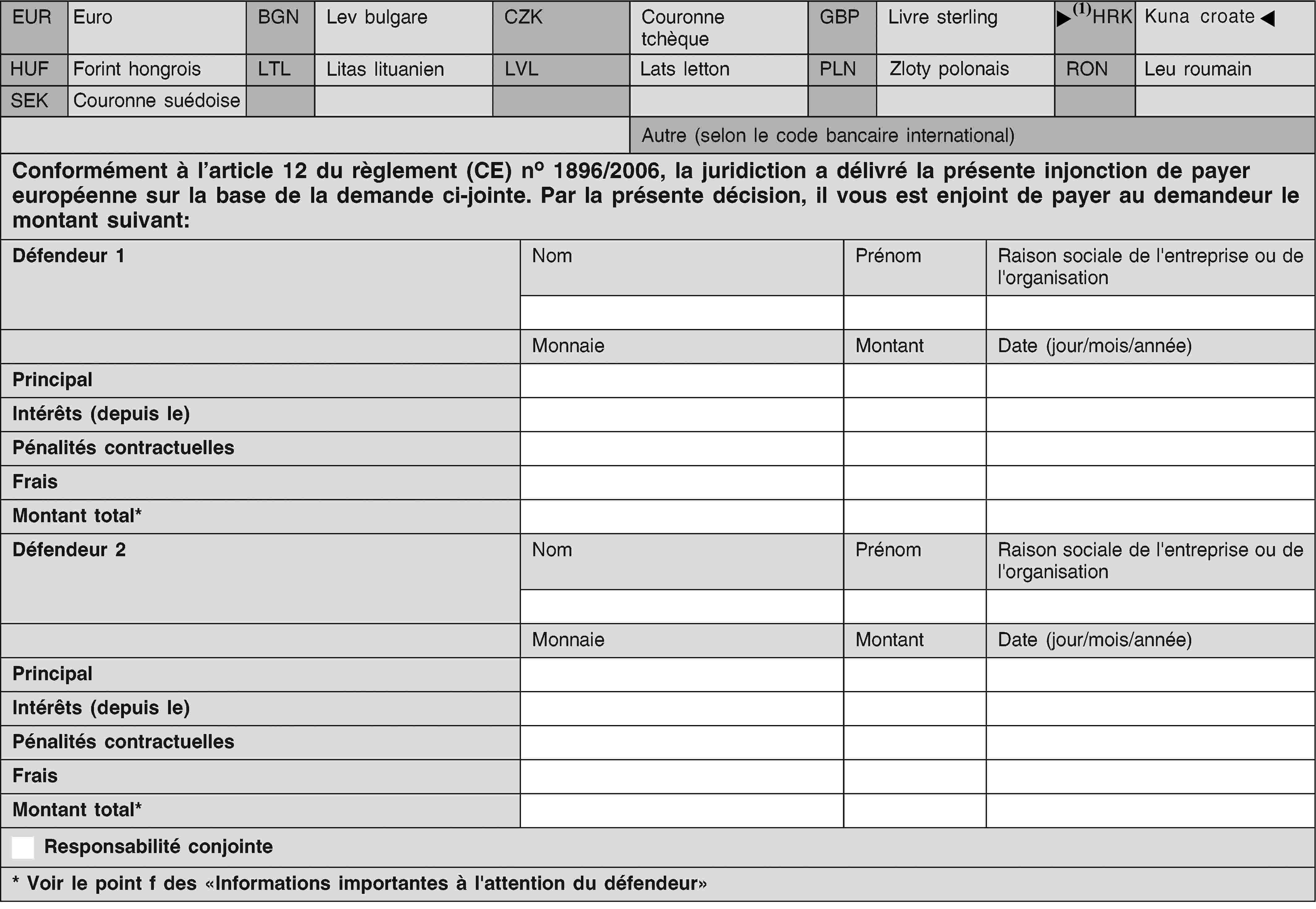 1. Le défendeur peut former opposition à l'injonction de payer européenne auprès de la juridiction d'origine au moyen du formulaire type F figurant dans l'annexe VI, qui lui est transmis en même temps que l'injonction de payer européenne.