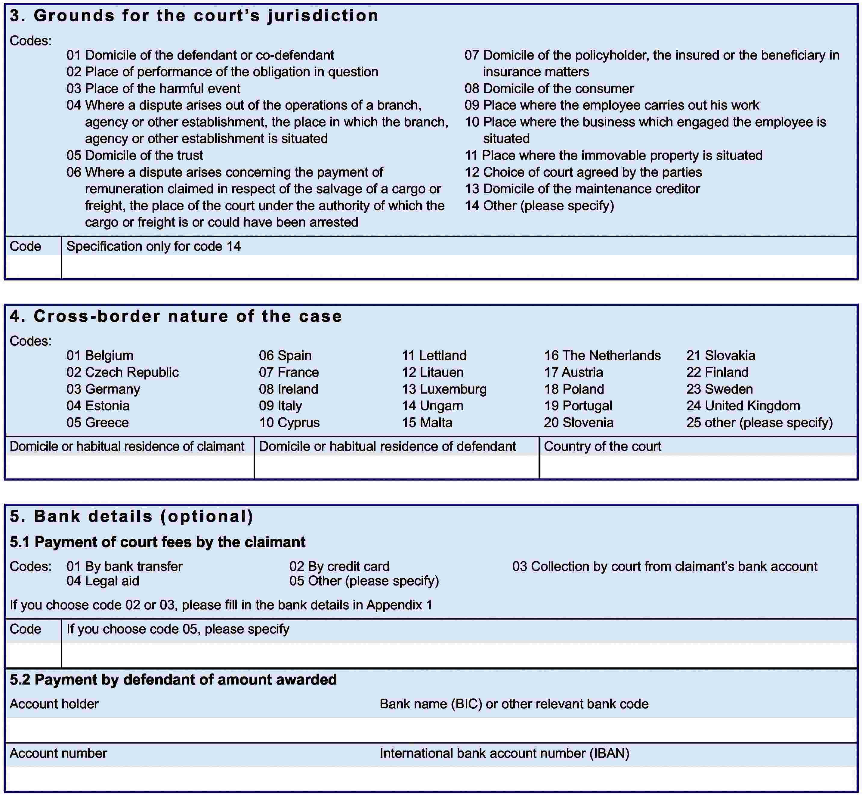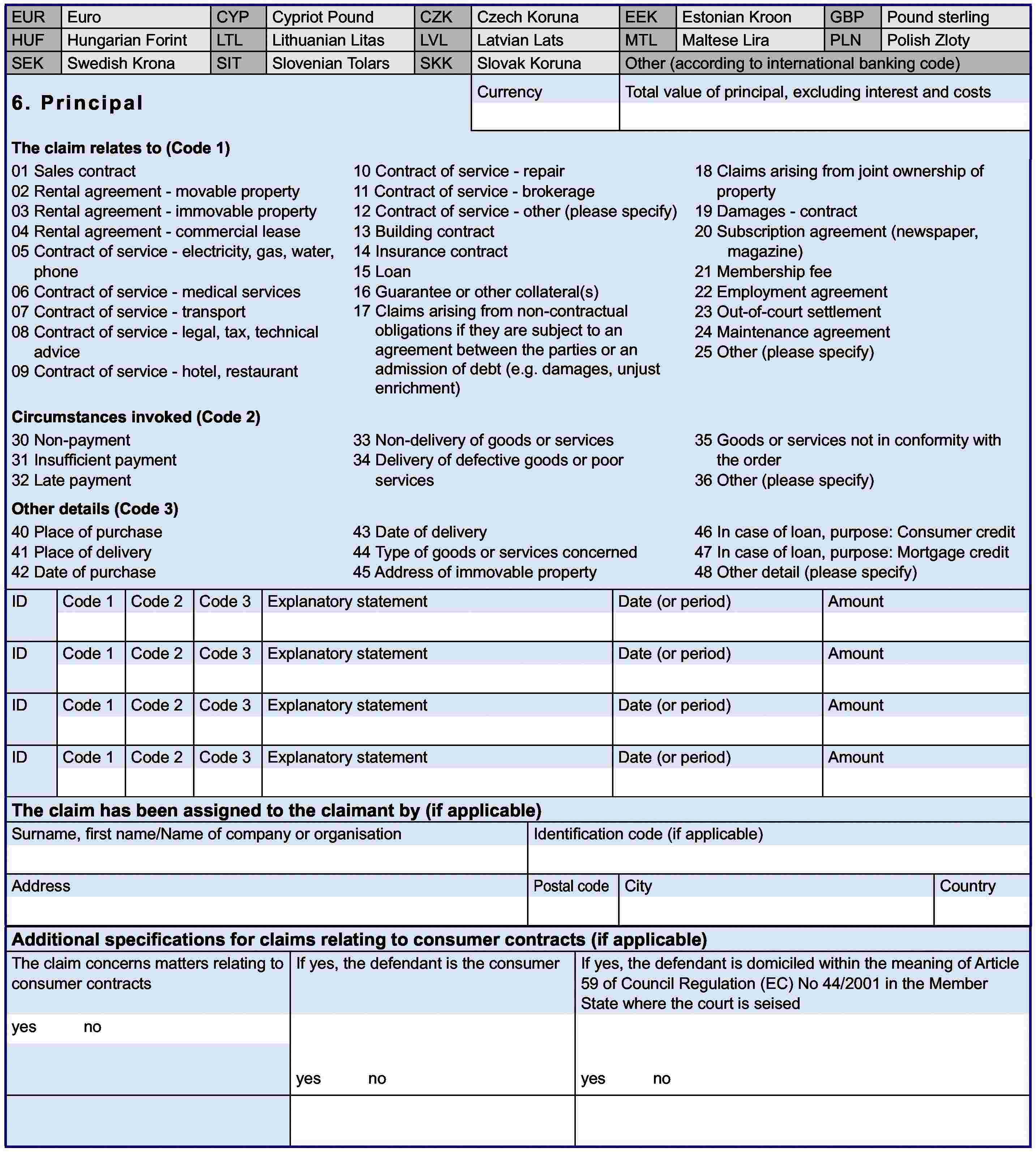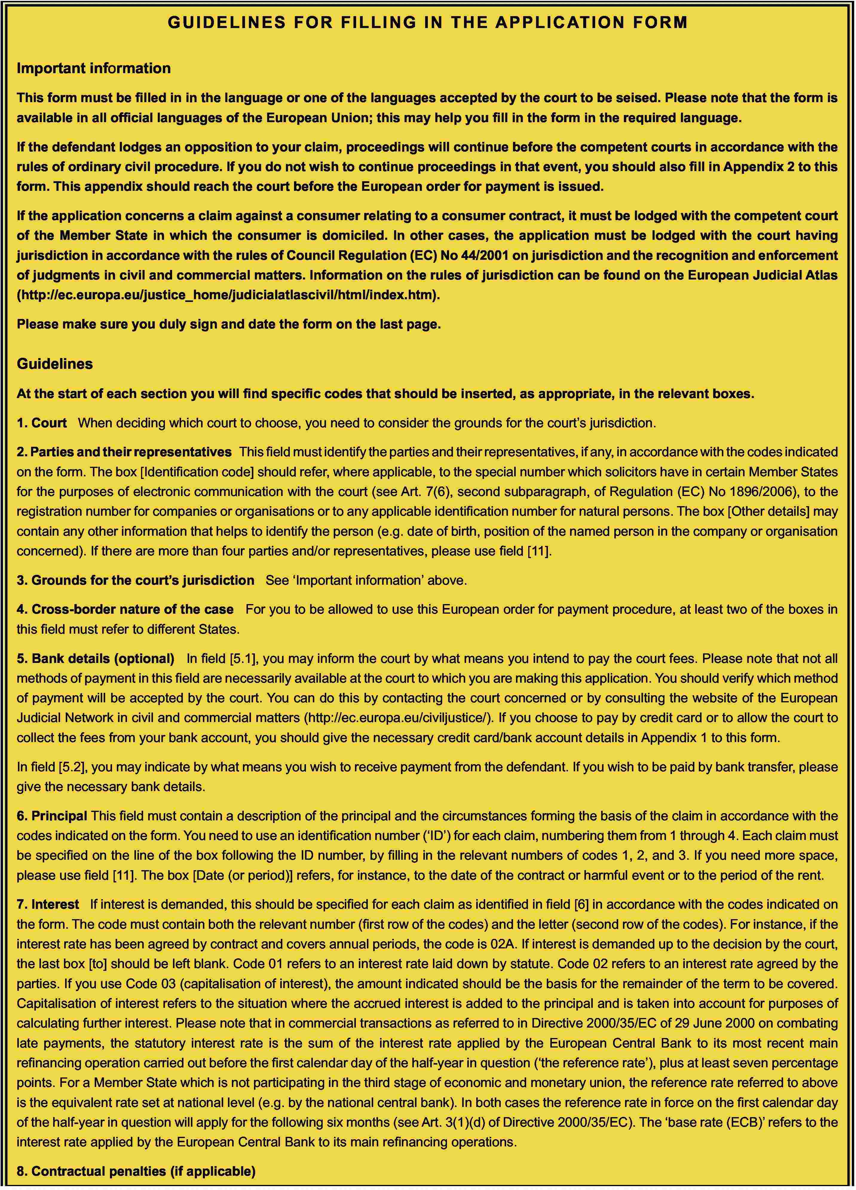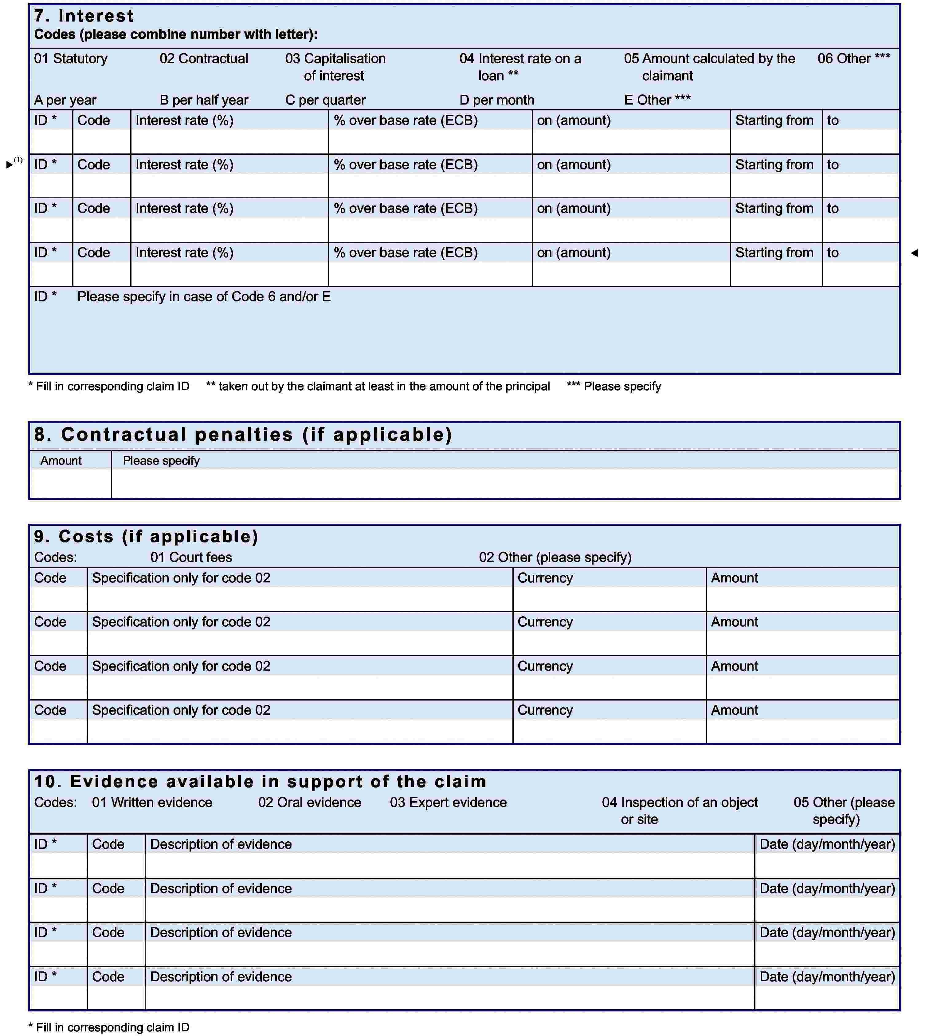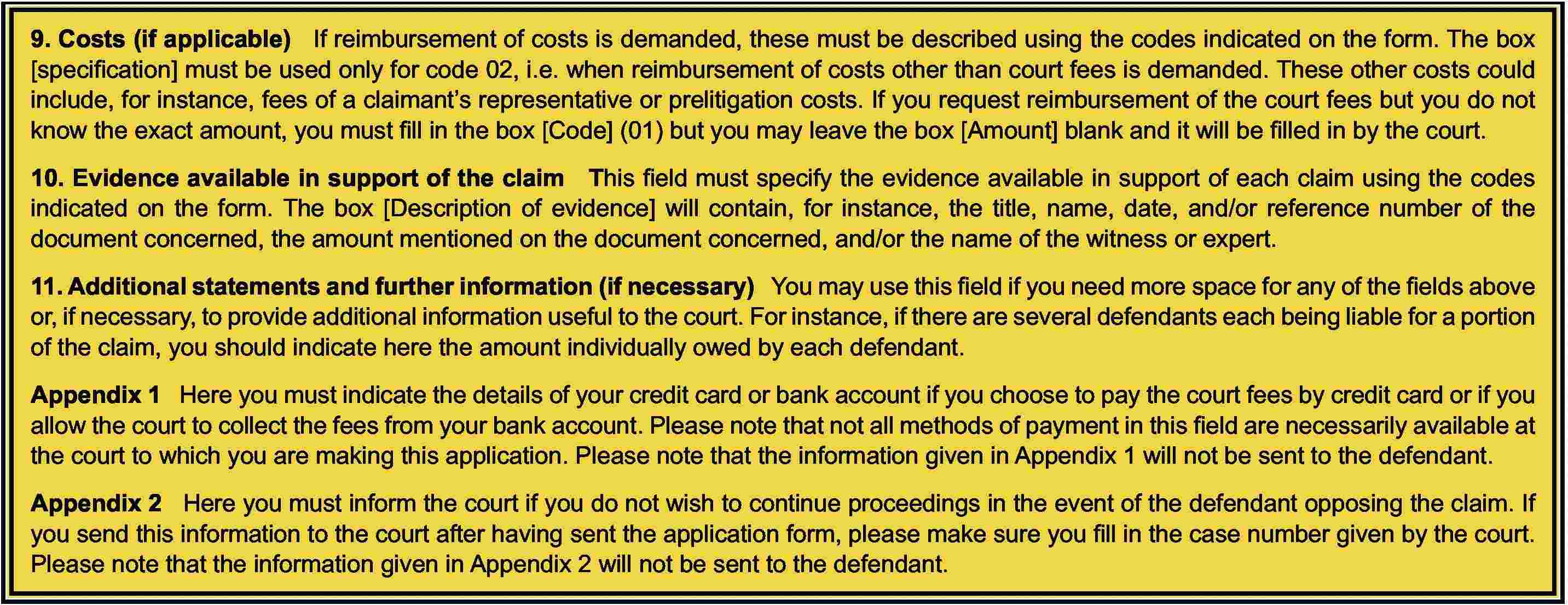 In that context, it should be compulsory for the claimant to include a description of evidence supporting the claim. For that purpose the application form should include as exhaustive a list as possible of types of evidence that are usually produced in support of pecuniary claims. |