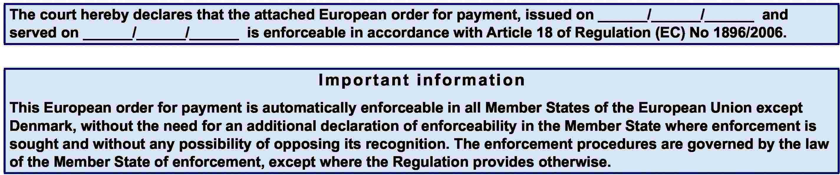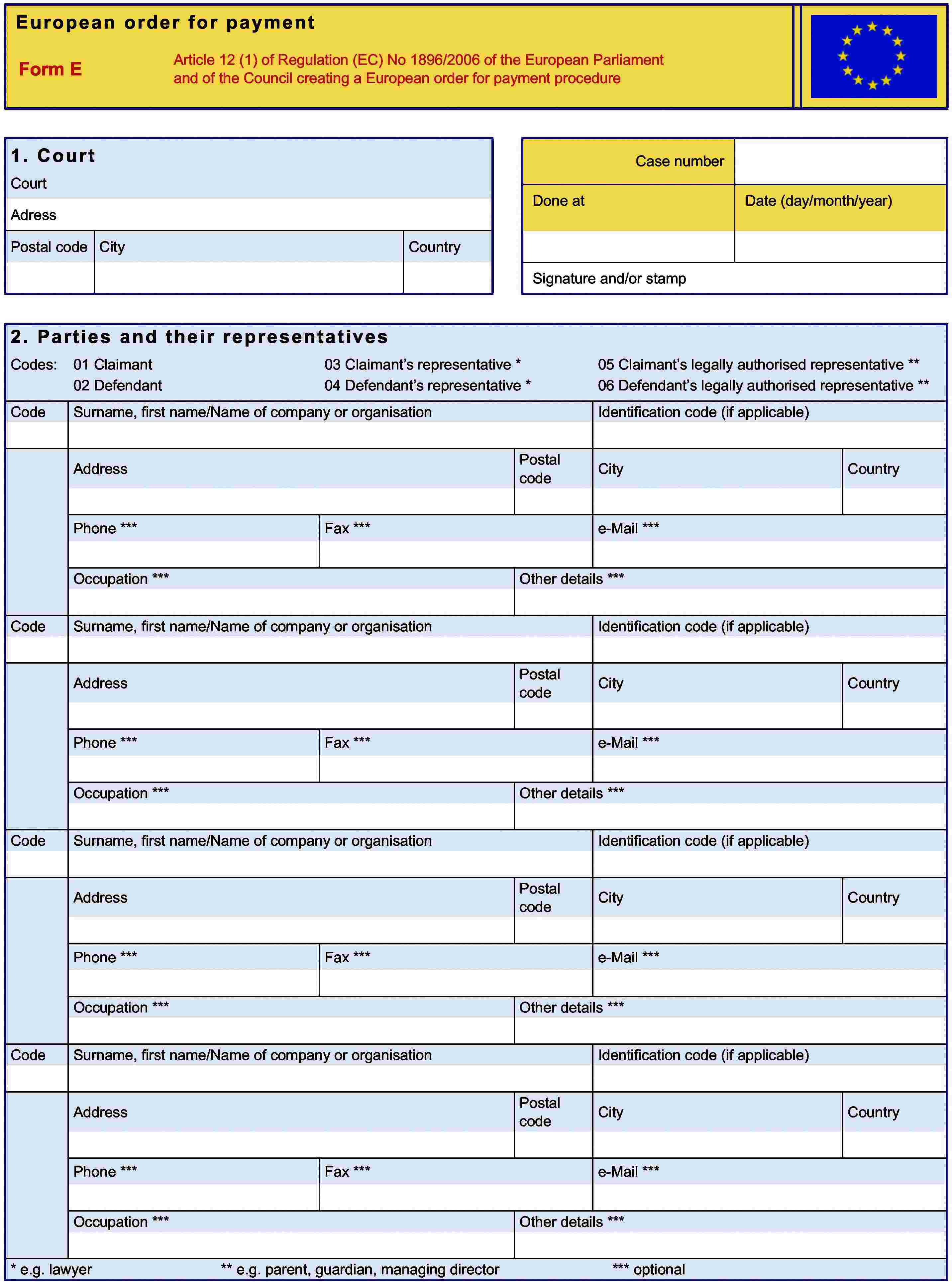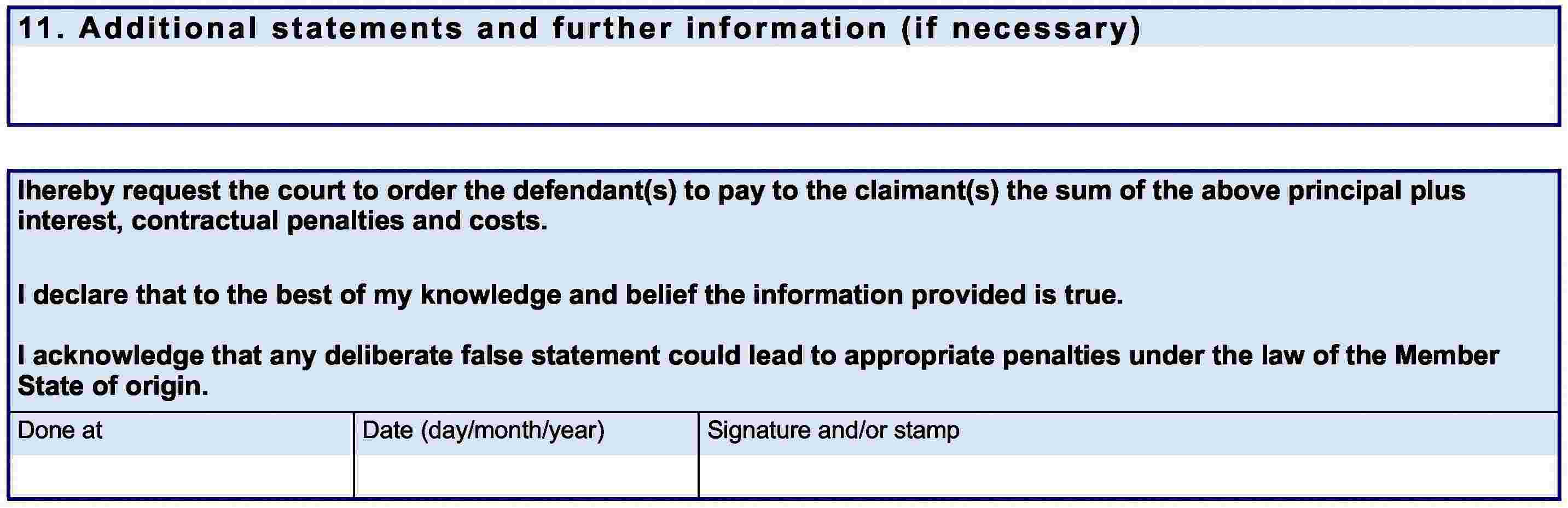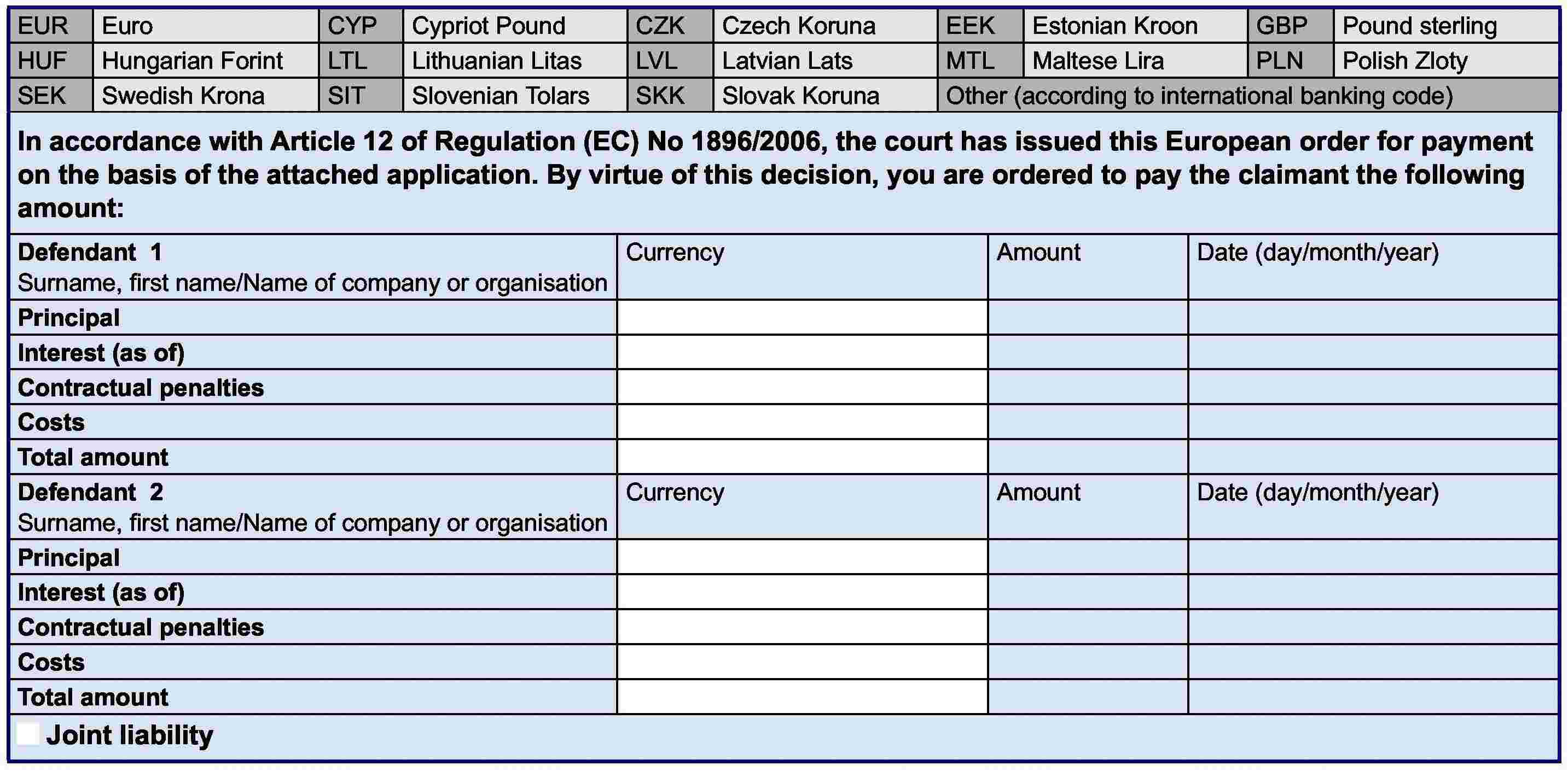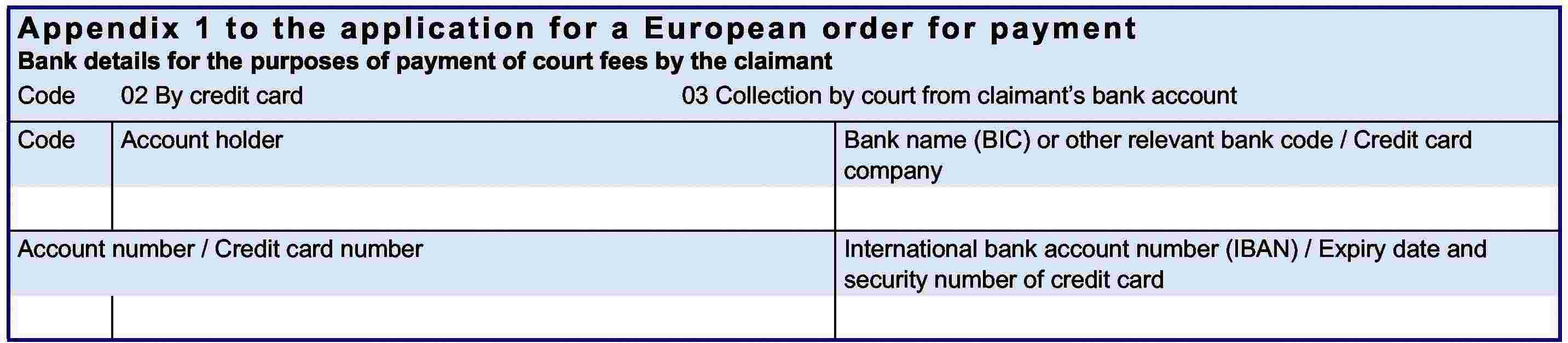 In that context, it should be compulsory for the claimant to include a description of evidence supporting the claim. For that purpose the application form should include as exhaustive a list as possible of types of evidence that are usually produced in support of pecuniary claims. |