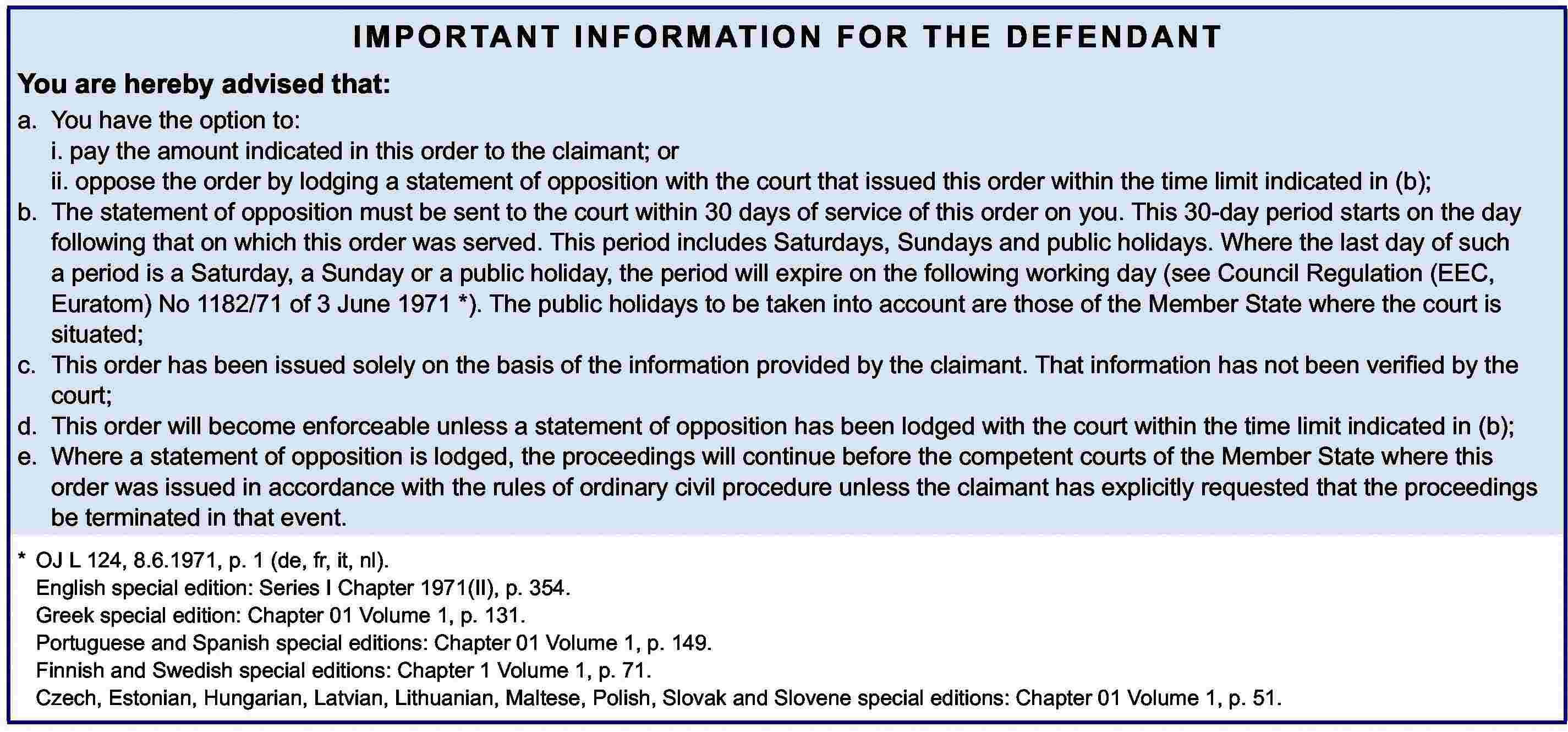 The European order for payment should apprise the defendant of his options to pay the amount awarded to the claimant or to send a statement of opposition within a time limit of 30 days if he wishes to contest the claim. In addition to being provided with full information concerning the claim as supplied by the claimant, the defendant should be advised of the legal significance of the European order for payment and in particular of the consequences of leaving the claim uncontested. |