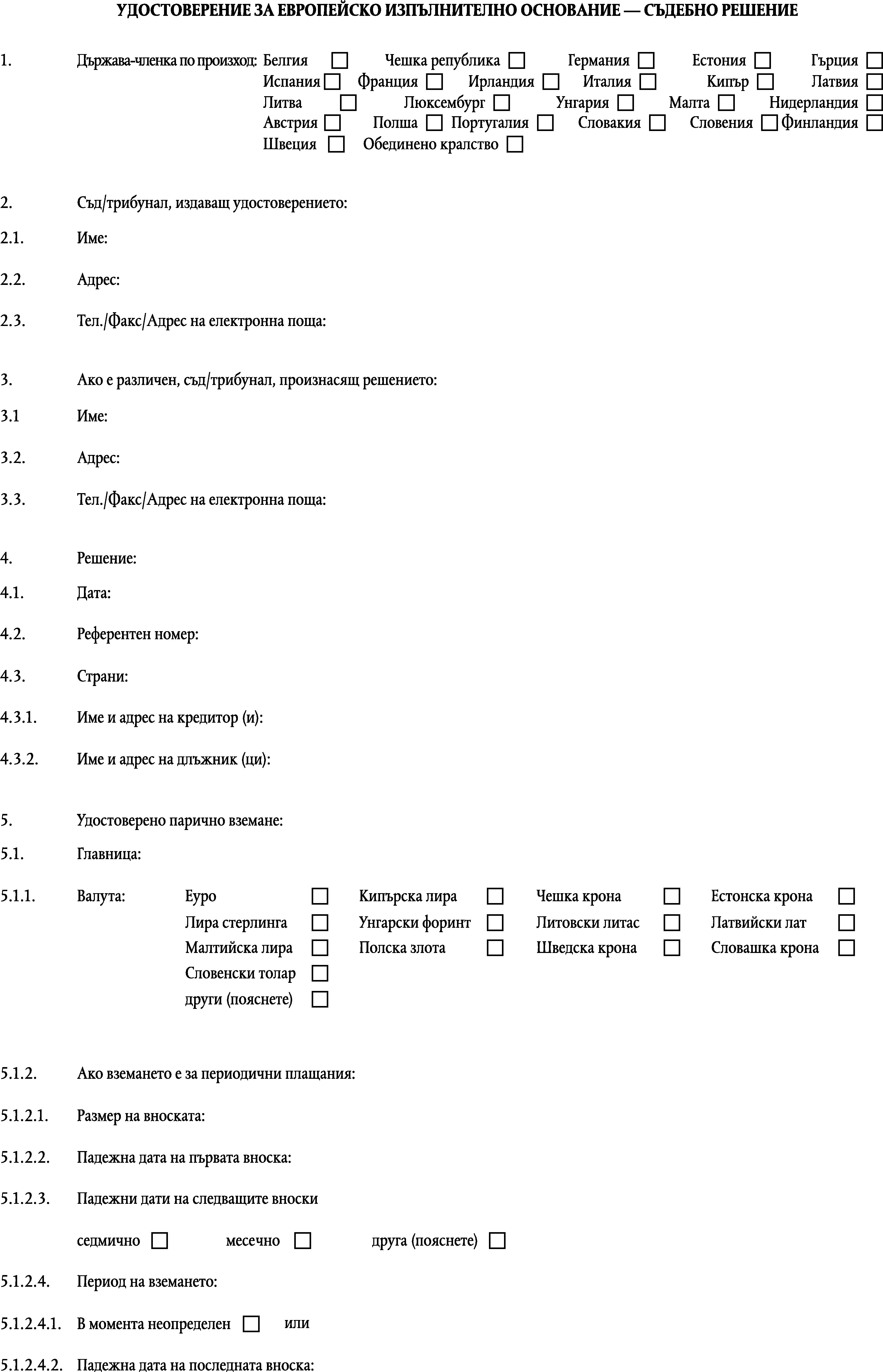 1. Удостоверение за европейско изпълнително основание се издава във формата на стандартен формуляр, както е посочен в приложение I.