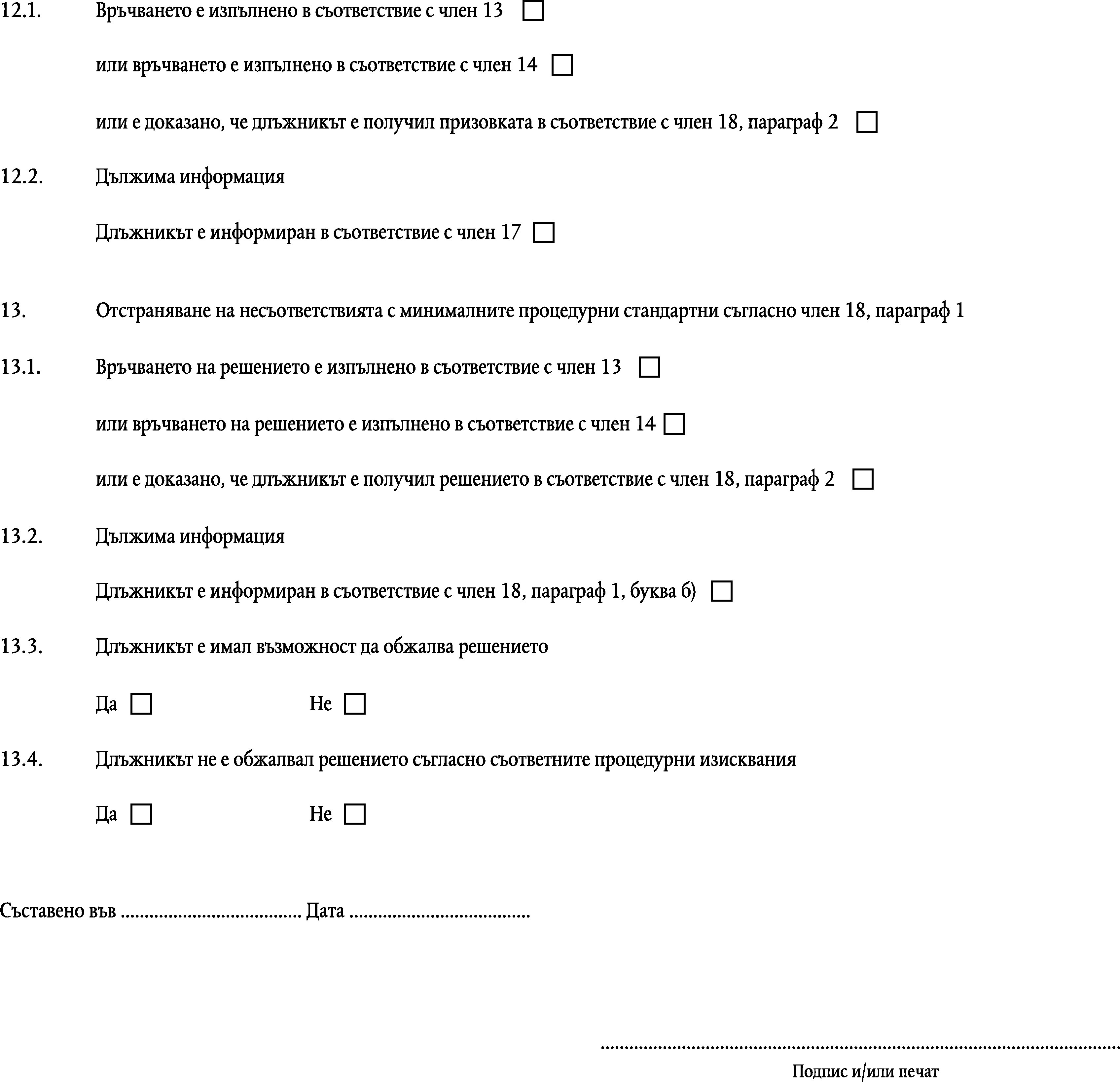 1. Когато процесът в държавата-членка по произход не отговаря на процесуалните изисквания по членовете от 13 до 17, такова неспазване на изискванията се преодолява и решение се удостоверява като европейско изпълнително основание, ако: