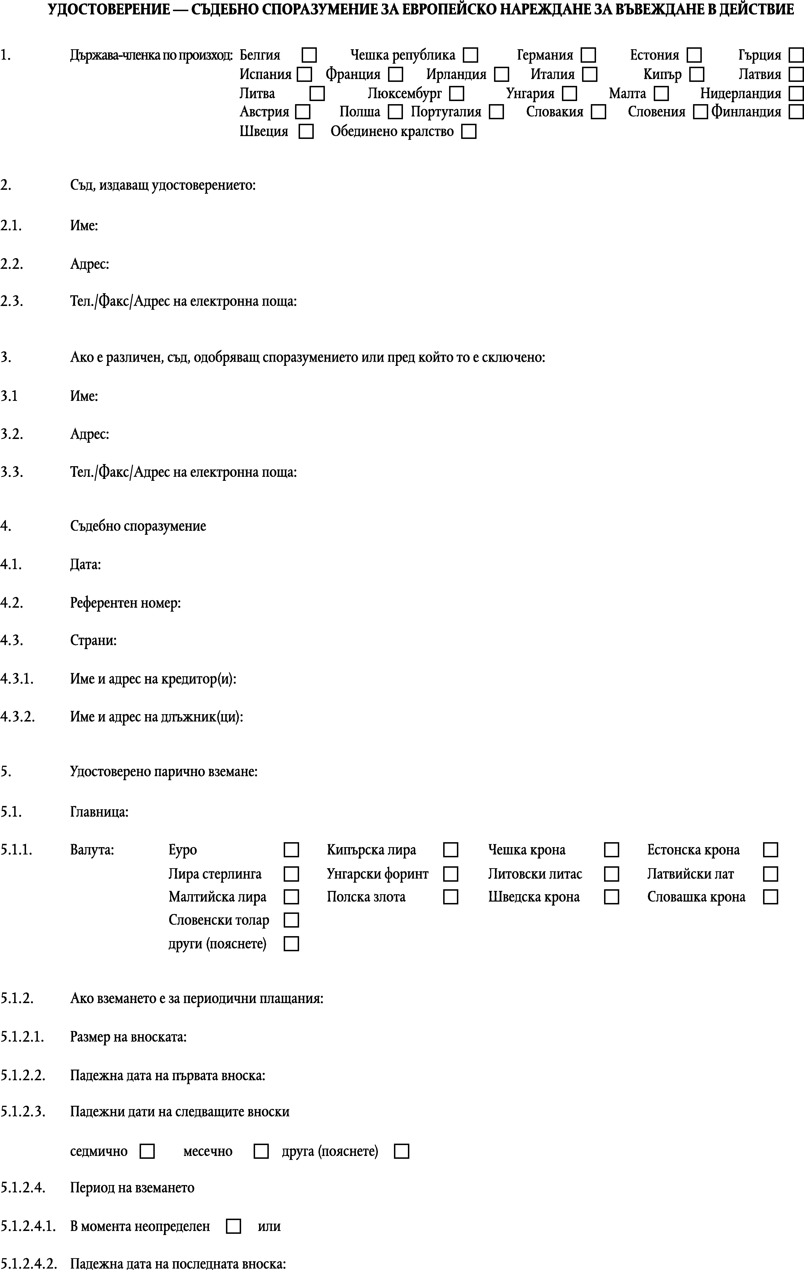1. Спогодба, която се отнася до вземане по смисъла на член 4, параграф 2, което е било одобрено от съда или е сключено пред съда в хода на производството, и която е приложима в държава-членка, в която е била одобрена или сключена, при молба до съда, който я е одобрил или пред който е сключена, може да се удостовери като европейско изпълнително основание чрез стандартния формуляр от приложение II.