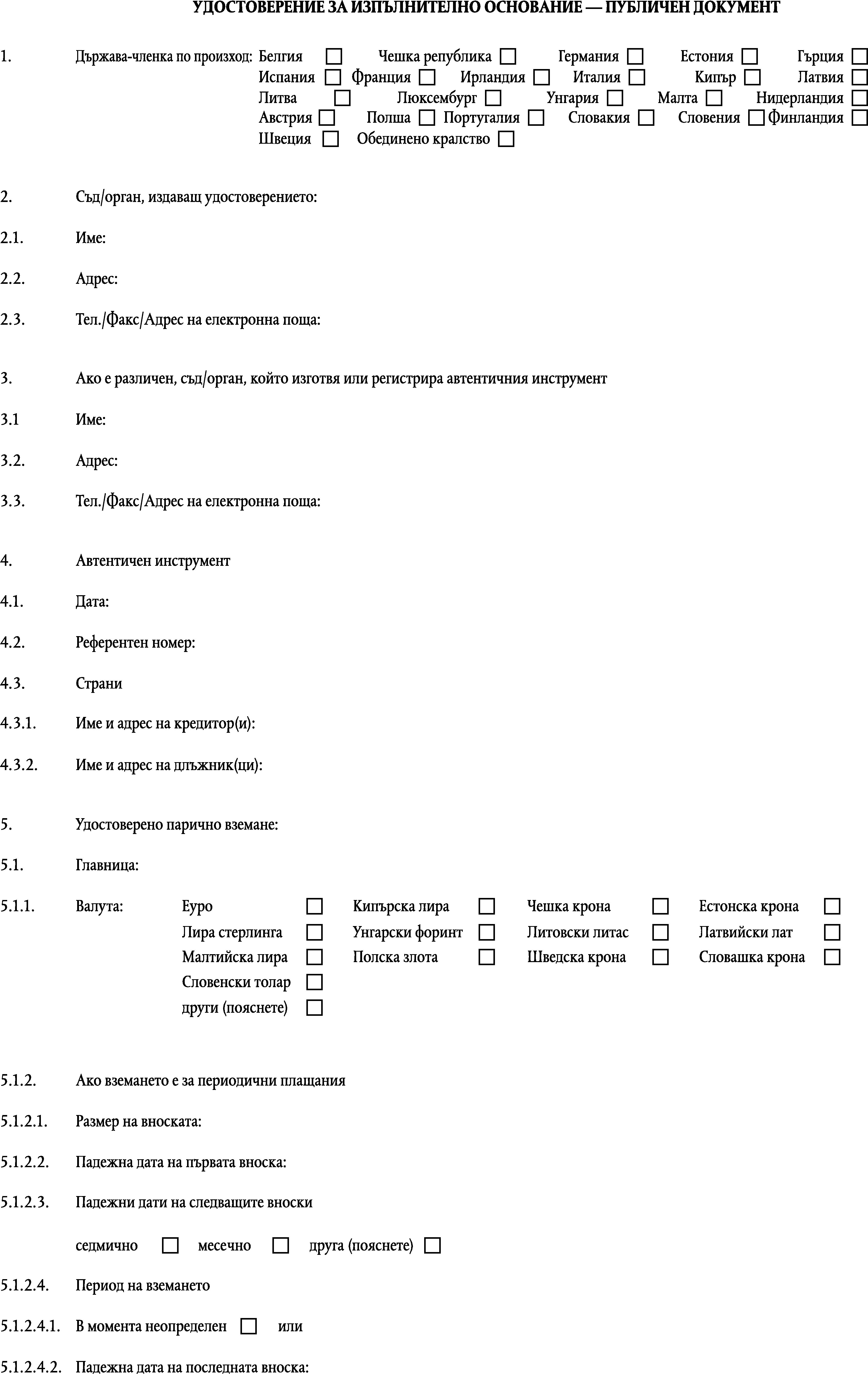 1. Публичен документ относно вземане по смисъла на член 4, параграф 2 е изпълняем в държавата-членка при молба до посочения орган на държавата-членка по произход и се удостоверява като европейско изпълнително основание чрез стандартния формуляр от приложение III.