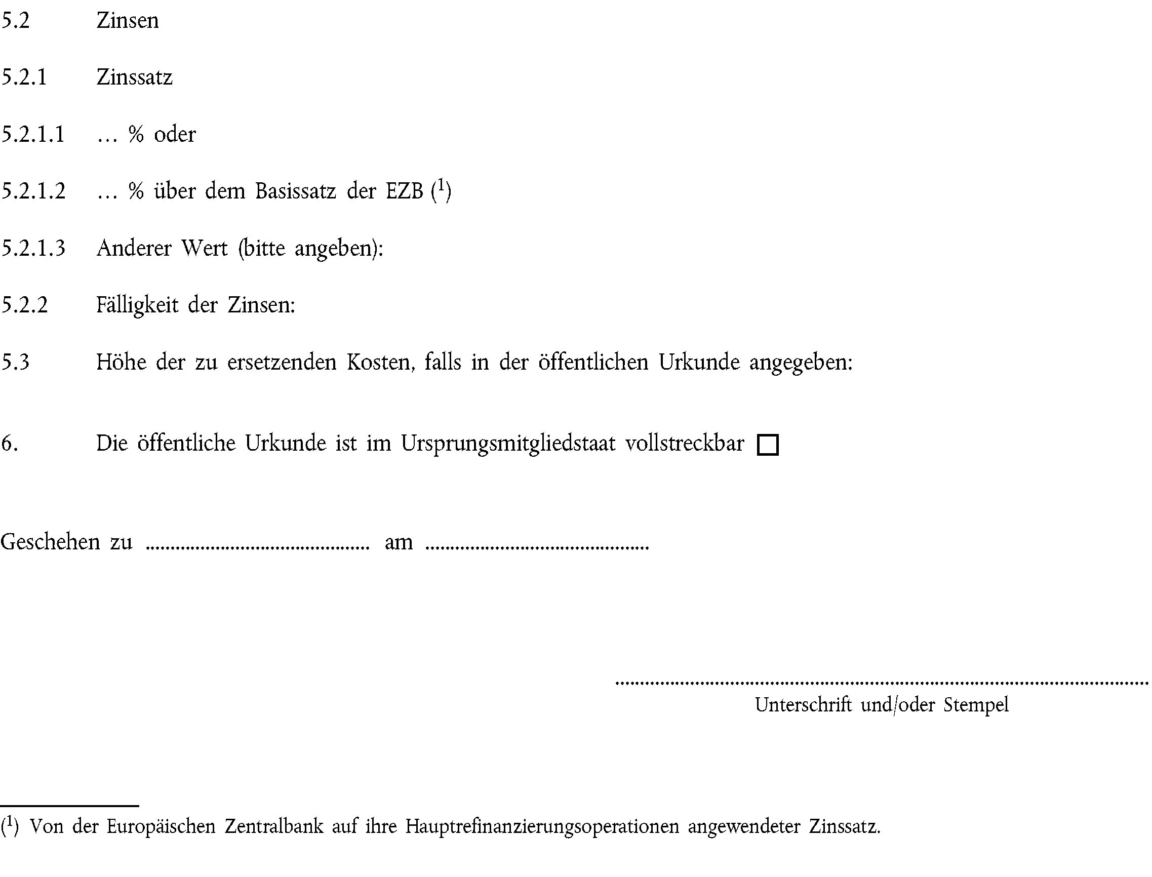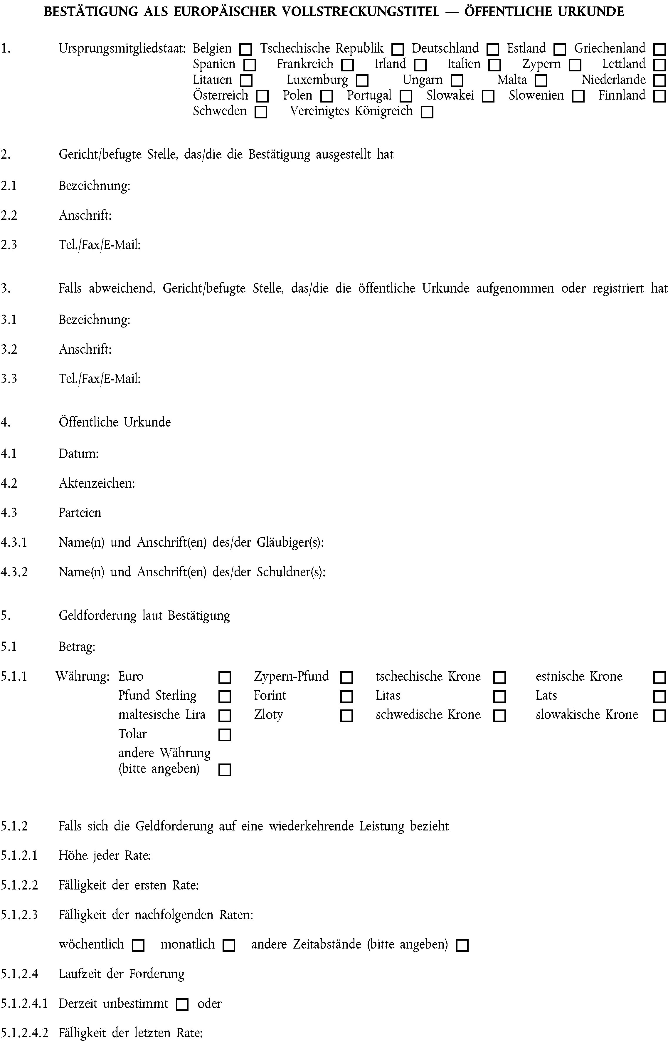 (1) Eine öffentliche Urkunde über eine Forderung im Sinne von Artikel 4 Absatz 2, die in einem Mitgliedstaat vollstreckbar ist, wird auf Antrag an die vom Ursprungsmitgliedstaat bestimmte Stelle unter Verwendung des Formblatts in Anhang III als Europäischer Vollstreckungstitel bestätigt.