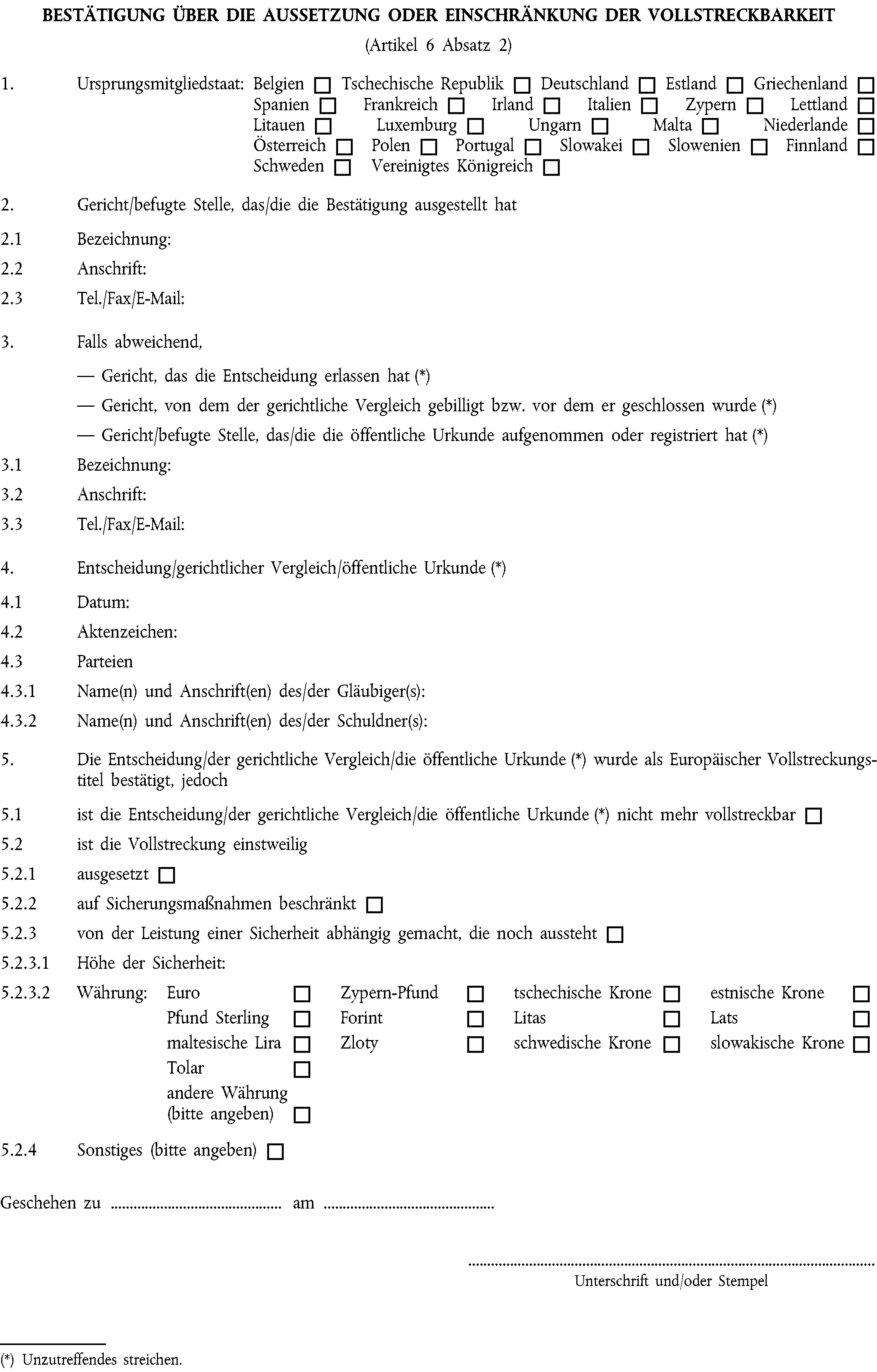 (2) Ist eine als Europäischer Vollstreckungstitel bestätigte Entscheidung nicht mehr vollstreckbar oder wurde ihre Vollstreckbarkeit ausgesetzt oder eingeschränkt, so wird auf jederzeitigen Antrag an das Ursprungsgericht unter Verwendung des Formblatts in Anhang IV eine Bestätigung der Nichtvollstreckbarkeit bzw. der Beschränkung der Vollstreckbarkeit ausgestellt.