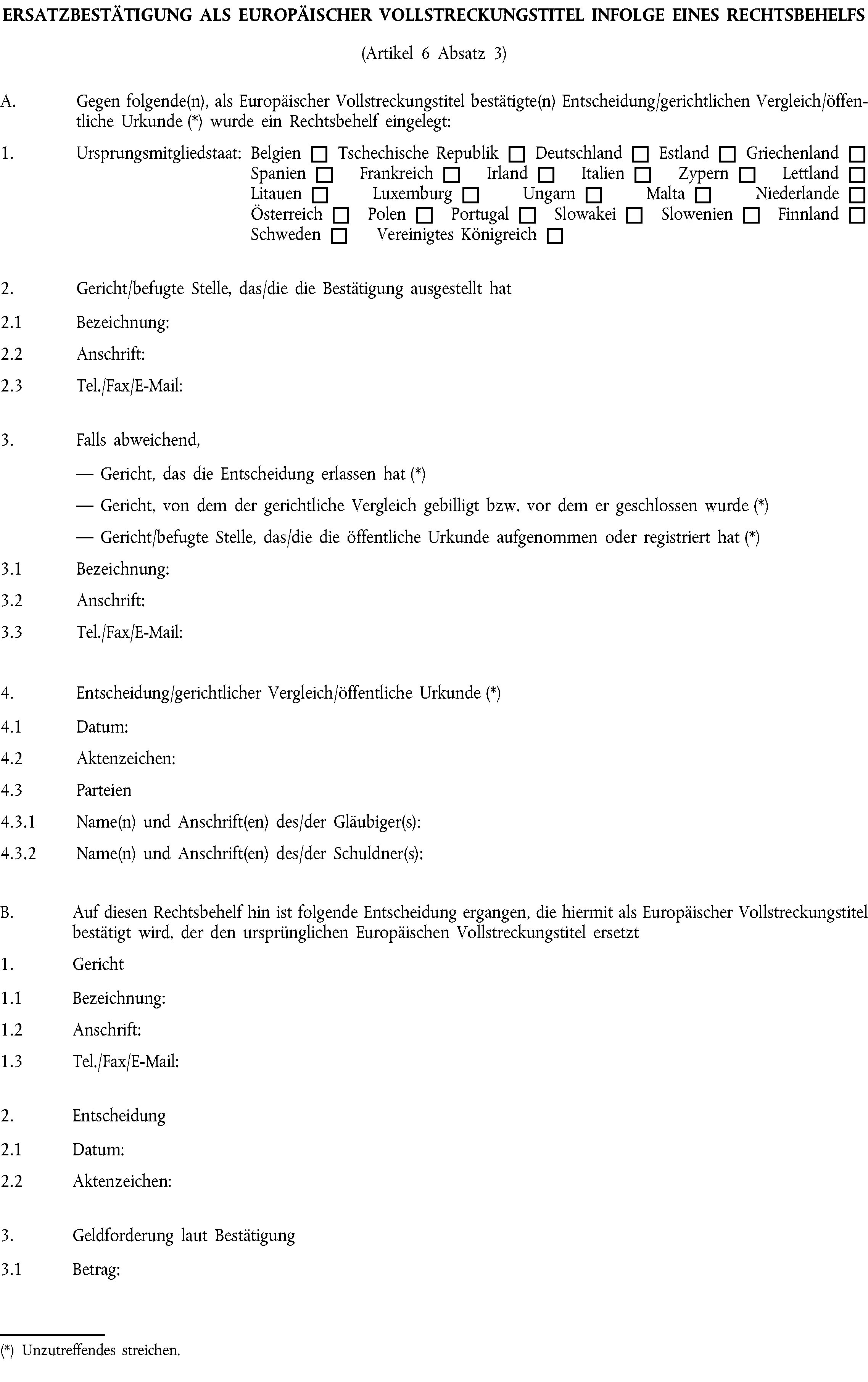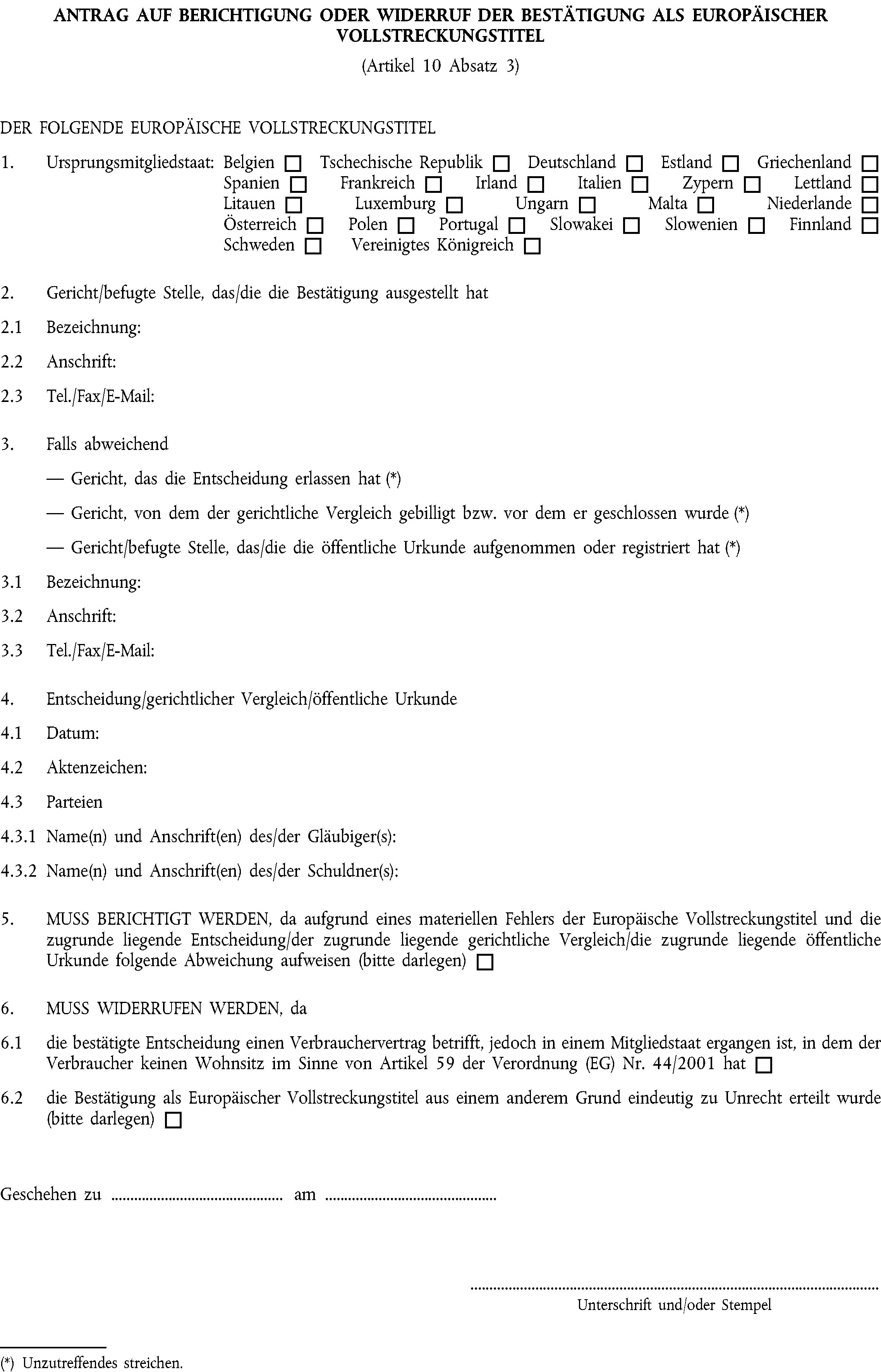 (3) Die Berichtigung oder der Widerruf der Bestätigung als Europäischer Vollstreckungstitel können unter Verwendung des Formblatts in Anhang VI beantragt werden.