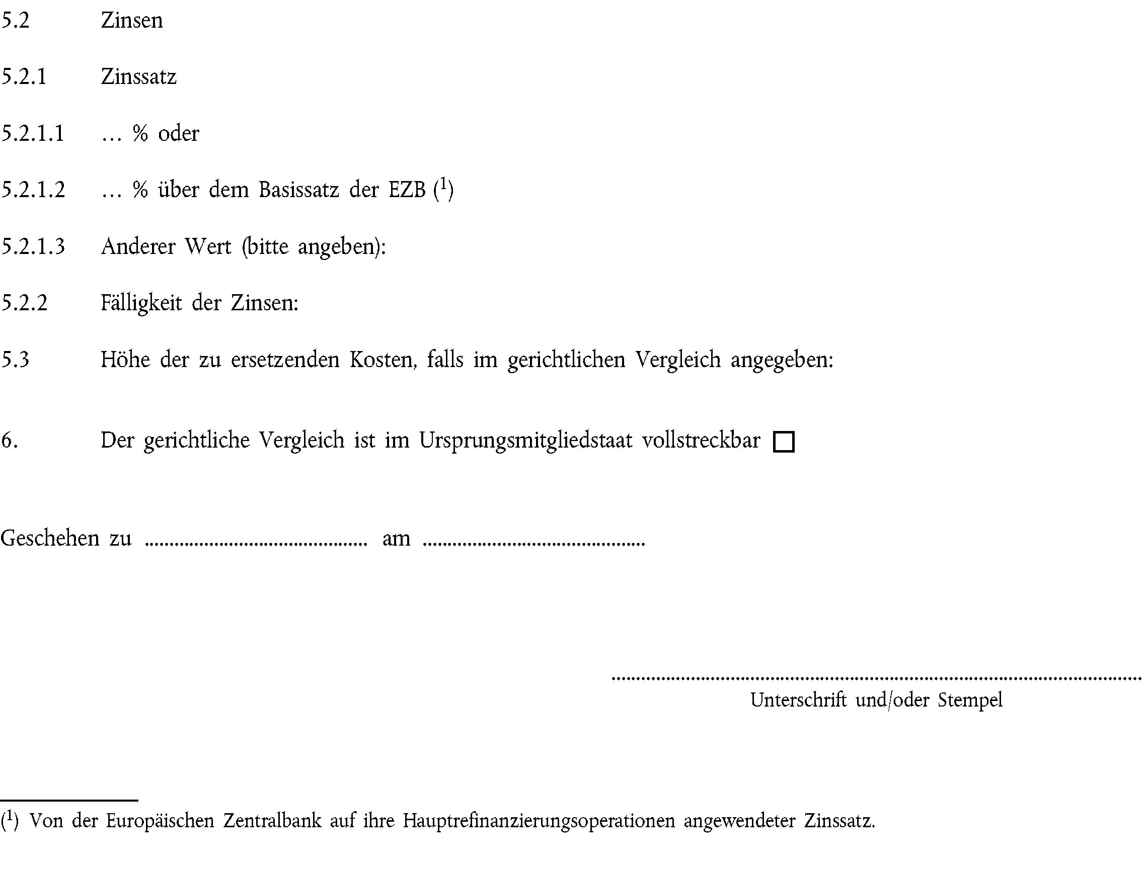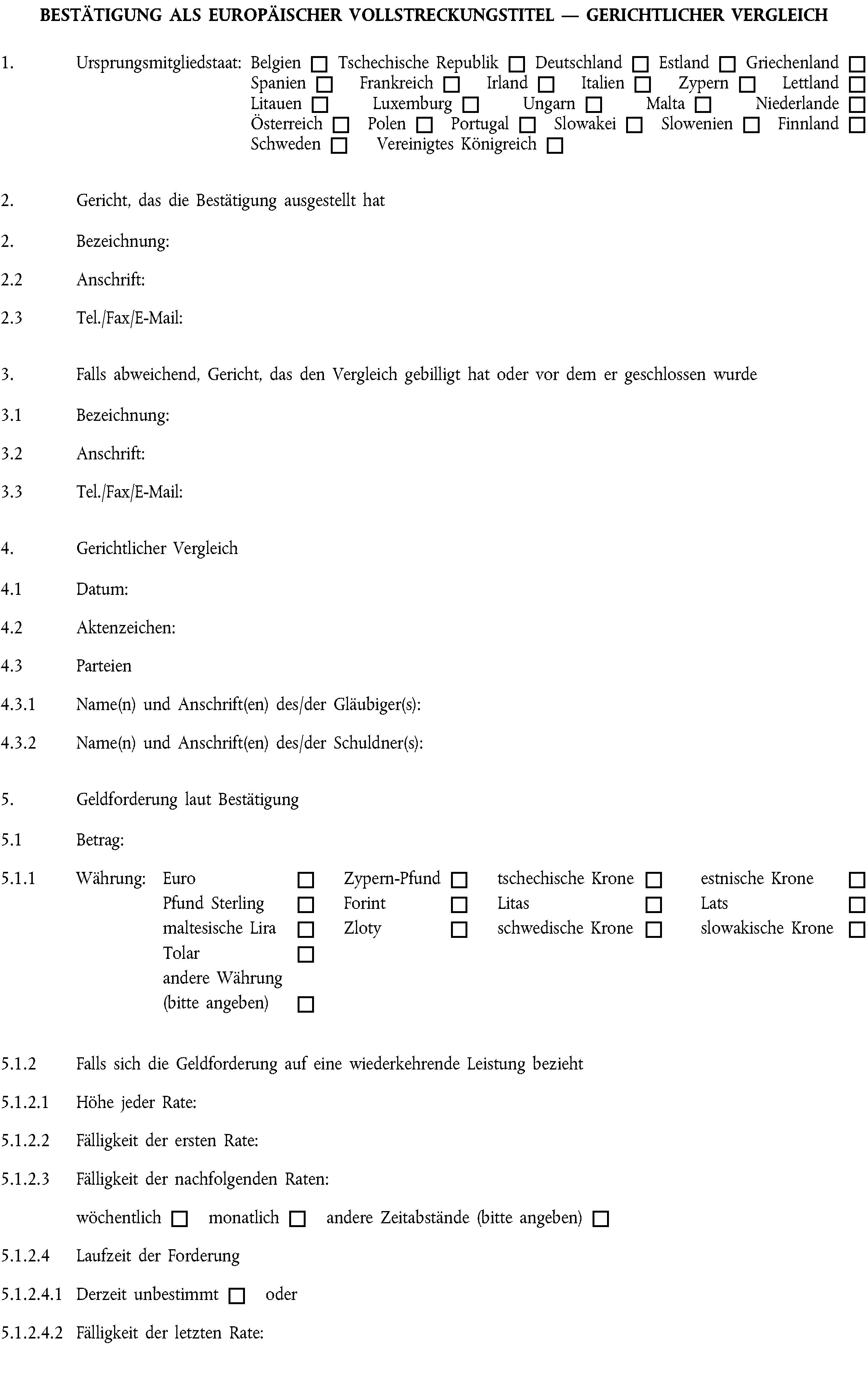 (1) Ein Vergleich über eine Forderung im Sinne von Artikel 4 Nummer 2, der von einem Gericht gebilligt oder vor einem Gericht im Laufe eines Verfahrens geschlossen wurde, und der in dem Mitgliedstaat, in dem er gebilligt oder geschlossen wurde, vollstreckbar ist, wird auf Antrag an das Gericht, das ihn gebilligt hat oder vor dem er geschlossen wurde, unter Verwendung des Formblatts in Anhang II als Europäischer Vollstreckungstitel bestätigt.