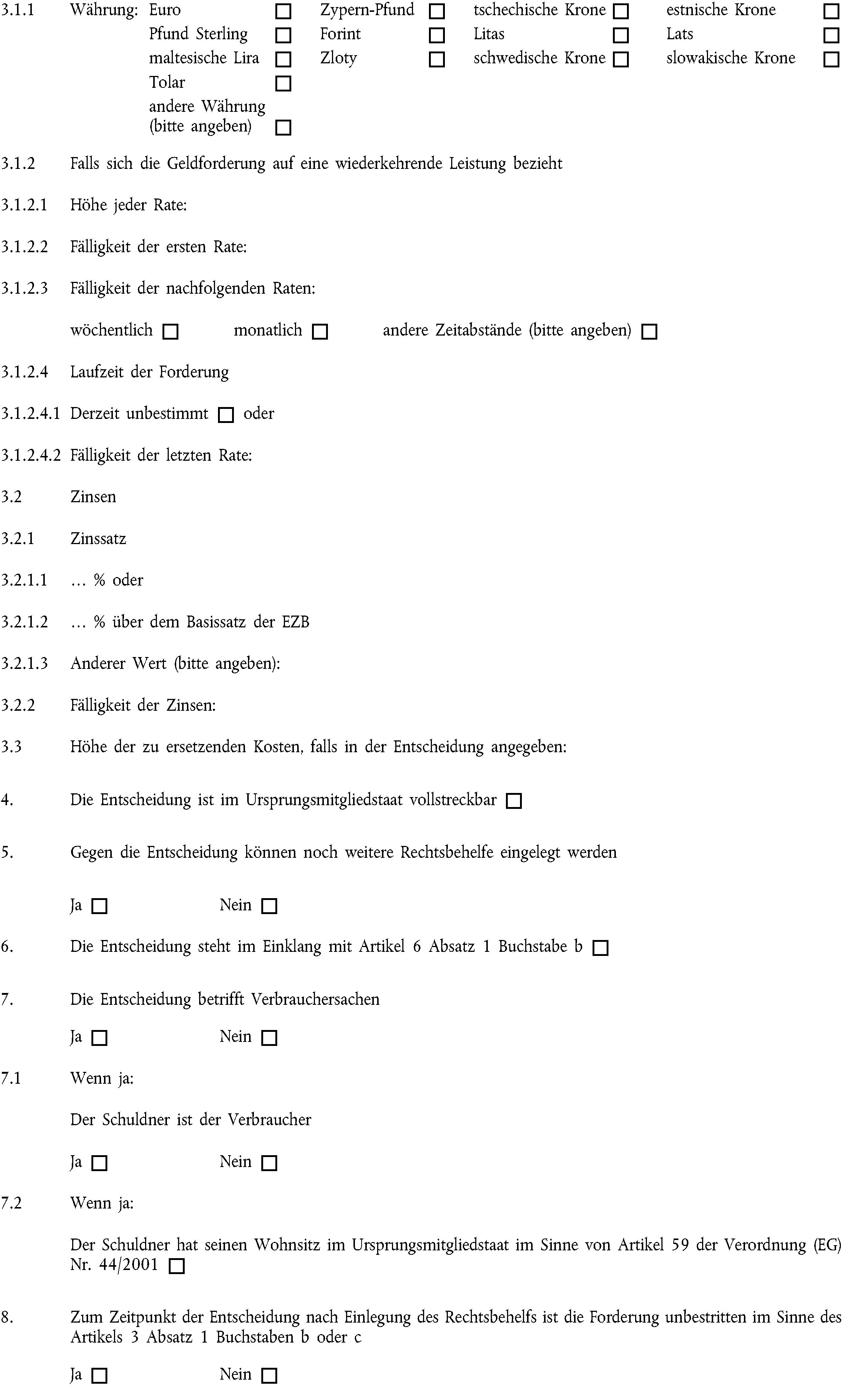 2.„Forderung“: eine Forderung auf Zahlung einer bestimmten Geldsumme, die fällig ist oder deren Fälligkeitsdatum in der Entscheidung, dem gerichtlichen Vergleich oder der öffentlichen Urkunde angegeben ist.