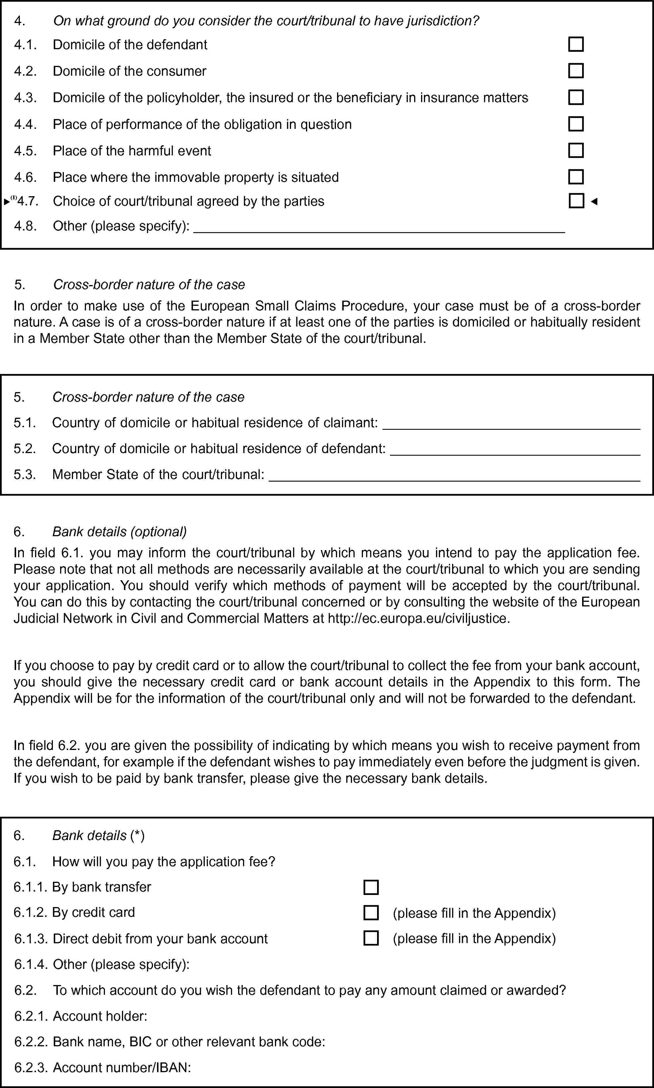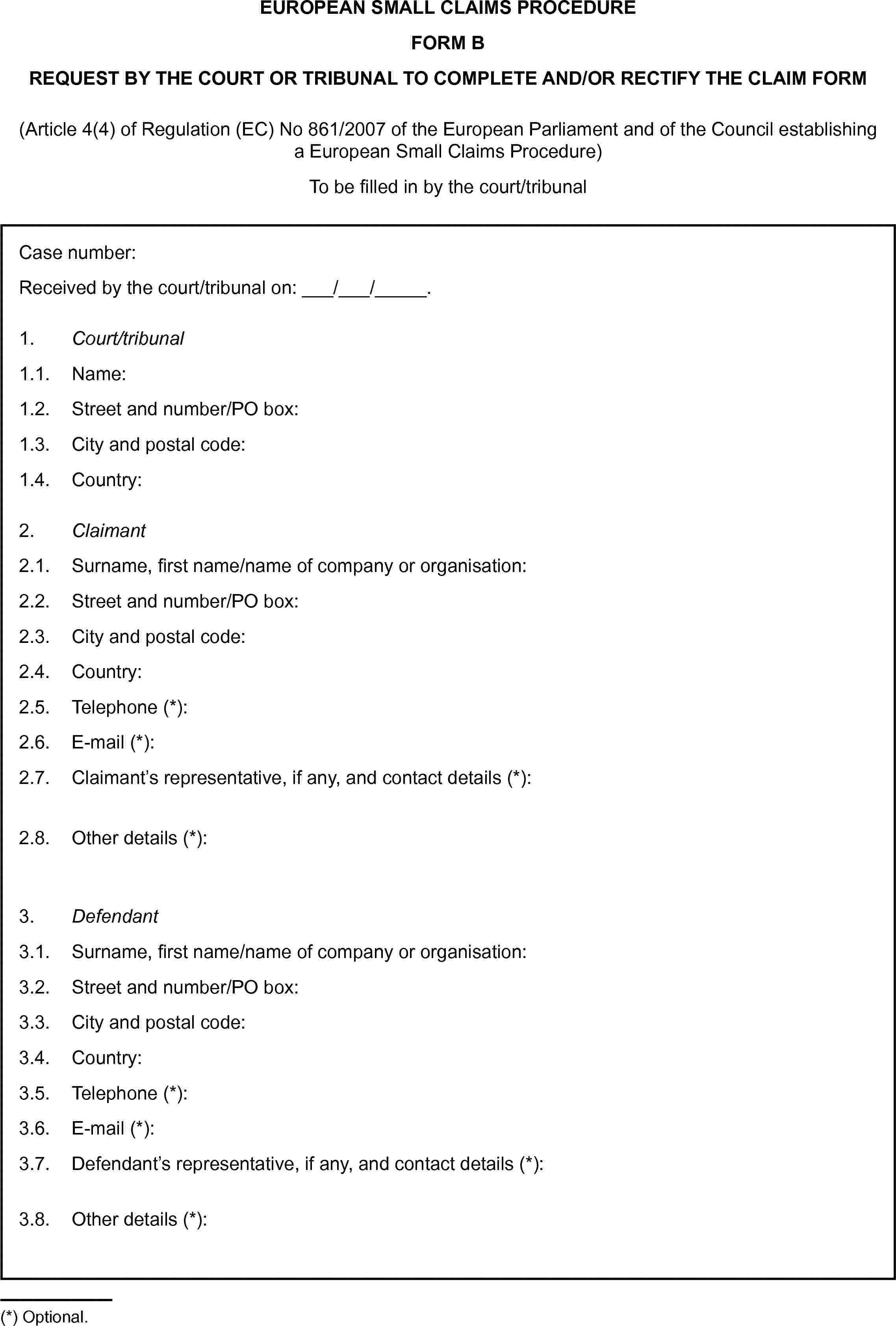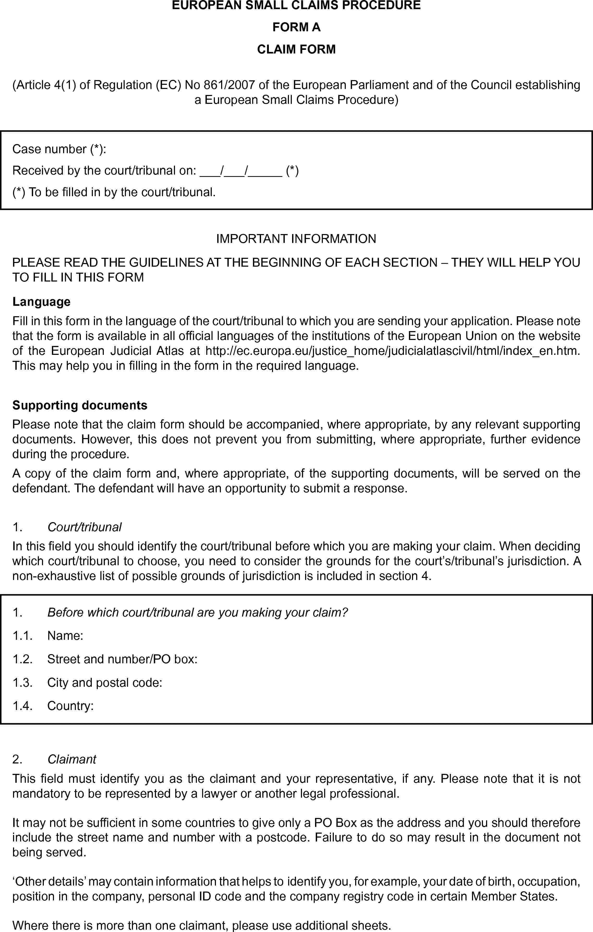 In order to facilitate the commencement of the European Small Claims Procedure, the claimant should make an application by filling in a standard claim form and lodging it with the court or tribunal. The claim form should be submitted only to a court or tribunal that has jurisdiction. |