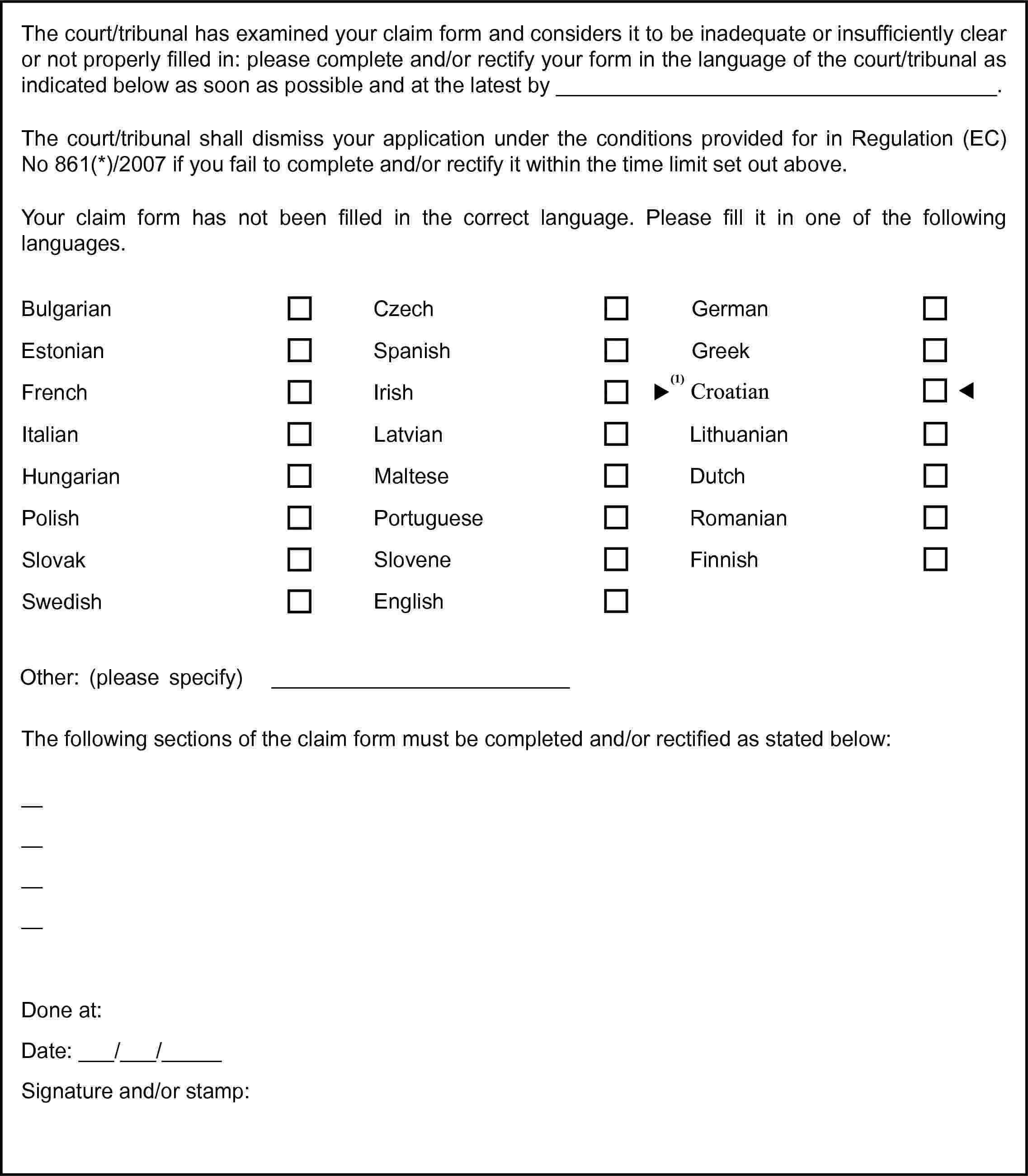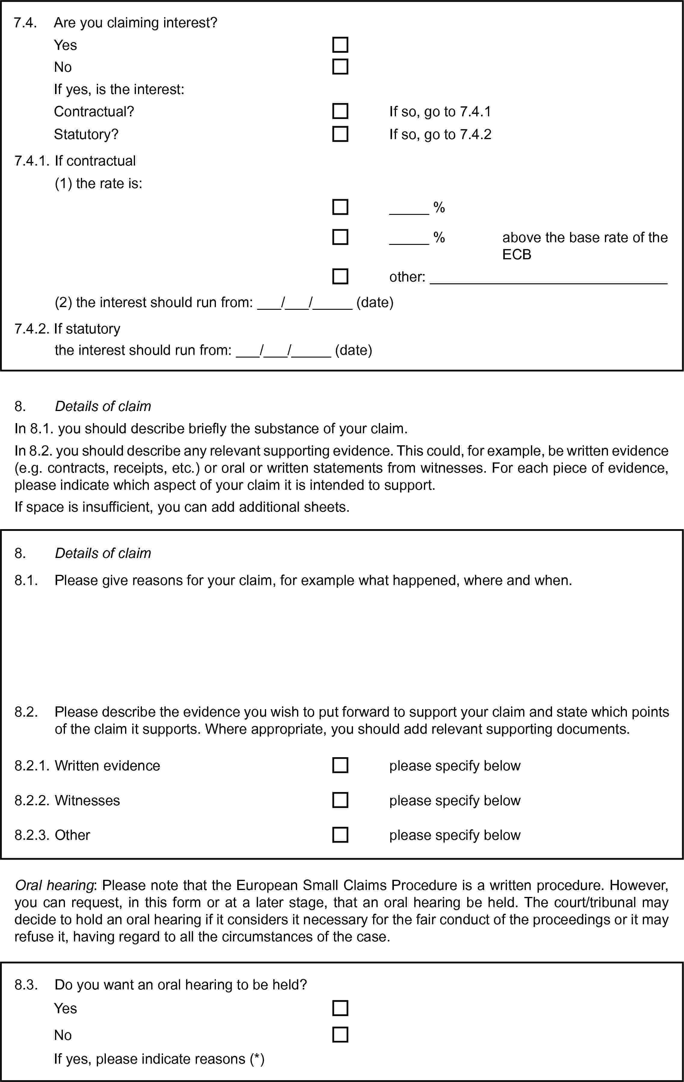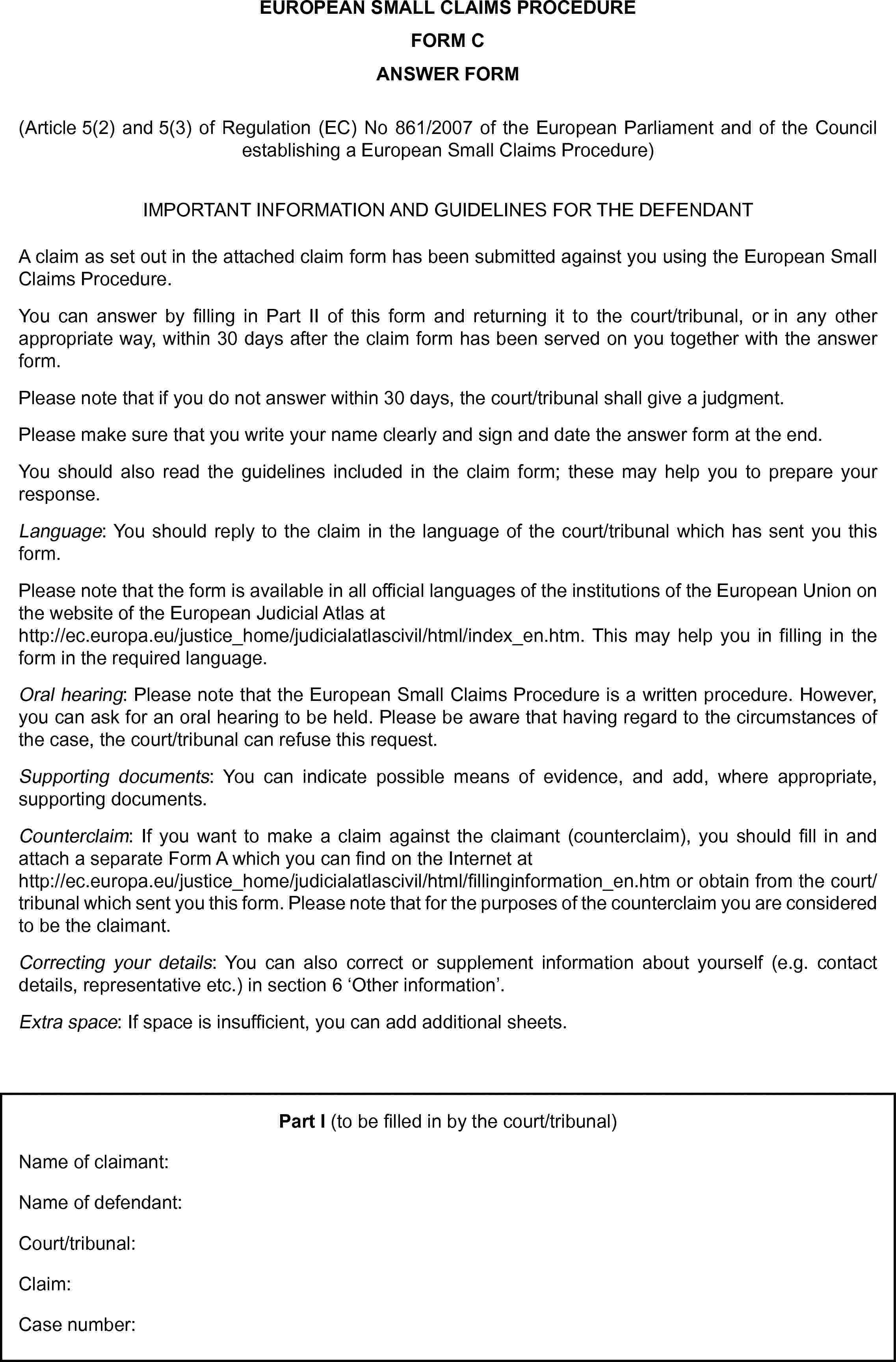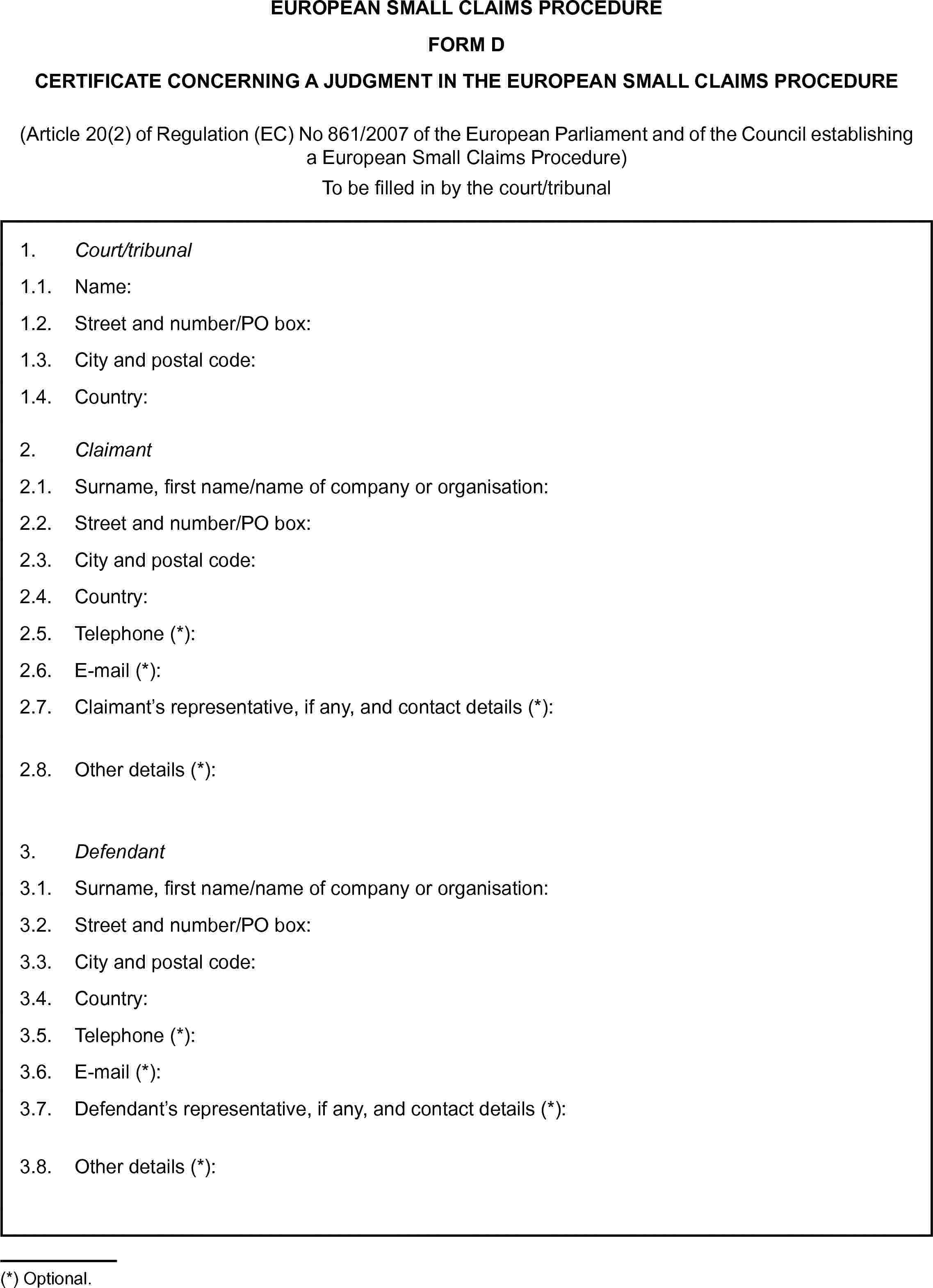In order to facilitate the commencement of the European Small Claims Procedure, the claimant should make an application by filling in a standard claim form and lodging it with the court or tribunal. The claim form should be submitted only to a court or tribunal that has jurisdiction. |