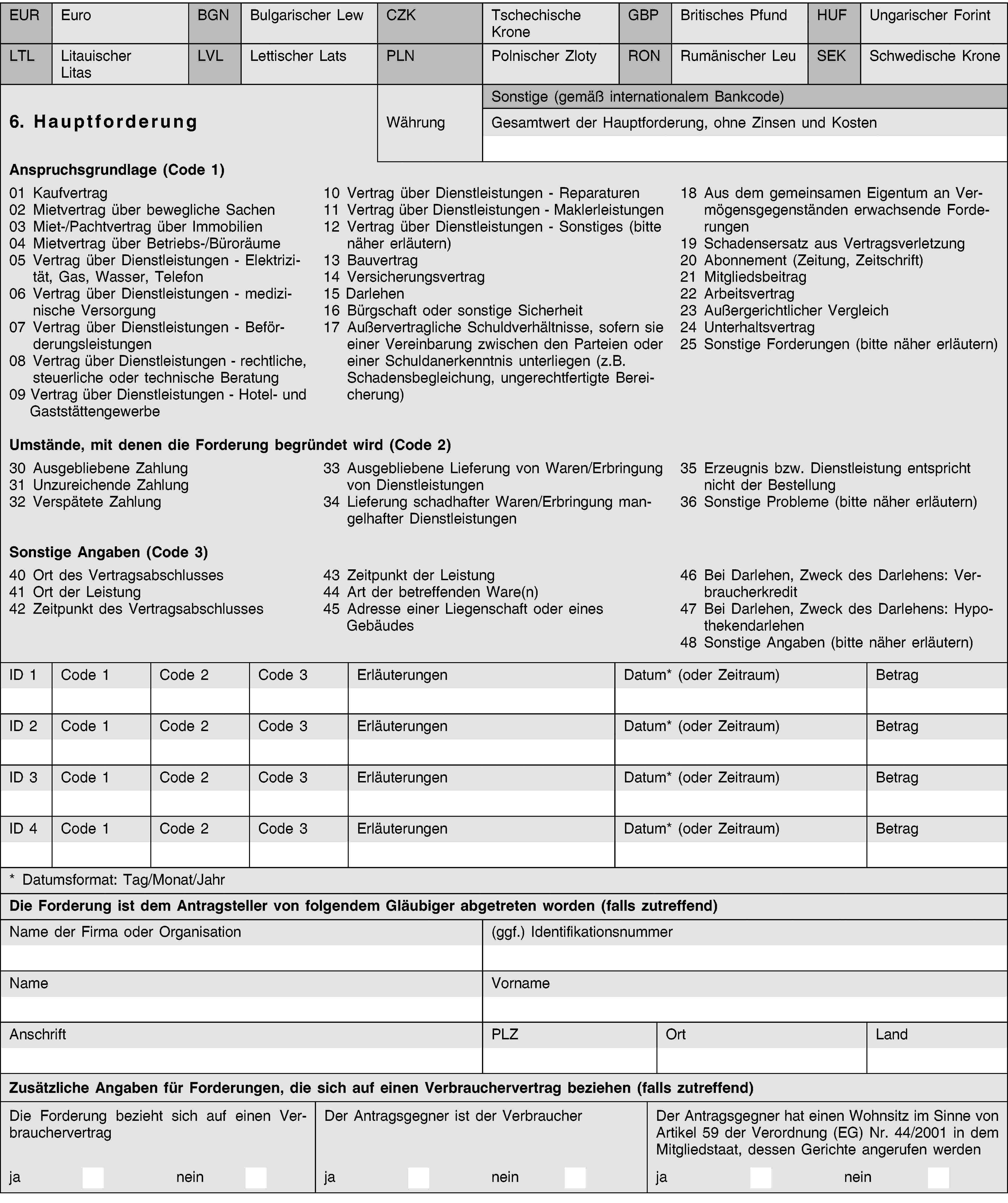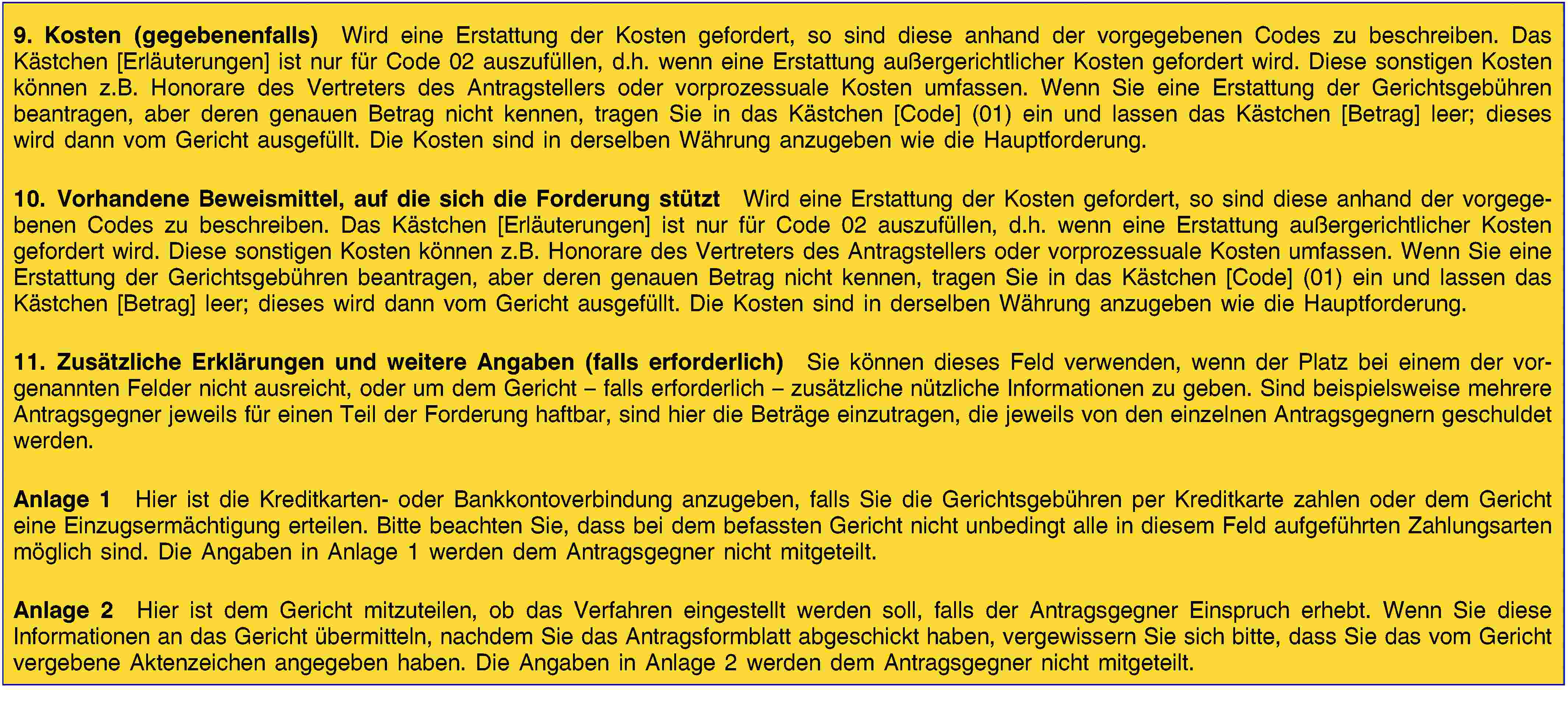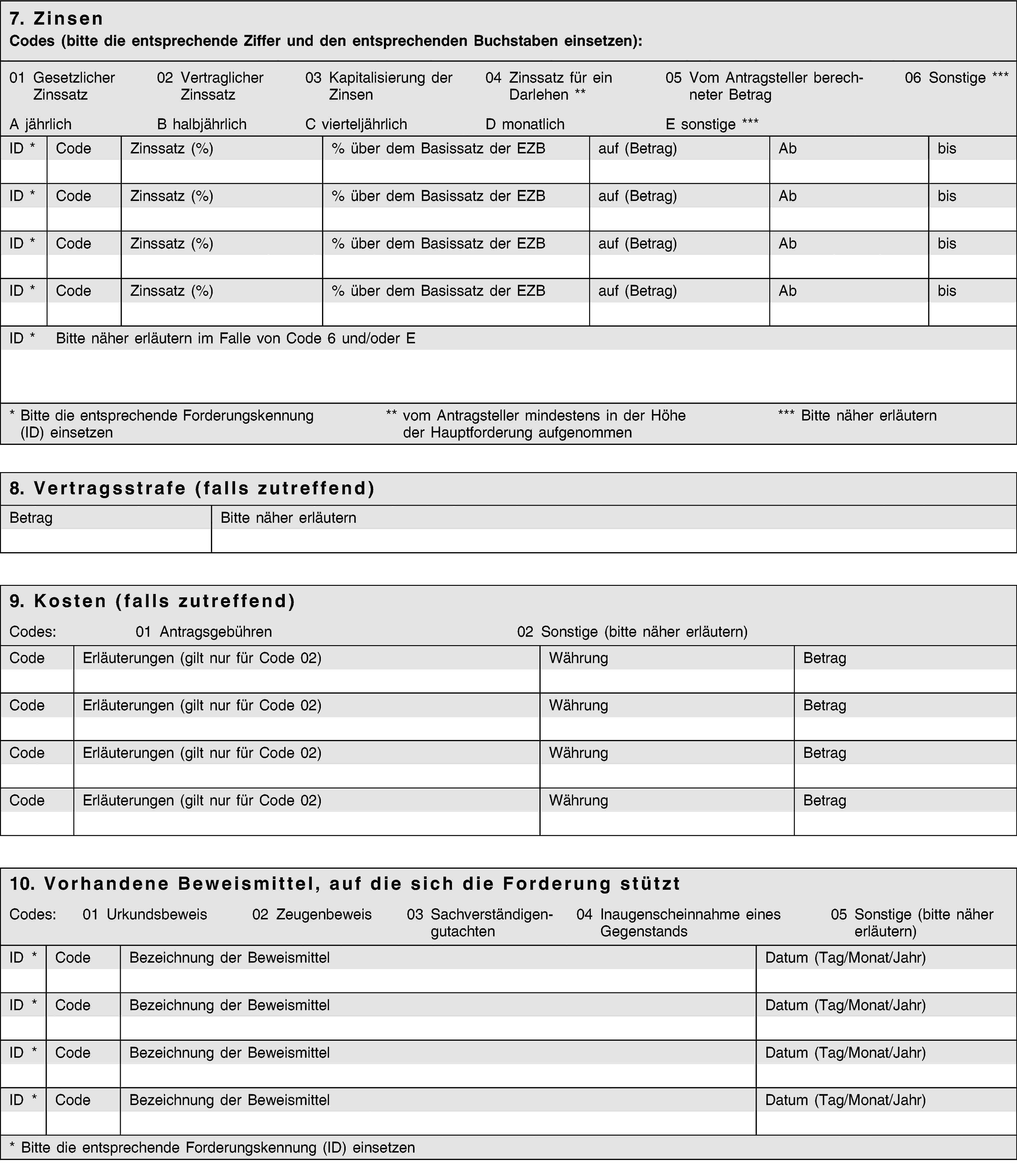 Dabei muss der Antragsteller auch eine Bezeichnung der Beweise, der zum Nachweis der Forderung herangezogen wird, beifügen. Zu diesem Zweck sollte in dem Antragsformular eine möglichst erschöpfende Liste der Arten von Beweisen enthalten sein, die üblicherweise zur Geltendmachung von Geldforderungen angeboten werden. |