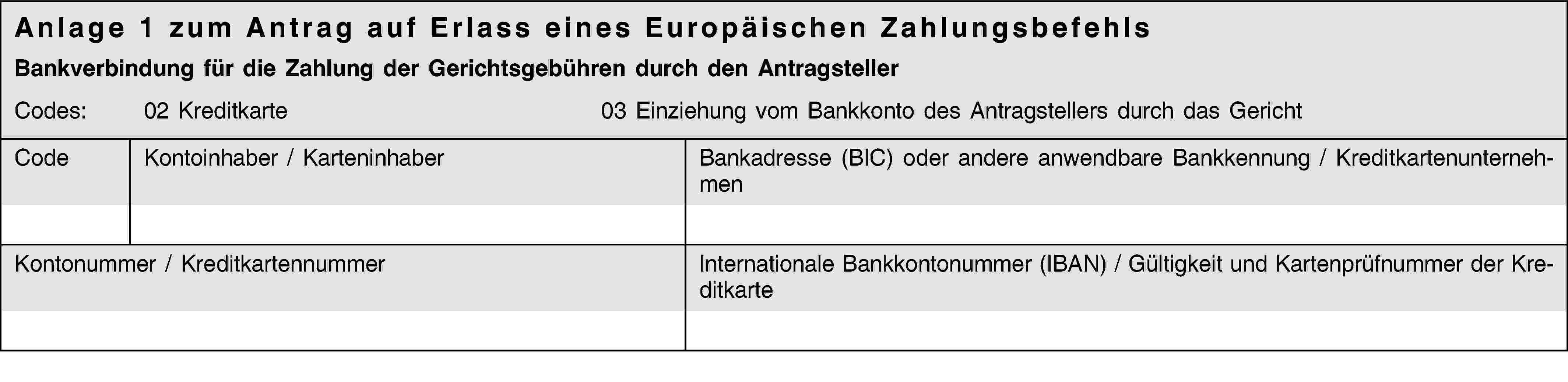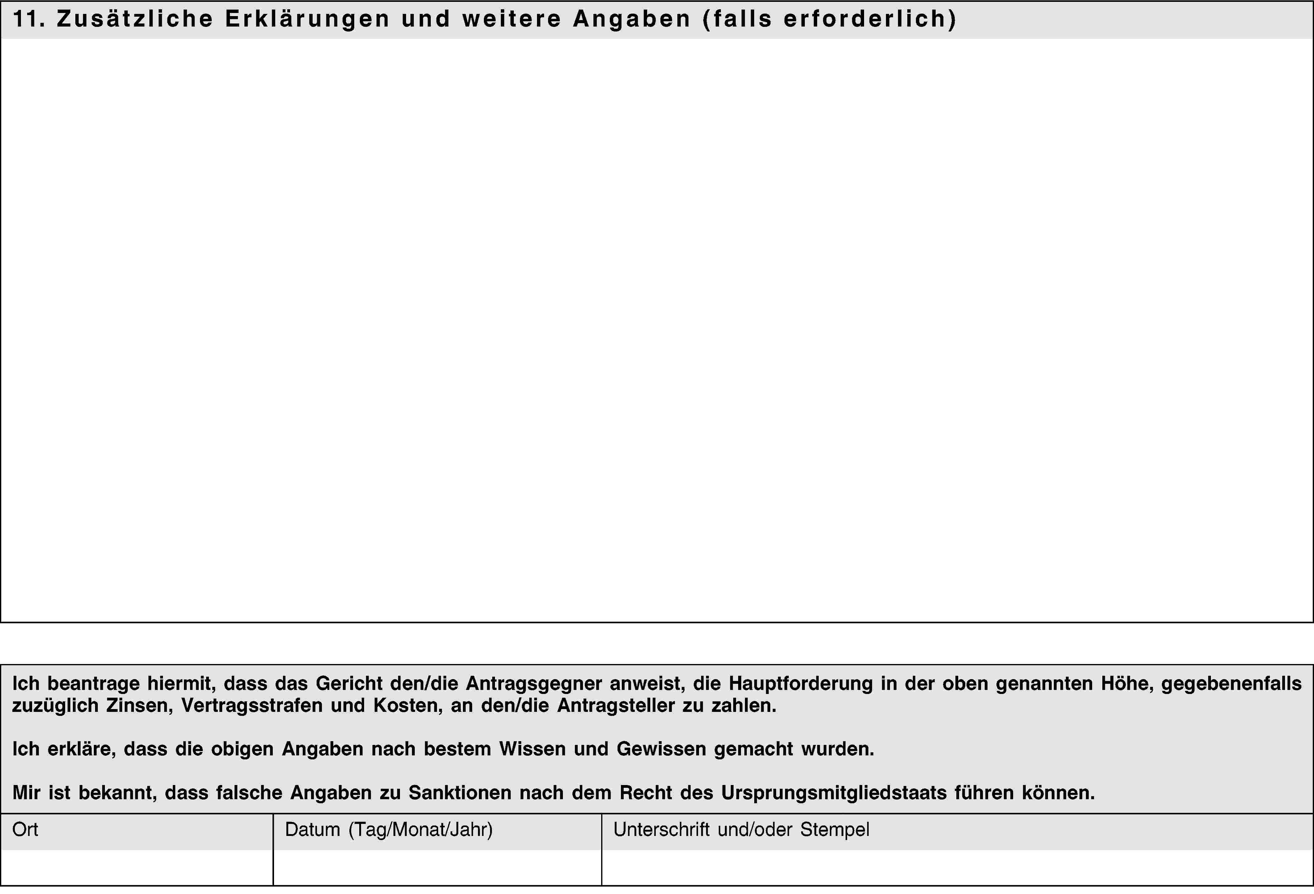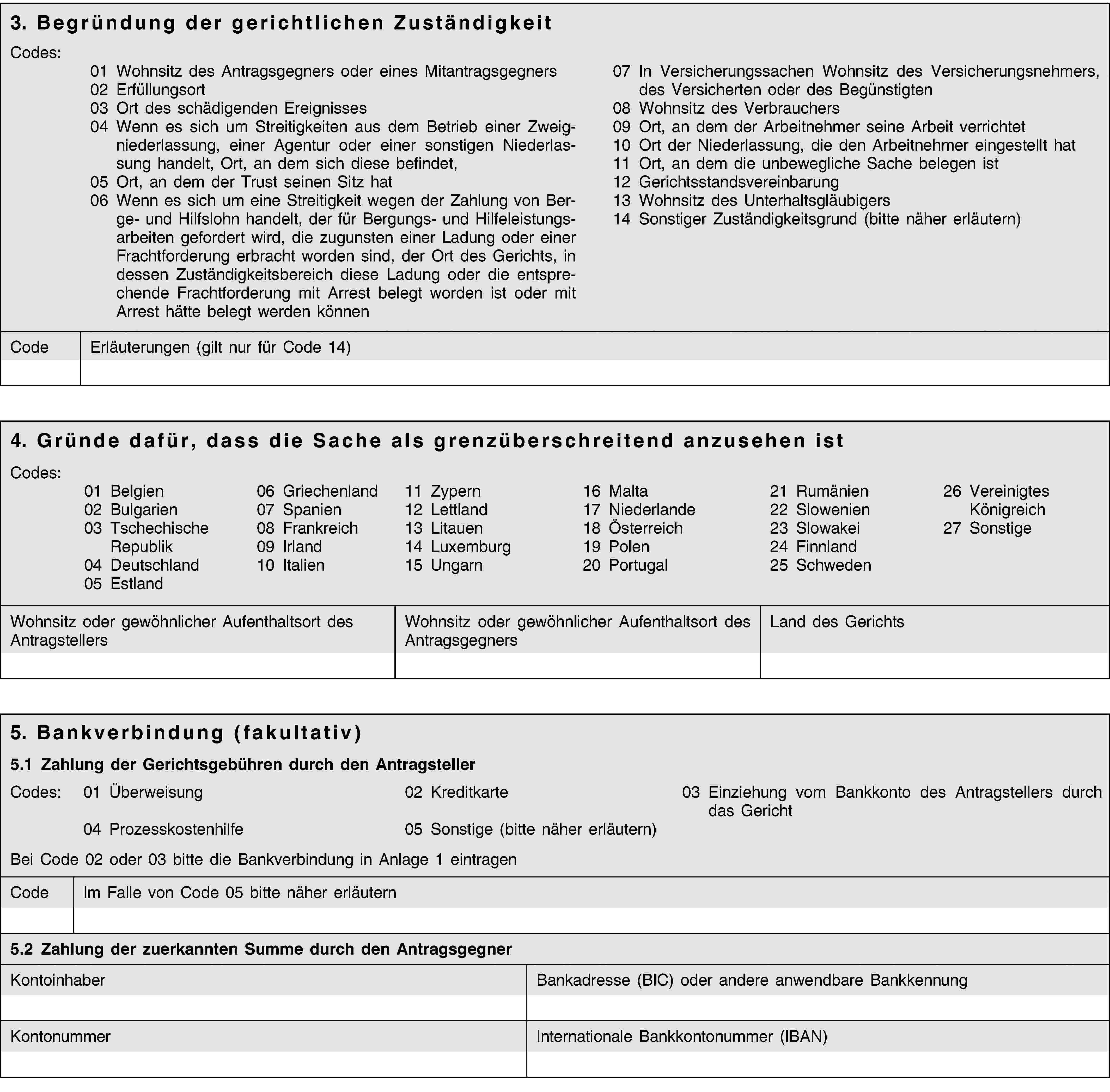 Dabei muss der Antragsteller auch eine Bezeichnung der Beweise, der zum Nachweis der Forderung herangezogen wird, beifügen. Zu diesem Zweck sollte in dem Antragsformular eine möglichst erschöpfende Liste der Arten von Beweisen enthalten sein, die üblicherweise zur Geltendmachung von Geldforderungen angeboten werden. |
