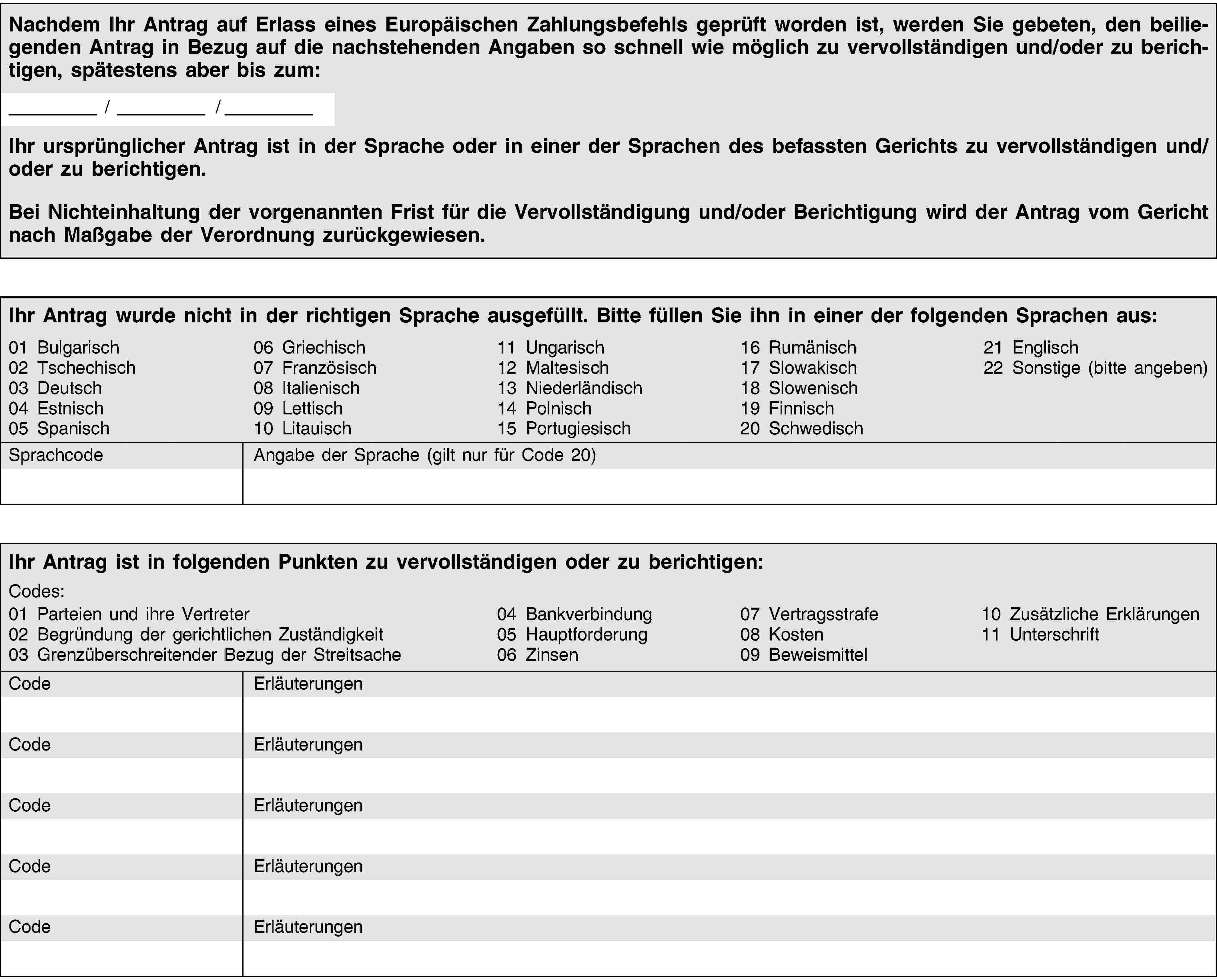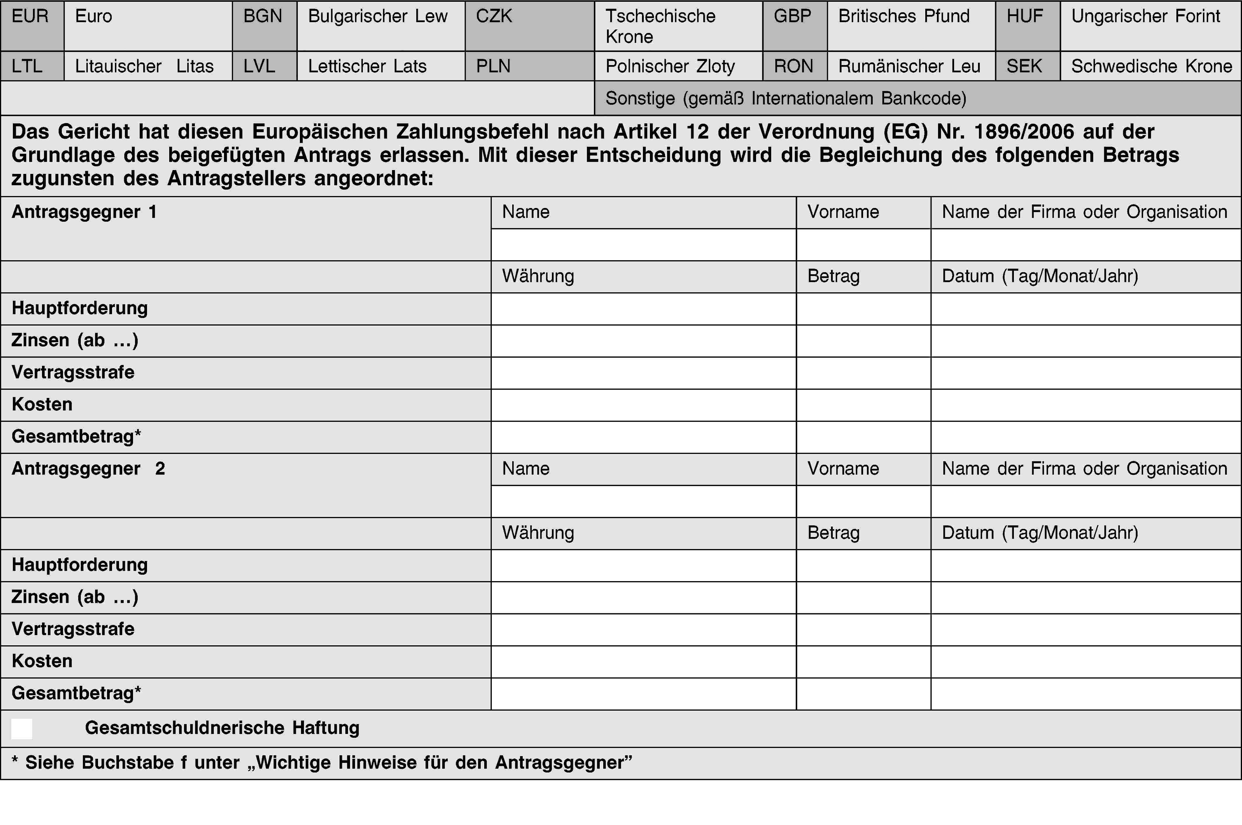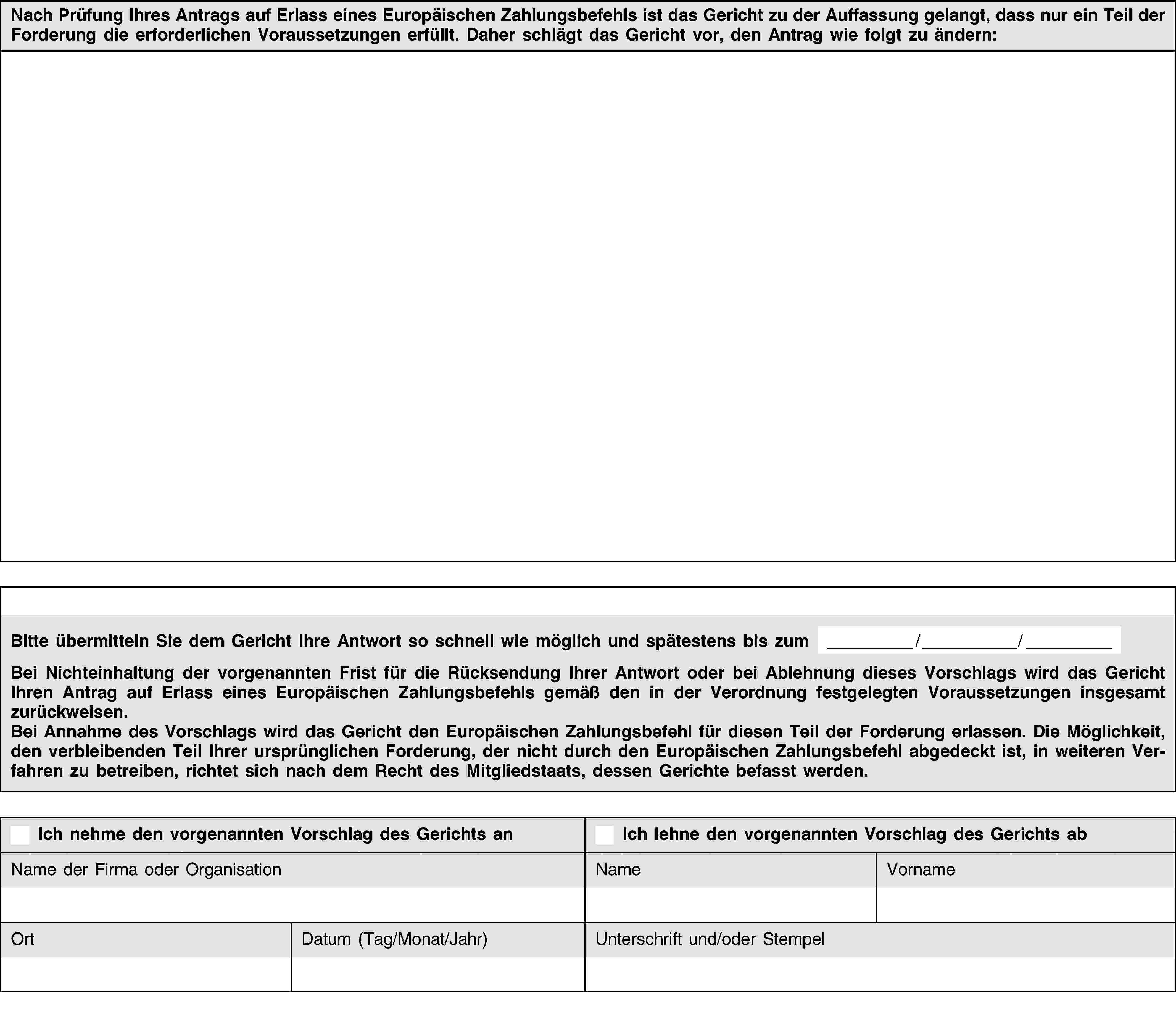 Der Antragsgegner kann seinen Einspruch unter Verwendung des in dieser Verordnung enthaltenen Formblatts einreichen. Die Gerichte sollten allerdings auch einen in anderer Form eingereichten schriftlichen Einspruch berücksichtigen, sofern dieser klar erklärt ist. |