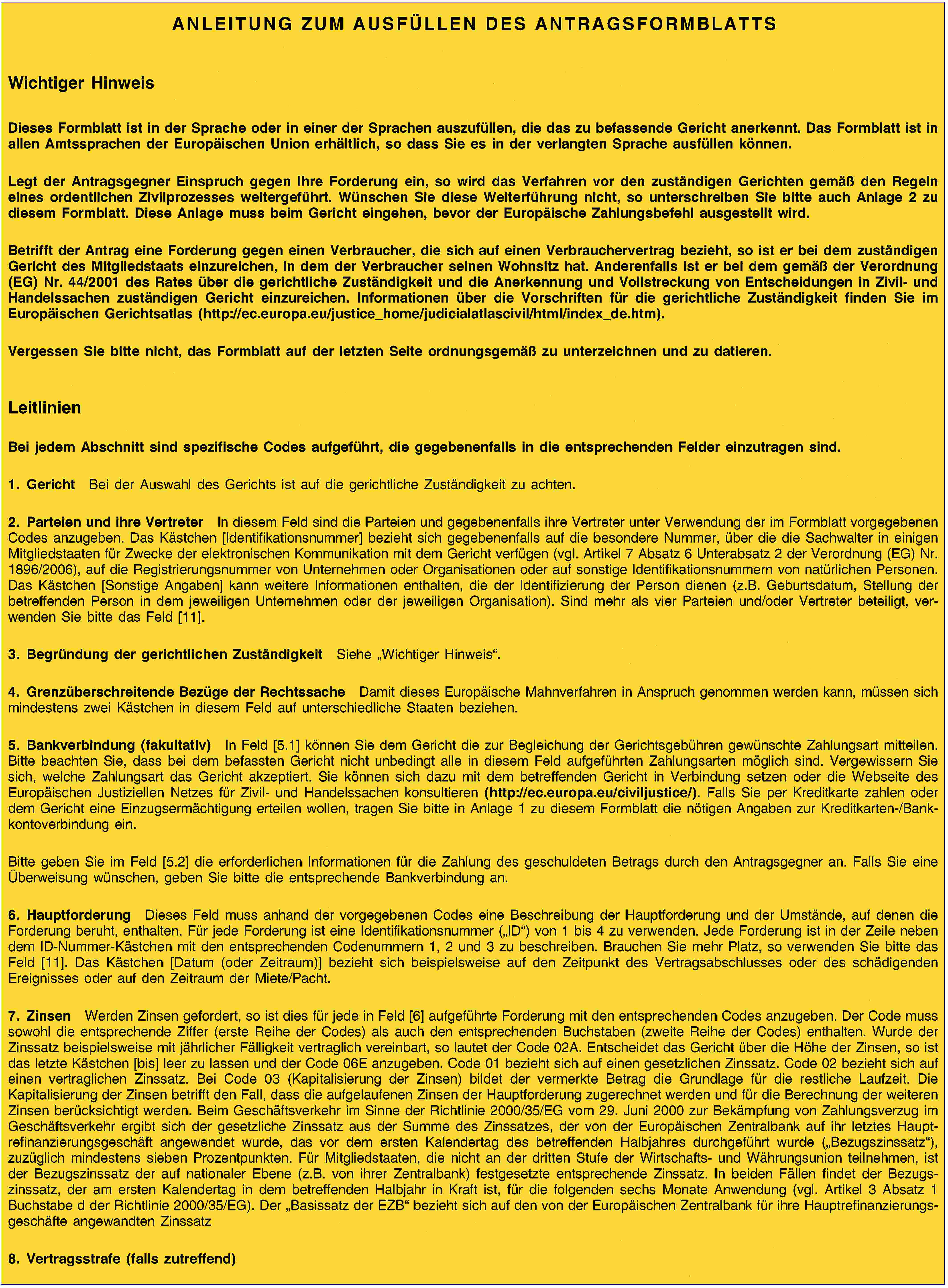 Der Europäische Zahlungsbefehl sollte den Antragsgegner darüber aufklären, dass er entweder den zuerkannten Betrag an den Antragsteller zu zahlen hat oder, wenn er die Forderung bestreiten will, innerhalb von 30 Tagen eine Einspruchsschrift versenden muss. Neben der vollen Aufklärung über die vom Antragsteller geltend gemachte Forderung sollte der Antragsgegner auf die rechtliche Bedeutung des Europäischen Zahlungsbefehls und die Folgen eines Verzichts auf Einspruch hingewiesen werden. |