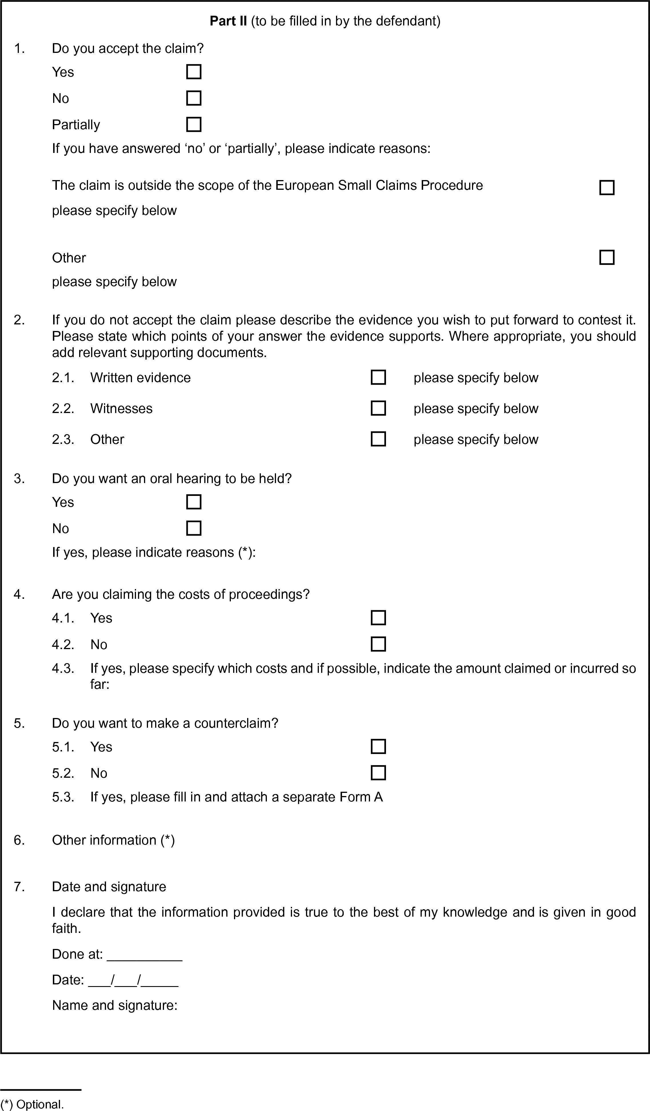 3. The defendant shall submit his response within 30 days of service of the claim form and answer form, by filling in Part II of standard answer Form C, accompanied, where appropriate, by any relevant supporting documents, and returning it to the court or tribunal, or in any other appropriate way not using the answer form.