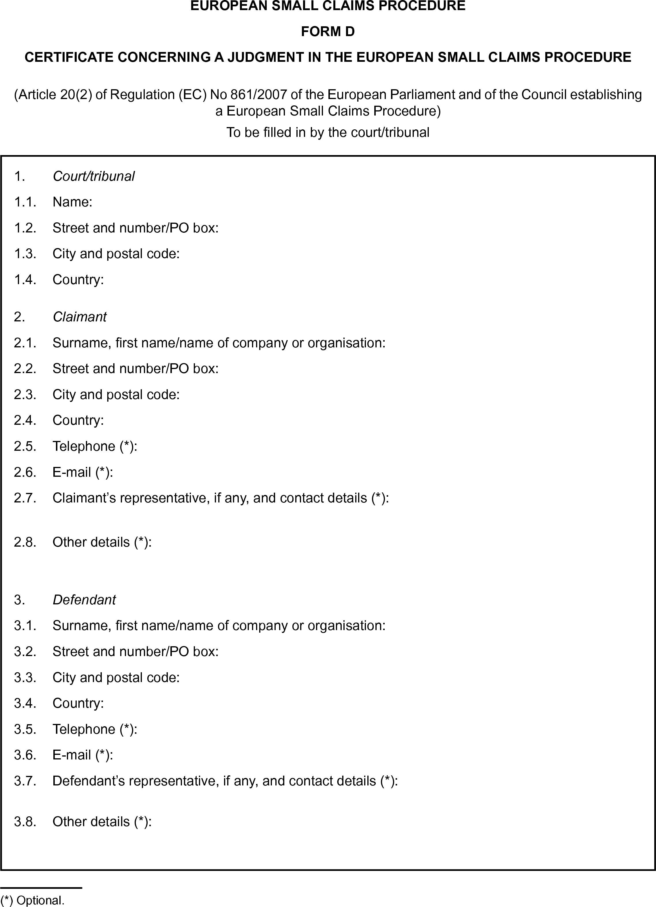 2. At the request of one of the parties, the court or tribunal shall issue a certificate concerning a judgment in the European Small Claims Procedure using standard Form D, as set out in Annex IV, at no extra cost.