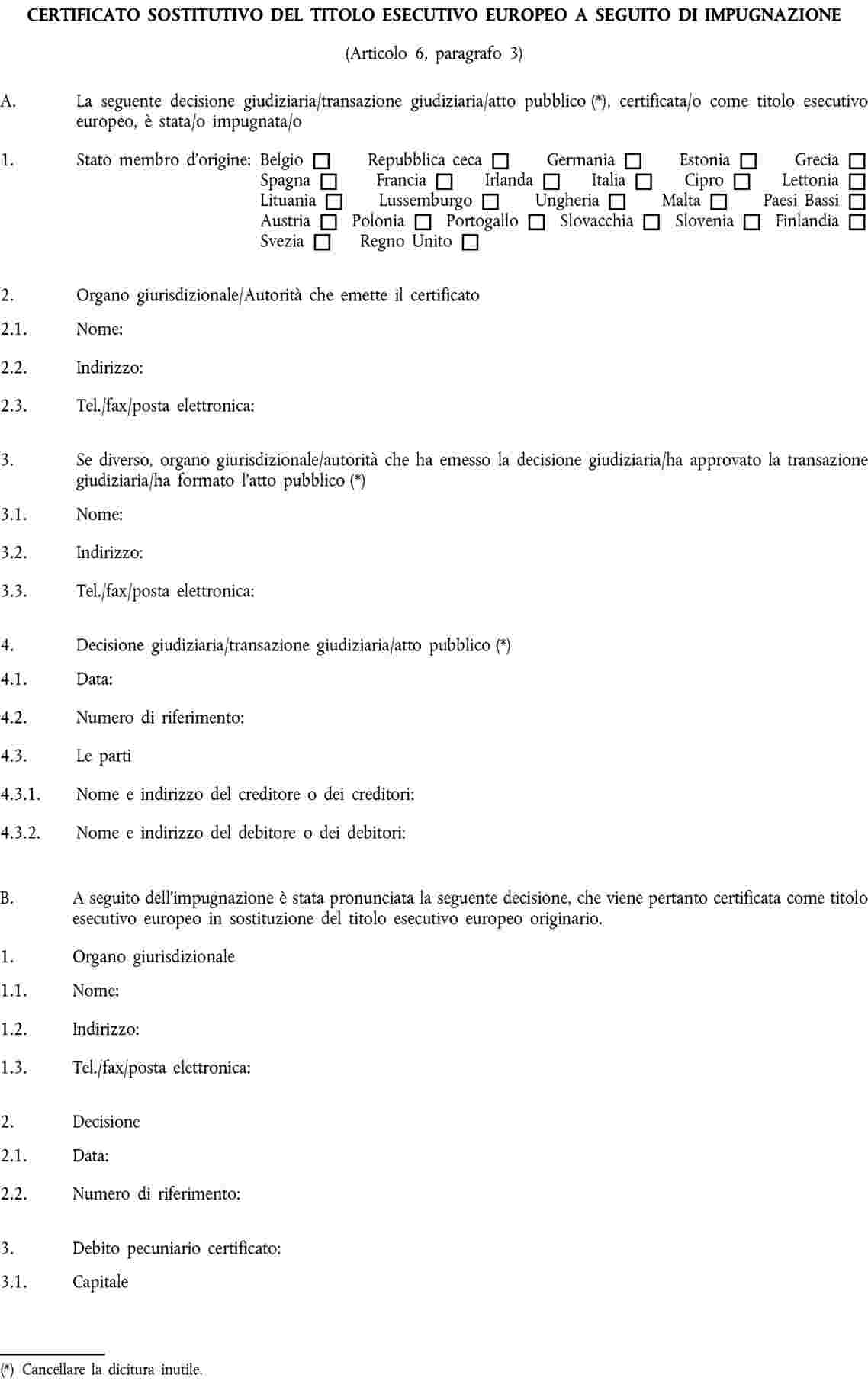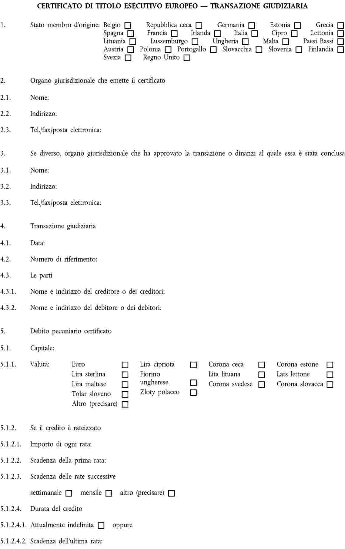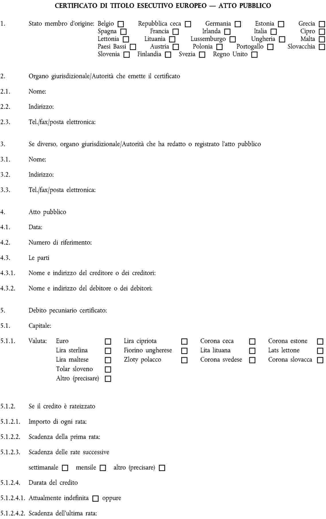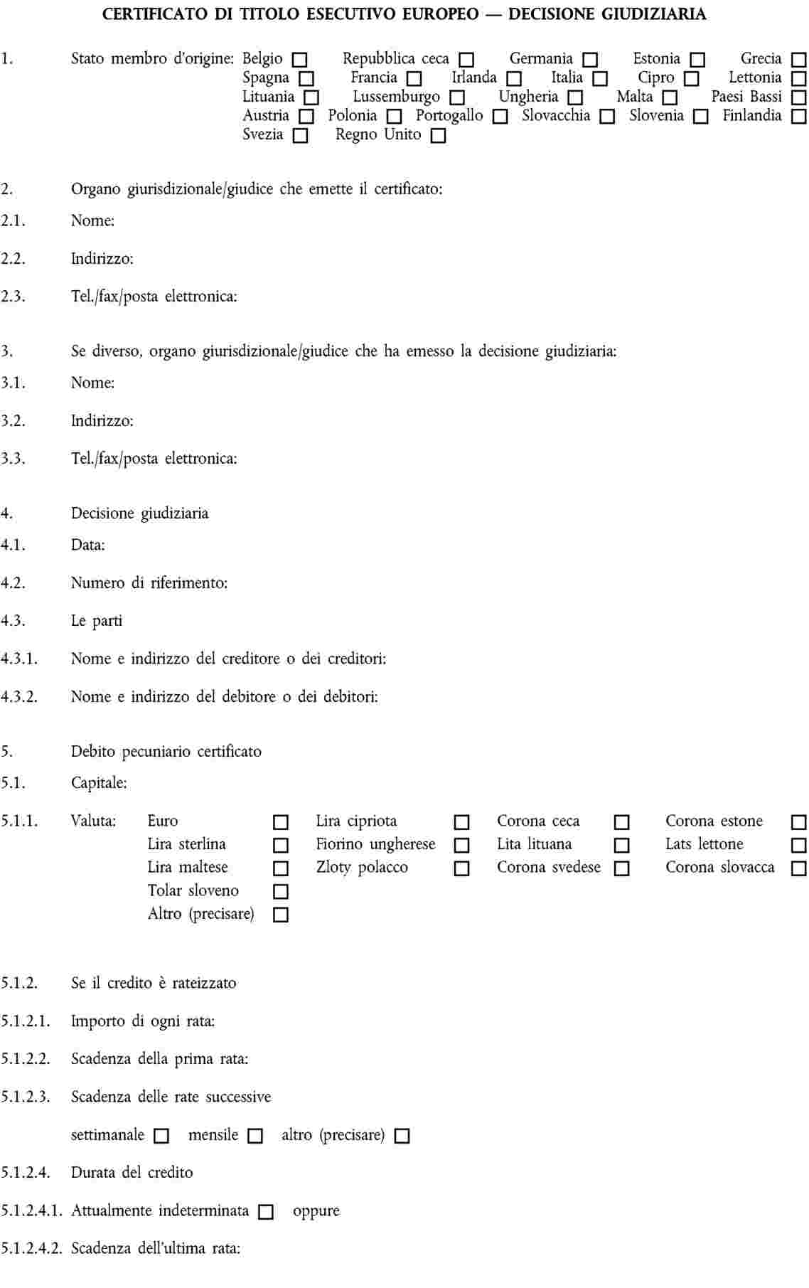 Gli allegati da I a VI del regolamento (CE) n. 805/2004 contengono una serie di modelli di certificato da utilizzare nell'ambito della procedura del titolo esecutivo europeo per i crediti non contestati. |
