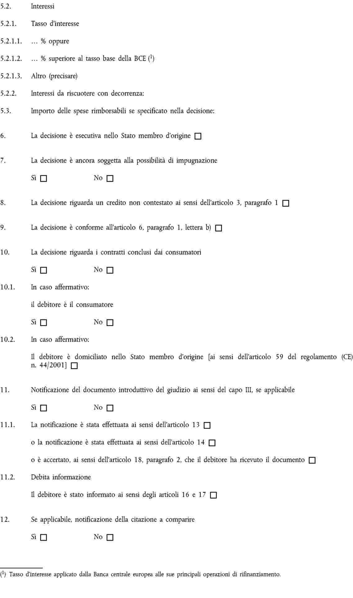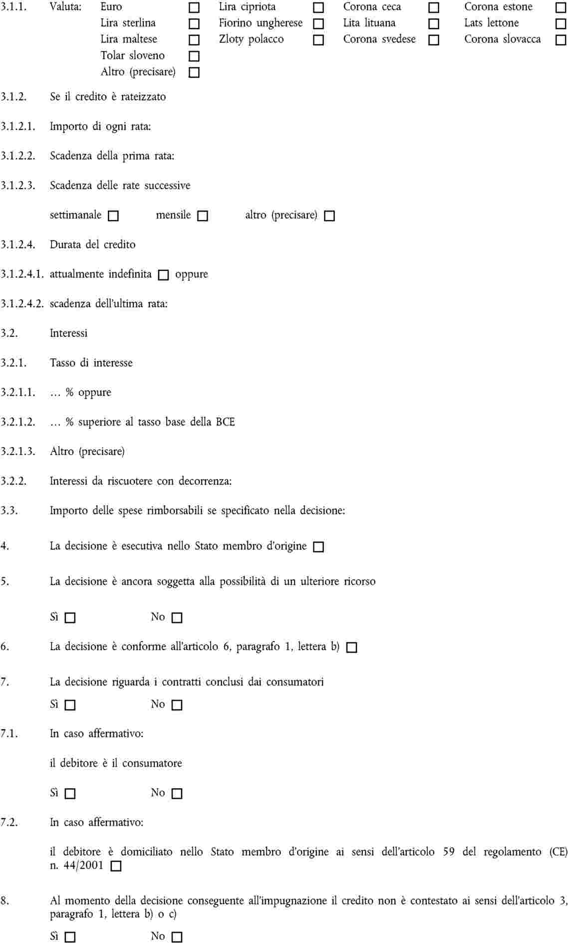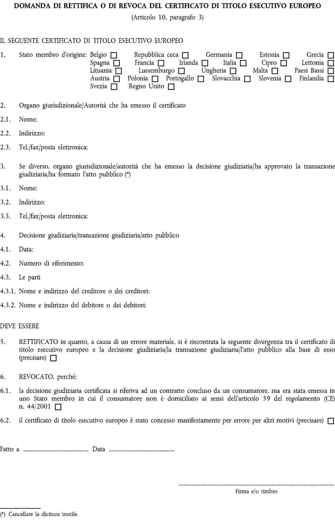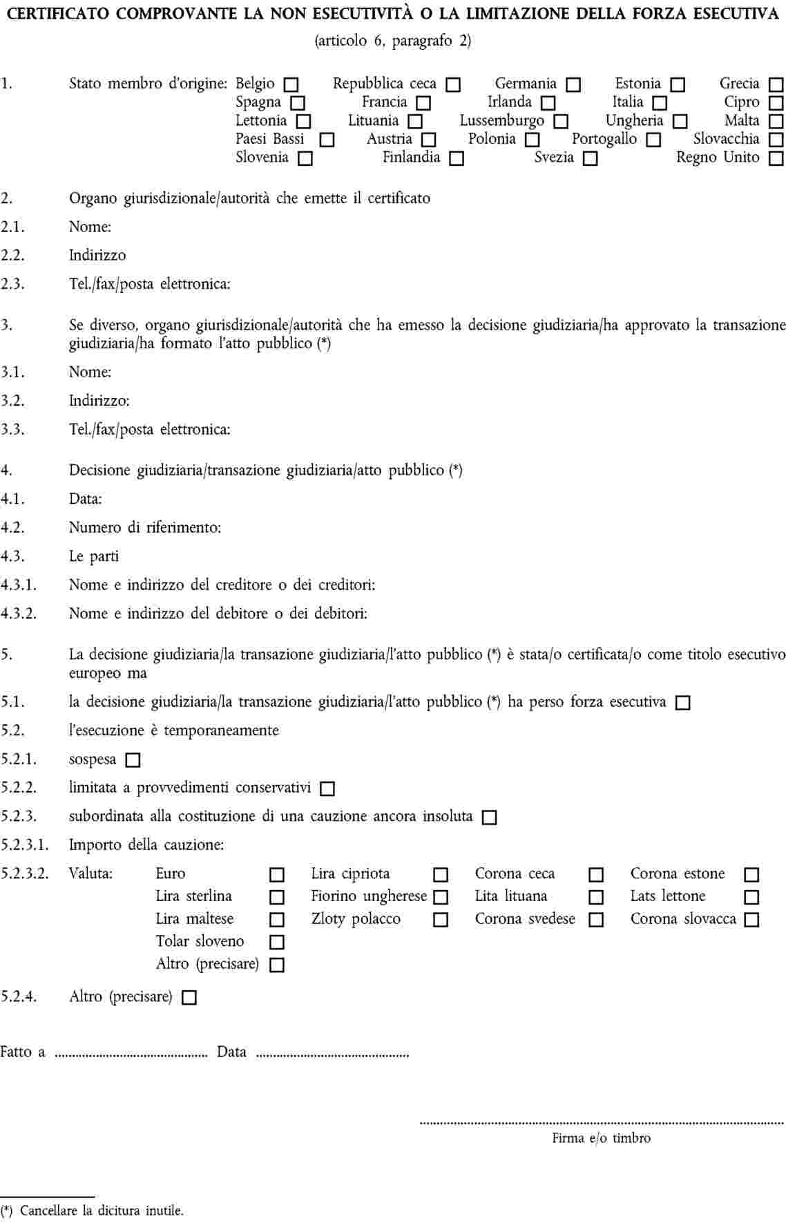 Gli allegati da I a VI del regolamento (CE) n. 805/2004 contengono una serie di modelli di certificato da utilizzare nell'ambito della procedura del titolo esecutivo europeo per i crediti non contestati. |